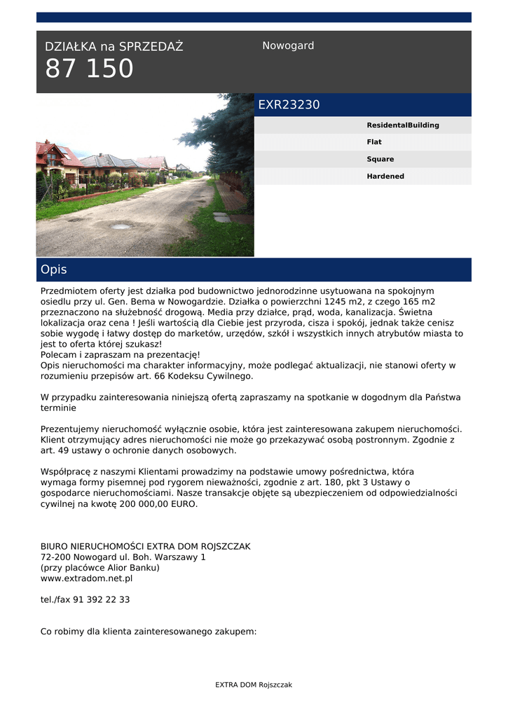 Nowogard DZIAŁKA na SPRZEDAŻ 87 150 EXR23230 ResidentalBuilding Flat Square Hardened Opis Przedmiotem oferty jest działka pod budownictwo jednorodzinne usytuowana na spokojnym osiedlu przy ul. Gen. Bema w Nowogardzie. Działka o powierzchni 1245 m2, z czego 165 m2 przeznaczono na służebność drogową. Media przy działce, prąd, woda, kanalizacja. Świetna lokalizacja oraz cena ! Jeśli wartością dla Ciebie jest przyroda, cisza i spokój, jednak także cenisz sobie wygodę i łatwy dostęp do marketów, urzędów, szkół i wszystkich innych atrybutów miasta to jest to oferta której szukasz! Polecam i zapraszam na prezentację! Opis nieruchomości ma charakter informacyjny, może podlegać aktualizacji, nie stanowi oferty w rozumieniu przepisów art. 66 Kodeksu Cywilnego. W przypadku zainteresowania niniejszą ofertą zapraszamy na spotkanie w dogodnym dla Państwa terminie Prezentujemy nieruchomość wyłącznie osobie, która jest zainteresowana zakupem nieruchomości. Klient otrzymujący adres nieruchomości nie może go przekazywać osobą postronnym. Zgodnie z art. 49 ustawy o ochronie danych osobowych. Współpracę z naszymi Klientami prowadzimy na podstawie umowy pośrednictwa, która wymaga formy pisemnej pod rygorem nieważności, zgodnie z art. 180, pkt 3 Ustawy o gospodarce nieruchomościami. Nasze transakcje objęte są ubezpieczeniem od odpowiedzialności cywilnej na kwotę 200 000,00 EURO. BIURO NIERUCHOMOŚCI EXTRA DOM ROJSZCZAK 72-200 Nowogard ul. Boh. Warszawy 1 (przy placówce Alior Banku) www.extradom.net.pl tel./fax 91 392 22 33 Co robimy dla klienta zainteresowanego zakupem: EXTRA DOM Rojszczak * Sprawdzamy zdolność kredytową * Wyszukujemy odpowiednią nieruchomość, * Pomagamy w prowadzeniu negocjacji, * Pomagamy w uzyskaniu potrzebnych dokumentów * Pomagamy w uzyskaniu kredytu hipotecznego * Współpracujemy z kancelariami notarialnymi, geodetami Korzystając z naszych usług oszczędzasz swój czas, a także zyskujesz pewność, że Twoja transakcja zostanie przeprowadzona z należytą starannością, w sposób profesjonalny i co najważniejsze - BEZPIECZNY. Nr licencji pośredników: 21317, 21318 Dorota Więzowska tel. 517 770 353 tel. (91) 392 22 33 email: [email protected] EXTRA DOM Rojszczak Powered by TCPDF (www.tcpdf.org)