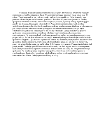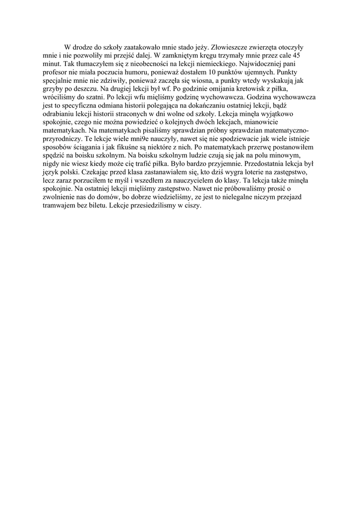 W drodze do szkoły zaatakowało mnie stado jeży. Złowieszcze zwierzęta otoczyły mnie i nie pozwoliły mi przejść dalej. W zamkniętym kręgu trzymały mnie przez cale 45 minut. Tak tłumaczyłem się z nieobecności na lekcji niemieckiego. Najwidoczniej pani profesor nie miała poczucia humoru, ponieważ dostałem 10 punktów ujemnych. Punkty specjalnie mnie nie zdziwiły, ponieważ zaczęła się wiosna, a punkty wtedy wyskakują jak grzyby po deszczu. Na drugiej lekcji był wf. Po godzinie omijania kretowisk z piłka, wróciliśmy do szatni. Po lekcji wfu mięliśmy godzinę wychowawcza. Godzina wychowawcza jest to specyficzna odmiana historii polegająca na dokańczaniu ostatniej lekcji, bądź odrabianiu lekcji historii straconych w dni wolne od szkoły. Lekcja minęła wyjątkowo spokojnie, czego nie można powiedzieć o kolejnych dwóch lekcjach, mianowicie matematykach. Na matematykach pisaliśmy sprawdzian próbny sprawdzian matematycznoprzyrodniczy. Te lekcje wiele mni9e nauczyły, nawet się nie spodziewacie jak wiele istnieje sposobów ściągania i jak fikuśne są niektóre z nich. Po matematykach przerwę postanowiłem spędzić na boisku szkolnym. Na boisku szkolnym ludzie czują się jak na polu minowym, nigdy nie wiesz kiedy może cię trafić piłka. Było bardzo przyjemnie. Przedostatnia lekcja był język polski. Czekając przed klasa zastanawiałem się, kto dziś wygra loterie na zastępstwo, lecz zaraz porzuciłem te myśl i wszedłem za nauczycielem do klasy. Ta lekcja także minęła spokojnie. Na ostatniej lekcji mięliśmy zastępstwo. Nawet nie próbowaliśmy prosić o zwolnienie nas do domów, bo dobrze wiedzieliśmy, ze jest to nielegalne niczym przejazd tramwajem bez biletu. Lekcje przesiedzilismy w ciszy.