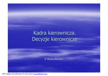 Kadra kierownicza. Decyzje kierownicze dr Błażej Balewski PDF created with pdfFactory Pro trial version www.pdffactory.com ”Zapytaj menedżera co robi, a z dużym prawdopodobieństwem, powie ci, że planuje, organizuje, koordynuje i kontroluje. Potem obserwuj co robi w rzeczywistości. Nie bądź zaskoczony, jeśli tego co zobaczysz, w żaden sposób nie będziesz mógł odnieść do tych czterech słów” Mintzberg H., The menager’s job: Folclore and fact. In Harvard Business Review 47,1969,Nr 6, s.49 PDF created with pdfFactory Pro trial version www.pdffactory.com Charakterystyczne cechy pracy kierownika • Praca menedżera nie ma jednoznacznie określonego początku, ani jasno określonego końca • dzień pracy jest rozczłonkowany • większość czasu spędza się na rozmowach • występuje przewaga słuchania nad wydawaniem poleceń Carlson S., Executive behavior: A study of work load and the working methods of managing directors, Stckholm,1951 i Guest R.H., Of time and the foreman. In: Personnel 32,1955/56,s.478486 • problemy pojawiające się przed kierownikiem wymagają reakcji szybszej niż potrzeba na pozyskanie optymalnej wiedzy • W procesie zarządzania są zarówno źródłem impulsów jak i osobami reagującymi i adaptującymi się do zmiennej rzeczywistości 1. Steinmann H., Schreyögg G., Zarządzanie... , Wrocław 1992 r , s.22 PDF created with pdfFactory Pro trial version www.pdffactory.com Pola reakcji i akcji kierowniczej - przymus działania - restrykcje - własna twórczość PDF created with pdfFactory Pro trial version www.pdffactory.com Oczekiwania odniesień pól akcji i reakcji kierowniczej 1. Stosunki międzyludzkie (kierownik pełni rolę: reprezentanta, przełożonego i organizatora ) 2. Wiedza /informacja/ (kierownik pełni rolę odbiornika, nadajnika i rzecznika 3. Decyzje (kierownik pełni rolę: innowatora, rozwiązujcego problemy, przydzielającego zasoby i prowadzącego rokowania Mintzberg H.,The Manager’s Job: Folklore and fact. In Harvard Business Review, 1975, July-August PDF created with pdfFactory Pro trial version www.pdffactory.com Typy umiejętności kierowniczych § Umiejętności koncepcyjne § Umiejętności techniczne § Umiejętności społeczne Stoner J.A., Kierowanie... , Warszawa 1992 r.,s36 PDF created with pdfFactory Pro trial version www.pdffactory.com Umiejętności kierownicze potrzebne do skutecznego działania na różnych szczeblach kierownictwa Źródło : Stoner J.A., Kierowanie... , Warszawa 1992 r.,s36 PDF created with pdfFactory Pro trial version www.pdffactory.com Skuteczny kierownik J. Szaban uważa, że model skutecznego kierownika współtworzą następujące czynniki: zdolność wprowadzania zmian, duch przedsiębiorczości oraz zdolność porozumiewania się i zdolności interpersonalne G. Bartkowiak natomiast uważa, że na sylwetkę skutecznego kierownika wpływają; funkcjonowanie moralne, kompetencje kierownicze, postawa wobec własnego rozwoju i uczenia się oraz schematy poznawcze i autokoncepcja wraz z poczuciem tożsamości a także klimat i kultura organizacyjna. PDF created with pdfFactory Pro trial version www.pdffactory.com Model skutecznego kierownika. Źródło: Bartkowiak G., Skuteczny kierownik. Model i jego empiryczna weryfikacja, Akademia Ekonomiczna w Poznaniu, Poznań,2002r.,s.106 PDF created with pdfFactory Pro trial version www.pdffactory.com Style kierowania Styl kierowania /styl przywództwa/ - wszystkie kategorie ujmujące łącznie pracę kierownika Styl kierowania jednowymiarowy styl kierowania dwuwymiarowy styl kierowania -styl autorytarny, - demokratyczny - ukierunkowany na zadania - ukierunkowany na osoby identyfikują dwa niezależne, główne - wymiary zachowań kierowników np.: stosunek przełożonego i inicjowanie - struktury PDF created with pdfFactory Pro trial version www.pdffactory.com Istota problematyki decyzji kierowniczych Problematyka decyzji kierowniczych Ujęcie racjonalistyczno-normatywne Ujęcie opisowe (behawioralne) Przedstawia logicznie wywiedzione, z apriorycznie przyjętych norm racjonalności warunki, reguły i zalecenia, jakich należy przestrzegać, aby decyzje były podejmowane w pełni świadomie i rozumnie przedstawia rzeczywiście występujące zachowania decydentów, „ich możliwości i ograniczenia” PDF created with pdfFactory Pro trial version www.pdffactory.com Decyzja kierownicza ? Podział definicji decyzji kierowniczych Odnoszące się do przedmiotu decyzji Odnoszące się do osoby decydującej Ujęcie racjonalistyczno-normatywne Ujęcie opisowe (behawioralne) PDF created with pdfFactory Pro trial version www.pdffactory.com Istota decyzji kierowniczej w ujęciu odnoszącym się do osoby decydującej 1. decyzje kierownicze to złożony proces intelektualny 2. decyzje kierownicze mogą podejmować wszyscy członkowie organizacji 3. decyzja jest poczuciem decydenta, że proces został zakończony i że w skutek tego wie on już jak działać, aby osiągnąć cel PDF created with pdfFactory Pro trial version www.pdffactory.com Determinanty zachowania decydenta Nęcka E., Psychologia poznawcza,PWN, Warszawa 2006r.,s.585 PDF created with pdfFactory Pro trial version www.pdffactory.com Istota decyzji kierowniczej w ujęciu odnoszącym się do przedmiotu decyzji 1. Wybór polega na przyporządkowaniu założonego arbitralnie kryterium 2. Wybór jest zaledwie elementem podejmowania decyzji 3. Istotą decyzji jest ogół przedsięwzięć związanych z wyszukaniem i wdrożeniem kierunku działania prowadzącego do redukcji niezadowalającej sytuacji 4. Decyzja kierownicza jest działaniem wieloaspektowym (aspekt poznawczy, aksjologiczny, wolicjonalny) PDF created with pdfFactory Pro trial version www.pdffactory.com Podział decyzji kierowniczych w ujęciu odnoszącym się do przedmiotu decyzji 1. Klasyfikacja H.Simon’a - decyzje programowalne i decyzje nieprogramowalne 2. Klasyfikacja Bolesty-Kukułki - decyzje selekcyjne, alokacyjne i ra