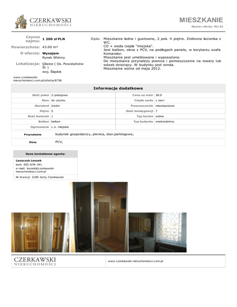 MIESZKANIE Numer oferty: Mi/42 Czynsz 1 200 zł PLN najmu: Powierzchnia: 43.00 m² O ofercie: Wynajem Rynek Wtórny Lokalizacja: Gliwice ( Os. Powstańców Śl. ) woj. Śląskie Opis: Mieszkanie ładne i gustowne, 2 pok. V piętro. Zrobiona łazienka z WC. CO + woda ciepła "miejska". Jest balkon, okna z PCV, na podłogach panele, w korytarzu szafa Komandor. Mieszkanie jest umeblowane i wyposażone. Do mieszkania przynależy piwnica i pomieszczenie na rowery lub wózek dziecięcy. W budynku jest winda. Mieszkanie wolne od maja 2012. www.czerkawskinieruchomosci.com.pl/oferta/6736 Informacje dodatkowe Ilość pokoi 2-pokojowe Cena za metr 28.0 Stan do użytku Standard średni Piętro 5 Ciepła woda z sieci Przeznaczenie mieszkaniowe Ilość kondygnacji 7 Ilość łazienek 1 Typ kuchni widna Balkon balkon Typ budynku wielorodzinny Ogrzewanie c.o. miejskie Przynależne Okna budynek gospodarczy, piwnica, stan.parkingowe, PCV, Dane kontaktowe agenta: Laszczyk Leszek kom. 502-678-341 e-mail: [email protected] Nr licencji: 2185 Jerzy Czerkawski www.czerkawski-nieruchomosci.com.pl