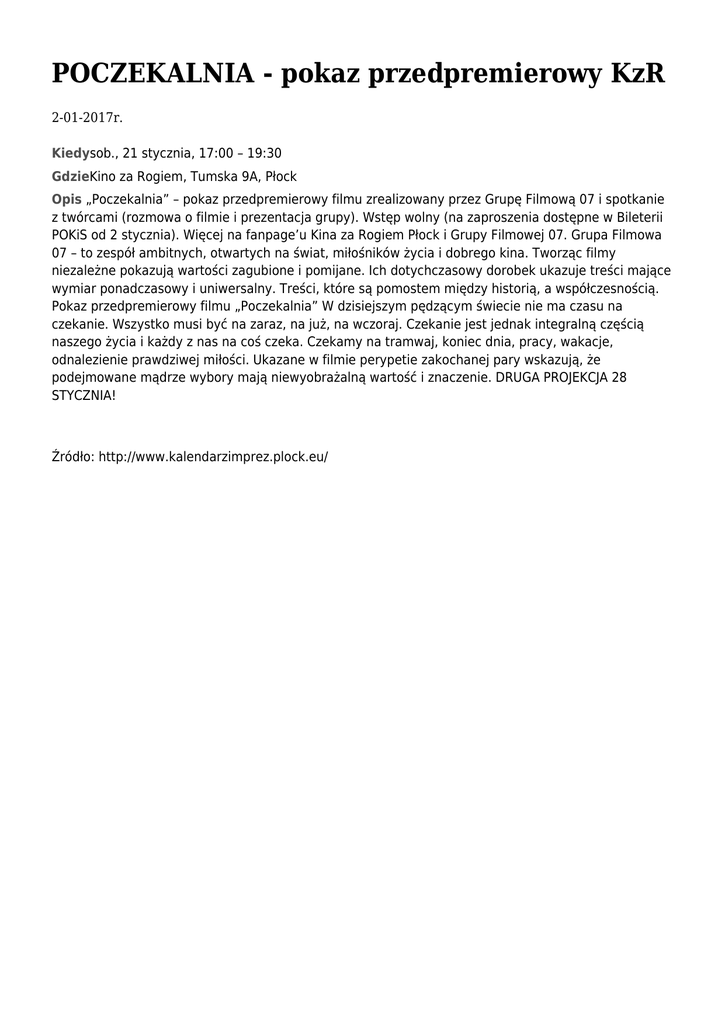 POCZEKALNIA - pokaz przedpremierowy KzR 2-01-2017r. Kiedysob., 21 stycznia, 17:00 – 19:30 GdzieKino za Rogiem, Tumska 9A, Płock Opis „Poczekalnia” – pokaz przedpremierowy filmu zrealizowany przez Grupę Filmową 07 i spotkanie z twórcami (rozmowa o filmie i prezentacja grupy). Wstęp wolny (na zaproszenia dostępne w Bileterii POKiS od 2 stycznia). Więcej na fanpage’u Kina za Rogiem Płock i Grupy Filmowej 07. Grupa Filmowa 07 – to zespół ambitnych, otwartych na świat, miłośników życia i dobrego kina. Tworząc filmy niezależne pokazują wartości zagubione i pomijane. Ich dotychczasowy dorobek ukazuje treści mające wymiar ponadczasowy i uniwersalny. Treści, które są pomostem między historią, a współczesnością. Pokaz przedpremierowy filmu „Poczekalnia” W dzisiejszym pędzącym świecie nie ma czasu na czekanie. Wszystko musi być na zaraz, na już, na wczoraj. Czekanie jest jednak integralną częścią naszego życia i każdy z nas na coś czeka. Czekamy na tramwaj, koniec dnia, pracy, wakacje, odnalezienie prawdziwej miłości. Ukazane w filmie perypetie zakochanej pary wskazują, że podejmowane mądrze wybory mają niewyobrażalną wartość i znaczenie. DRUGA PROJEKCJA 28 STYCZNIA! Źródło: http://www.kalendarzimprez.plock.eu/