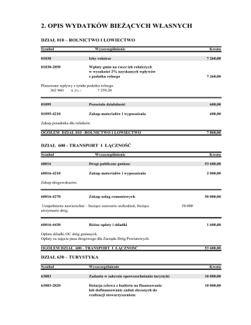 2. OPIS WYDATKÓW BIEŻĄCYCH WŁASNYCH DZIAŁ 010 – ROLNICTWO I ŁOWIECTWO Symbol Wyszczególnienie Kwota 01030 Izby rolnicze 7 260,00 01030-2850 Wpłaty gmin na rzecz izb rolniczych w wysokości 2% uzyskanych wpływów z podatku rolnego 7 260,00 Planowane wpływy z tytułu podatku rolnego 362 960 7 259,20 X 2% = 01095 Pozostała działalność 600,00 01095-4210 Zakup materiałów i wyposażenia 600,00 Zakup poradnika dla rolników. OGÓŁEM DZIAŁ 010 –ROLNICTWO I ŁOWIECTWO 7 860,00 DZIAŁ 600 - TRANSPORT I ŁĄCZNOŚĆ Symbol Wyszczególnienie 60016 Drogi publiczne gminne 60016-4210 Zakup materiałów i wyposażenia Kwota 53 600,00 2 000,00 Zakup drogowskazów. 60016-4270 Uzupełnienie nawierzchni – bieżące usuwanie uszkodzeń, bieżące utrzymanie dróg. 60016-4430 50 000,00 Zakup usług remontowych Różne opłaty i składki 50 000 1 600,00 Opłata składki OC dróg gminnych. Opłaty za zajęcie pasa drogowego dla Zarządu Dróg Powiatowych. OGÓŁEM DZIAŁ 600 - TRANSPORT I ŁĄCZNOŚĆ 53 600,00 DZIAŁ 630 – TURYSTYKA Symbol Wyszczególnienie Kwota 63003 Zadania w zakresie upowszechniania turystyki 10 000,00 63003-2820 Dotacja celowa z budżetu na finansowanie lub dofinansowanie zadań zleconych do realizacji stowarzyszeniom 10 000,00 Zadanie zlecone do realizacji organizacjom pozarządowych i podmiotom prowadzącym działalność pożytku publicznego, w formie: 1) powierzania wykonywania zadania publicznego wraz z udzieleniem dotacji na finansowanie lub dofinansowanie jego realizacji, 2) wspierania zadań publicznych wraz z udzielaniem dotacji na dofinansowanie jego realizacji 63003-4210 Zakup materiałów i wyposażenia 0,00 Zakup materiałów związanych z upowszechnianiem turystyki: 63003-4300 Zakup usług pozostałych 0,00 Usługi reklamowe. 63095 Pozostała działalność 5 000,00 63095-4390 Zakup usług obejmujących wykonanie ekspertyz, analiz i opinii 5 000,00 Badanie wody w miejscu kąpieliska w Czołpinie. OGÓŁEM DZIAŁ DZIAŁ 630 – TURYSTYKA 15 000,00 DZIAŁ 700 - GOSPODARKA MIESZKANIOWA Symbol Wyszczególnienie Kwota 70005 Gospodarka gruntami i nieruchomościami 62 500,00 70005-4300 Zakup usług pozostałych 52 000,00 1. Wyceny nieruchomości, wyceny lokali mieszkalnych i użytkowych. inwentaryzacja nieruchomości. mapy wypisy i opisy nieruchomości, akty notarialne. opłaty za wypisy z ksiąg wieczystych. ekspertyzy i regulacje stanów prawnych. ogłoszenia w prasie. opłaty skarbowe, sądowe i egzekucyjne. 2. Wykonanie inwentaryzacji mieszkań komunalnych 70005-4430 Różne opłaty i składki Służebność gruntowa z tytułu zapewnienia dostępu do działki gminnej przez prywatną nieruchomość. 50 000,00 2 000,00 500,00 70005-4530 Podatek od towarów i usług (VAT) 6 000,00 Podatek od towarów i usług (VAT). 70005-4610 Koszty postępowania sądowego i prokuratorskiego 4 000,00 Koszty postępowania sądowego, komorniczego i prokuratorskiego związane z egzekwowaniem na drodze sądowej należności 70095 Pozostała działalność 59 442,00 70095-4270 Zakup usług remontowych 29 442,00 Remonty mieszkań komunalnych. Czyszczenie przewodów mieszkań komunalnych Wpłata na Fundusz Mieszkaniowy (Wspólnota Mieszkaniowa Gardna W.) 70095-4300 20 000,00 5 200,00 4 242,00 Zakup usług pozostałych 2 000,00 Okresowa ocena stanu technicznego mieszkań komunalnych. 70095-4600 Kary i odszkodowania wypłacone na rzecz osób prawnych i innych jednostek organizacyjnych 28 000,00 Wyrokiem Sądu Rejonowego w Słupsku zasadzono od Gminy Smołdzino na rzecz Wojskowej Agencji Mieszkaniowej w Warszawie kwotę 20.922,79 zł wraz z ustawowymi odsetkami z tytułu odszkodowania za zajmowanie przez Pana Mateusza Kasińskiego i Panią Marlenę Kasińską, lokalu mieszkalnego w Smołdzinie przy ul. Jeziornej 13/15 w okresie od 01 maja 2011r do 31 października 2012r - zgodnie z zawartą umową. 17 436 Należności dla WAM za okres od 01 listopada 2012r (planowane) 10 564 OGÓŁEM DZIAŁ 700 – GOSPODARKA MIESZKANIOWA 121 942,00 DZIAŁ 710 - DZIAŁALNOŚĆ USŁUGOWA Symbol Wyszczególnienie Kwota 71004 Plany zagospodarowania przestrzennego 83 900,00 71004-4170 Wynagrodzenia bezosobowe 83 900,00 1. Opracowanie projektów decyzji o warunkach zabudowy, lokalizacji celu publicznego, zalesień, podziałów nieruchomości. 2. Opracowanie miejscowych planów zagospodarowania przestrzennego dla fragmentu miejscowości Łokciowe. 3. Zaopiniowanie przez Komisję Urbanistyczno-Architektoniczną. 4. Studium uwarunkowań i kierunków zagospodarowania przestrzennego Gminy Smołdzino. 15 900,00 10 000,00 24 000,00 34 000,00 71014 Opracowania geodezyjne i kartograficzne 29 000,00 71014-4170 Wynagrodzenia bezosobowe 29 000,00 Opracowanie projektów decyzji o warunkach zabudowy, lokalizacji celu publicznego, zalesień, podziałów nieruchomości. (scalanie, mapy do celów projektowych, rozgraniczenia, wznowienie granic) 71035 Cmentarze 6 500,00 71035-4210 Zakup materiałów i wyposażenia 2 000,00 Zakup siatek ogrodzeniowych, kłódek, łańcuchów, tablic. 71035-4300 Zakup usług pozostałych 1. Utrzymanie czystości i porządku na cmentarzach OGÓŁEM DZIAŁ 710 DZIAŁALNOŚĆ USŁUGOWA 4 500,00 4 500,00 119 400,00 DZIAŁ 750 – ADMINISTRACJA PUBLICZNA Symbol Wyszczególnienie Kwota 75022 Rady gmin (miast i miast na prawach powiatu) 118 000,00 75022-3030 Różne wydatki na rzecz osób fizycznych 113 000,00 Diety dla radnych i sołtysów. 75022-4210 Zakup materiałów i wyposażenia 2 500,00 Zakup materiałów oraz artykułów spożywczych na potrzeby Rady Gminy. 75022-4300 Zakup usług pozostałych 2 500,00 Zakup usług związanych z działalnością Rady Gminy. 75023 Urzędy gmin (miast i miast na prawach powiatu) 75023-3020 Wydatki osobowe niezaliczane do wynagrodzeń 1 814 140,00 3 000,00 Wydatki na zakup odzieży ochronnej dla pracowników obsługi, ekwiwalent za pranie, okulary korygujące wzrok. 75023-4010 Wynagrodzenia osobowe pracowników Wynagrodzenia osobowe wynikające z zawartych