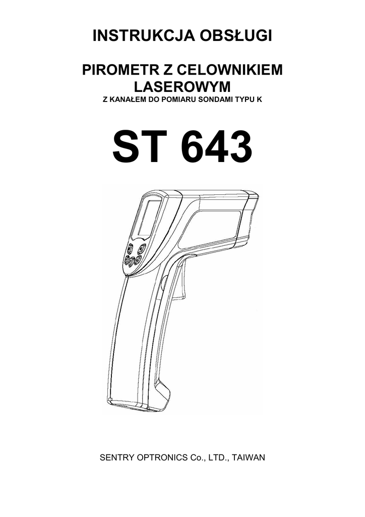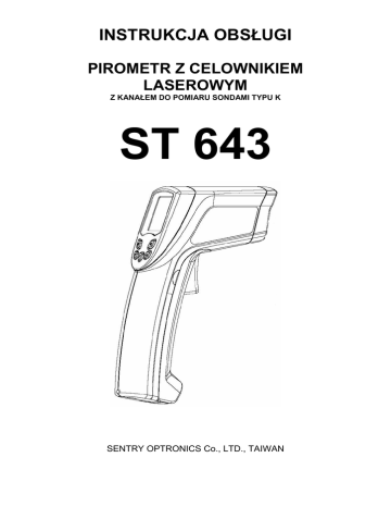 INSTRUKCJA OBSŁUGI PIROMETR Z CELOWNIKIEM LASEROWYM Z KANAŁEM DO POMIARU SONDAMI TYPU K ST 643 SENTRY OPTRONICS Co., LTD., TAIWAN -2- Spis treści Strona 1. WPROWADZENIE........................................................................................................ - 4 2. BEZPIECZEŃSTWO POMIARÓW ............................................................................... - 5 3. SPECYFIKACJA........................................................................................................... - 7 3.1. Cechy konstrukcyjne i użytkowe............................................................................ - 7 3.2. Dane techniczne.................................................................................................... - 7 4. OBSŁUGA PIROMETRU .............................................................................................. - 8 4.1. Widok zewnętrzny pirometru ................................................................................. - 8 4.2. Widok wyświetlacza LCD....................................................................................... - 8 4.3. Zawansowane funkcje ........................................................................................... - 9 4.4. Uwagi................................................................................................................... - 10 4.5. Pokrywa baterii .................................................................................................... - 11 5. TEORIA POMIARÓW ................................................................................................. - 12 5.1. Obszar stożka pomiarowego = stosunek odległości do średnicy (D:S) ............... - 12 5.2. Emisyjność .......................................................................................................... - 12 5.3. Tabela emisyjności .............................................................................................. - 13 6. CZYSZCZENIE........................................................................................................... - 14 7. ZGODNOŚĆ Z DYREKTYWĄ 2002/95/EC ................................................................ - 14 8. UTYLIZACJA................................................................................................................... - 14 - -3- 1. WPROWADZENIE Pirometr ST643 jest urządzeniem do bezdotykowego pomiaru temperatury za pomocą fal podczerwieni. Pomiar wykonuje się w prosty sposób, poprzez wciśnięcie przycisku pomiarowego i naprowadzenie celownika laserowego na mierzony obiekt, aż do uzyskania odczytu. Model ST643, w stosunku do konwencjonalnych mierników, został wyposażony w dwie nowe funkcje. Funkcja E-smart daje użytkownikowi możliwość pomiaru temperatury bez znajomości i konieczności sprawdzania wartości emisyjności badanego materiału (parametrów badanej powierzchni). Ponadto użytkownik zostaje powiadomiony o przekroczeniu wartości mierzonej temperatury ponad ustalony punkt alarmowy, poprzez zmianę koloru podświetlenia (funkcja CIS). Pirometr ST643, dzięki dużej rozdzielczości optycznej DS1) umożliwia wykonywanie pomiarów w dużej odległości od mierzonego obiektu. Cechy pirometru: • Funkcja E-smart: Inteligentny, automatyczny pomiar emisyjności • Funkcja CIS: Zmiana koloru podświetlenia przy przekroczeniu wartości mierzonej temperatury względem ustawionego punktu alarmowego • Bardzo niski pobór prądu w stanie czuwania • Wydłużony czas niezawodności urządzenia • Włączany/wyłączany celownik laserowy • Przełączana skala temperatury: ºC lub ºF • Pomiar ciągły lub ręczny (z automatycznym zatrzymaniem wyniku pomiaru na wyświetlaczu LCD) Zastosowanie pirometru: • Diagnostyka układów elektrycznych • Serwisy motoryzacyjne • Klimatyzacje • Badania naukowe • Procesy produkcyjne układów półprzewodnikowych • Badanie złącz w obwodach • Przechowywanie żywności • Przeprowadzanie audytów energetycznych HVAC • Pomiar temperatury obiektów będących w ruchu lub trudnodostępnych 1) Rozdzielczość optyczna jest wyrażana stosunkiem odległości D do średnicy pola pomiaru S. Np. dla rozdzielczości 30:1 przy odległości 1 m średnica pola pomiaru wynosi 3,33 cm. -4- 2. BEZPIECZEŃSTWO POMIARÓW Przed przystąpieniem do przeprowadzenia pomiarów należy uważnie przeczytać instrukcję obsługi. Wszelkie naprawy oraz prace serwisowe mogą być wykonywane wyłącznie przez specjalistyczny serwis. OSTRZEŻENIE O PROMIENIOWANIU LASERA • Wciśnięcie przycisku pomiarowego włącza/wyłącza wskaźnik laserowy. W czasie jego użycia należy zachować szczególną ostrożność. Nie wolno kierować promienia lasera w kierunku oczu ludzi i zwierząt. • Wskaźnik lasera stosować w oddaleniu od strefy bawiących się lub przebywających dzieci. • Nie wolno patrzeć w kierunku światła lasera wychodzącego ze źródła optycznego. • Podczas pomiarów temperatury obiektów, które posiadają powierzchnię odbijającą promieniowanie świetlne, należy zwrócić szczególną uwagę, aby odbita wiązka lasera nie została skierowana w kierunku oczu. UWAGA • Urządzenie nie jest wodoodporne. Nie wolno go wkładać do wody ani używać w zawilgoconym otoczeniu. • Urządzenie nie jest przeznaczone do zastosowań medycznych. Może służyć do pomiarów temperatury ciała jedynie w zastosowaniach nieprofesjonalnych. Urządzenie jest przeznaczone do zastosowań przemysłowych i naukowych. Znaczenie symboli Niebezpieczeństwo! Przed przystąpieniem do wykonania pomiaru należy przeczytać instrukcję obsługi. Urządzenie posiada certyfikat CE -5- Urządzenie spełnia następujące normy i standardy: EN61326: Wyposażenie elektryczne do pomiarów, sterowania i użytku w laboratoriach – wymagania dotyczące kompatybilności elektromagnetycznej IEC61000-4-2: Badanie odporności na wyładowania elektrostatyczne IEC61000-4-3: Badanie odporn