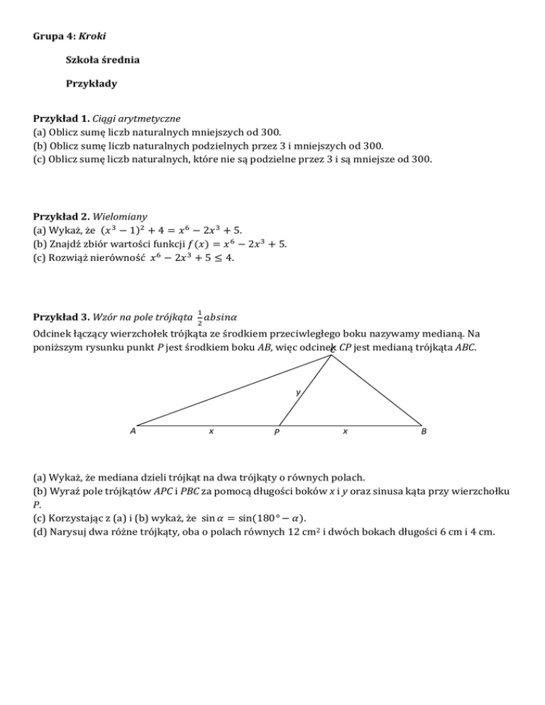 Grupa 4: Kroki Szkoła średnia Przykłady Przykład 1. Ciągi arytmetyczne (a) Oblicz sumę liczb naturalnych mniejszych od 300. (b) Oblicz sumę liczb naturalnych podzielnych przez 3 i mniejszych od 300. (c) Oblicz sumę liczb naturalnych, które nie są podzielne przez 3 i są mniejsze od 300. Przykład 2. Wielomiany ) (a) Wykaż, że ( (b) Znajdź zbiór wartości funkcji ( ) (c) Rozwiąż nierówność . . . Przykład 3. Wzór na pole trójkąta Odcinek łączący wierzchołek trójkąta ze środkiem przeciwległego boku nazywamy medianą. Na poniższym rysunku punkt P jest środkiem boku AB, więc odcinek C CP jest medianą trójkąta ABC. y A x P x B (a) Wykaż, że mediana dzieli trójkąt na dwa trójkąty o równych polach. (b) Wyraź pole trójkątów APC i PBC za pomocą długości boków x i y oraz sinusa kąta przy wierzchołku P. (c) Korzystając z (a) i (b) wykaż, że ( ). (d) Narysuj dwa różne trójkąty, oba o polach równych 12 cm2 i dwóch bokach długości 6 cm i 4 cm.