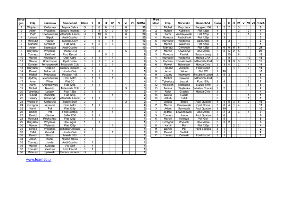 M-ce gen. Imię Nazwisko Samochód Klasa I II III IV 1 2 3 4 5 6 7 8 9 10 11 12 13 14 15 16 17 18 19 20 21 22 23 24 25 26 27 28 29 30 31 32 33 34 35 36 37 38 Wojciech Adam Piotr Łukasz Mateusz Mariusz Adam Krzysztof Tomasz Marcin Marcin Damian Krzysztof Paweł Michał Jędrzej Artur Kamil Michał Tyberiusz Hubert Cezary Wojciech Grzegorz Kamil Daniel Dawid Mateusz Krzysztof Marcin Teresa Rafał Dawid Jakub Tomasz Marcin Tomasz Mateusz Kiełbaska Wojtanka Szwankowski Ślipek Pawlak Cimcioch Szymajda Wojtanka Zieliński Kowalczyk Brzezowski Tomaszewski Kwapisz Balcerzak Przyciasa Lewandowski Winer Andrzejewski Nowicki Łuczak Kubielski Krawczyk Kiełbaska Wysocki Pol Pol Cieślak Rechciński Wojtanka Walencki Wojtanka Grzelak Góźdź Kubik Junde Kulesza Zieliński Spławski Toyota Celica Subaru Impreza Mitsubishi Lancer Audi Quattro Subaru Justy Fiat 126p Audi Quattro Honda CRX Ford Escort Opel Astra Opel Corsa Mitsubishi Colt Subaru Impreza Honda Civic Peugeot 106 Opel Astra Fiat CC Fiat 126p Mitsubishi Colt Fuat 125p Fiat 126p Mitsubishi Lancer Suzuki Swift Opel Astra Fiat 125p Ford Scorpio BMW E36 Fiat 126p Opel Agila Fiat 126p Daihatsu Charade Honda Civic Mazda 323 Nissan 100nx Audi Quattro VW Golf Ford Escort Subaru Impreza G G G 3 2 2 3 2 2 2 3 2 G 2 1 3 2 1 2 2 1 2 2 3 3 3 3 1 1 1 2 2 2 2 3 3 3 G 8 3 5 1 6 8 10 3 5 2 8 10 3 6 10 0 www.team50.pl 1 10 4 6 8 5 4 1 2 1 6 1 1 1 4 1 1 1 1 1 1 1 1 1 5 1 1 2 3 4 2 1 1 1 1 1 1 1 1 1 1 1 1 V VI 6 10 8 4 1 5 1 1 1 1 1 3 1 1 2 1 1 1 1 1 1 1 1 1 1 1 1 1 1 1 1 1 VII SUMA 38 31 26 20 13 13 10 9 9 7 6 6 6 5 4 4 4 3 3 3 2 2 2 2 2 2 2 1 1 1 1 1 1 1 1 1 1 1 M-ce klasa 1 2 3 4 5 6 1 2 3 4 5 6 7 8 9 10 11 12 13 14 15 16 1 2 3 4 5 6 7 8 9 10 11 Imię Nazwisko Samochód Klasa Michał Przyciasa Peugeot 106 Hubert Kubielski Fiat 126p Kamil Andrzejewski Fiat 126p Mateusz Rechciński Fiat 126p Krzysztof Wojtanka Opel Agila Marcin Walencki Fiat 126p Mariusz Cimcioch Fiat 126p Marcin Kowalczyk Opel Astra Mateusz Pawlak Subaru Justy Krzysztof Wojtanka Honda CRX Damian Tomaszewski Mitsubishi Colt Paweł Balcerzak Honda Civic Tomasz Zieliński Ford Escort Artur Winer Fiat CC Cezary Krawczyk Mitsubishi Lancer Michał Nowicki Mitsubishi Colt Tyberiusz Łuczak Fuat 125p Wojciech Kiełbaska Suzuki Swift Teresa Wojtanka Daihatsu Charade Rafał Grzelak Honda Civic Dawid Góźdź Jakub Kubik Łukasz Ślipek Audi Quattro Marcin Brzezowski Opel Corsa Adam Szymajda Audi Quattro Jędrzej Lewandowski Opel Astra Tomasz Junde Audi Quattro Marcin Kulesza VW Golf Grzegorz Wysocki Opel Astra Kamil Pol Fiat 125p Daniel Pol Ford Scorpio Dawid Cieślak Tomasz Zieliński Ford Escort 1 1 1 1 1 1 2 2 2 2 2 2 2 2 2 2 2 2 2 2 2 2 3 3 3 3 3 3 3 3 3 3 3 I II III IV 2 2 1 1 3 3 2 1 V VI VII SUMA 2 1 3 6 8 6 5 10 8 1 3 3 4 5 2 1 6 5 8 3 1 4 3 2 4 1 10 5 4 3 10 5 3 4 8 2 6 1 2 1 4 8 10 2 6 5 3 5 4 3 1 3 3 2 2 1 1 1 5 4 1 2 1 1 1 2 1 8 4 3 3 3 1 24 20 18 18 15 14 11 10 8 8 7 6 2 1 1 1 19 17 10 9 6 5 5 4 2 2 1