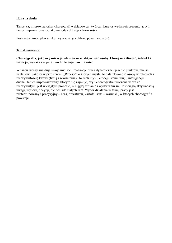 Ilona Trybuła Tancerka, improwizatorka, choreograf, wykładowca , twórca i kurator wydarzeń prezentujących taniec improwizowany, jako metodę edukacji i twórczości. Postrzega taniec jako sztukę, wykraczająca daleko poza fizyczność. Temat rozmowy: Choreografia, jako organizacja zdarzeń oraz aktywność osoby, której wrażliwość, intelekt i intuicja, wyraża się przez ruch i kreuje ruch, taniec. W tańcu rzeczy znajdują swoje miejsce i realizację przez dynamiczne łączenie punktów, miejsc, kształtów i jakości w przestrzeni. „Rzeczy”, o których myślę, to cała złożoność osoby w relacjach z rzeczywistością (wewnętrzną i zewnętrzną). To ruch myśli, emocji, stanu, wizji, inteligencji i ducha. Taniec improwizowany, którym się zajmuję, czyli choreografia tworzona w czasie rzeczywistym, jest w ciągłym procesie, w ciągłej zmianie i wydarzaniu się. Jest ciągłą aktywnością uwagi, wyboru, decyzji, nie posiada stałych ram. Wybór działania w takiej pracy jest zdeterminowany i precyzyjny – czas, przestrzeń, kształt i sens – warunki , w których choreografia powstaje.