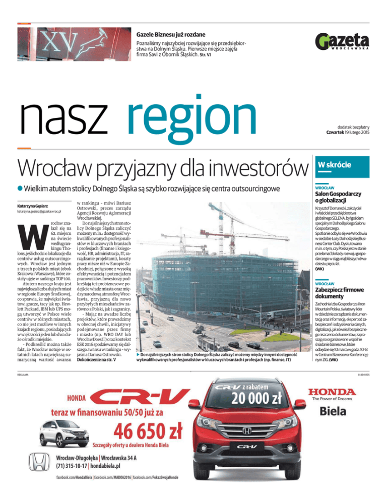 Gazele Biznesu już rozdane Poznaliśmy najszybciej rozwijające się przedsiębiorstwa na Dolnym Śląsku. Pierwsze miejsce zajęła firma Savi z Obornik Śląskich. Str. VI nasz region dodatek bezpłatny Czwartek 19 lutego 2015 Wrocław przyjazny dla inwestorów W skrócie A Wielkim atutem stolicy Dolnego Śląska są szybko rozwijające się centra outsourcingowe [email protected] rocław znalazł się na 62. miejscu na świecie wedługrankingu Tholons,jeślichodziolokalizacjedla centrów usług outsourcingowych. Wrocław jest jednym z trzech polskich miast (obok Krakowa i Warszawy), które zostały ujęte w rankingu TOP 100. Atutem naszego kraju jest największa liczba dużych miast w regionie Europy Środkowej, co sprawia, że najwięksi światowi gracze, tacy jak np. Hewlett Packard, IBM lub UPS mogą utworzyć w Polsce wiele centrów w różnych miastach, co nie jest możliwe w innych krajach regionu, posiadających w większości jeden lub dwa duże ośrodki miejskie. – Podkreślić można także fakt, że Wrocław notuje w ostatnich latach największą sumaryczną wartość awansu W REKLAMA w rankingu – mówi Dariusz Ostrowski, prezes zarządu Agencji Rozwoju Aglomeracji Wrocławskiej. Do najsilniejszych stron stolicy Dolnego Śląska zaliczyć możemy m.in.: dostępność wykwalifikowanych profesjonalistów w kluczowych branżach i profesjach (finanse i księgowość, HR, administracja, IT, zarządzanie projektami), koszty pracy niższe niż w Europie Zachodniej, połączone z wysoką efektywnością i potencjałem pracowników. Inwestorzy podkreślają też probiznesowe podejście władz miasta oraz międzynarodową atmosferę Wrocławia, przyjazną dla nowo przybyłych mieszkańców zarówno z Polski, jak i zagranicy. – Mając na uwadze liczbę projektów, które prowadzimy w obecnej chwili, inicjatywy podejmowane przez firmy i miasto (np. WRO DAY lub WrocławDoesIT) oraz kontekst ESK 2016 spodziewamy się dalszego awansu w rankingu – wyjaśnia Dariusz Ostrowski. Dokończenie na str. V Salon Gospodarczy o globalizacji KrzysztofDomarecki,założyciel iwłaścicielprzedsiębiorstwa globalnegoSELENA,byłgościem specjalnymDolnośląskiegoSalonu Gospodarczego. SpotkanieodbyłosięweWrocławiu wsiedzibieLożyDolnośląskiejBusinessCenterClub.Dyskutowano m.in.otym,czyPolskajestwstanie przełamaćblokadyrozwojugospodarczegowciągunajbliższychdwudziestupięciulat. (WK) WROCŁAW Zabezpiecz firmowe dokumenty FOT. PAWEŁ RELIKOWSKI Katarzyna Gęsiarz WROCŁAW b Do najsilniejszych stron stolicy Dolnego Śląska zaliczyć możemy między innymi dostępność wykwalifikowanych profesjonalistów w kluczowych branżach i profesjach (np. finanse, IT) ZachodniaIzbaGospodarczaiIron MountainPolska,światowylider wdziedziniezarządzaniadokumentacjąorazinformacją,ekspertodzabezpieczeńiodzyskiwaniadanych, digitalizacji,jakrównieżbezpiecznegoniszczeniadokumentów,zapraszająnaorganizowanewspólnie śniadaniebiznesowe,które odbędziesię10marcawgodz.10-13 wCentrumBiznesowo-KonferencyjnymZIG. (WK) 014949235 Polska Gazeta Wrocławska Czwartek, 19 lutego 2015 II • Nasz region www.gazetawroclawska.pl Przyciągną wielu inwestorów Sport i edukacja w naszej aglomeracji Zarząd Legnickiej Specjalnej Strefy Ekonomicznej podpisze dziś w Głogowie porozumienie „S-3 – Droga wielkich możliwości” artnerami porozumienia są: Ministerstwo Gospodarki, Polska Agencja Informacji i Inwestycji Zagranicznych, Legnicka Specjalna Strefa Ekonomiczna, Kostrzyńsko-Słubicka Specjalna Strefa Ekonomiczna, Pomorska Specjalna StrefaEkonomiczna,Wałbrzyska Specjalna Strefa Ekonomiczna „INVEST-PARK”, Kamiennogórska Specjalna Strefa Ekonomiczna Małej Przedsiębiorczości, Agencja Nieruchomości Rolnych oraz Generalna Dyrekcja Dróg Krajowych i Autostrad. Konferencja odbędzie się w czwartek 19 lutego o godzinie 11 w Urzędzie Miejskim Miasta Głogowa. Głównym celem projektu „S3 – Droga wielkich możliwości” jest stworzenie obszaru aktywności inwestycyjnej wzdłuż drogi ekspresowej S3, będącej częścią międzynarodowej trasy E65. Równoleglezbudowątejniezwykle ważnej drogi, przygotowywanajestkompleksowaoferta dla inwestorów. Będzie ona dedykowana nie tylko dużym firmom z zagranicy, ale także małym i średnim przedsiębiorstwom lokalnym. Zadaniem stref ekonomicznych Polski zachodniej będzie przygotowanie atrakcyjnych działek inwestycyjnych, wyposażonych m.in. w gotowe hale pod wynajem dla małych i średnichfirm.Dodatkowo,wspólnie zsamorządamilokalnymi,strefy zadbają o infrastrukturę towarzyszącą (drogi, uzbrojenie, sieci). P REKLAMA Aby zwiększyć atrakcyjność ofertyprzygotowanejprzezsygnatariuszy porozumienia i zachęcić do inwestowania wzdłuż drogiS3,przeprowadzonazostanie kampania promocyjna skierowana do inwestorów zagranicznych (poprzez PAIiIZ) oraz do przedsiębiorców krajowych. Droga S3 ma być synonimem inwestycji budującej pozytywny klimat gospodarczy województw Polski zachodniej. Dobrairozległasiećdrogowa to podstawa sukcesu każdej inwestycji. Świetnie skomunikowaneterenyinwestycyjneprzyciągająprzedsiębiorców.Dlatego jużterazstrefyekonomicznepołożonewpasiePolskizachodniej przygotowują się do momentu, kiedy trasa S3 powstanie w całości,łączącpółnoczpołudniem kraju.Abystworzyćkompleksową ofertę dla inwestorów w pasieoddziaływaniadrogiS3,strefyekonomicznewrazzMinisterstwemGospodarkipołączyłysiły na rzecz projektu „S3 – Droga wielkich możliwości”. – Z lokowaniem inwestycji, jest jak z budowaniem domu – mówi Rafał Jurkowlaniec, prezes zarządu Legnickiej Specjalnej Strefy Ekonomicznej. – Zanim się na to zdecydujemy, analizujemy, w jakiej okolicy ten dompostawić,jakiedrogidoniegoprowadzą,czybędziemymieli pomocnych sąsiadów, sprawną administrację samorządową iprzyjazneotoczenie.Towszystko oferuje Legnicka Specjalna Strefa Ekonomiczna. LSSE od 18 lat pozyskuje inwestorów na teren Dolnego Śląska i wi