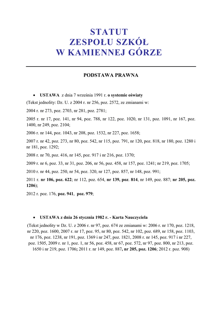 STATUT ZESPOŁU SZKÓŁ W KAMIENNEJ GÓRZE PODSTAWA PRAWNA USTAWA z dnia 7 września 1991 r. o systemie oświaty (Tekst jednolity: Dz. U. z 2004 r. nr 256, poz. 2572, ze zmianami w: 2004 r. nr 273, poz. 2703, nr 281, poz. 2781; 2005 r. nr 17, poz. 141, nr 94, poz. 788, nr 122, poz. 1020, nr 131, poz. 1091, nr 167, poz. 1400, nr 249, poz. 2104; 2006 r. nr 144, poz. 1043, nr 208, poz. 1532, nr 227, poz. 1658; 2007 r. nr 42, poz. 273, nr 80, poz. 542, nr 115, poz. 791, nr 120, poz. 818, nr 180, poz. 1280 i nr 181, poz. 1292; 2008 r. nr 70, poz. 416, nr 145, poz. 917 i nr 216, poz. 1370; 2009 r. nr 6, poz. 33, nr 31, poz. 206, nr 56, poz. 458, nr 157, poz. 1241; nr 219, poz. 1705; 2010 r. nr 44, poz. 250, nr 54, poz. 320, nr 127, poz. 857, nr 148, poz. 991; 2011 r. nr 106, poz. 622; nr 112, poz. 654, nr 139, poz. 814, nr 149, poz. 887; nr 205, poz. 1206); 2012 r. poz. 176, poz. 941, poz. 979; USTAWA z dnia 26 stycznia 1982 r. - Karta Nauczyciela (Tekst jednolity w Dz. U. z 2006 r. nr 97, poz. 674 ze zmianami w: 2006 r. nr 170, poz. 1218, nr 220, poz. 1600, 2007 r. nr 17, poz. 95, nr 80, poz. 542, nr 102, poz. 689, nr 158, poz. 1103, nr 176, poz. 1238, nr 191, poz. 1369 i nr 247, poz. 1821, 2008 r. nr 145, poz. 917 i nr 227, poz. 1505, 2009 r. nr 1, poz. 1, nr 56, poz. 458, nr 67, poz. 572, nr 97, poz. 800, nr 213, poz. 1650 i nr 219, poz. 1706; 2011 r. nr 149, poz. 887, nr 205, poz. 1206; 2012 r. poz. 908) ROZPORZĄDZENIE MINISTRA EDUKACJI NARODOWEJ z dnia 21 maja 2001 r. w sprawie ramowych statutów publicznego przedszkola oraz publicznych szkół. (Dz. U. z dnia 19 czerwca 2001 r.) na podstawie art. 60 ust. 2 ustawy z dnia 7 września 1991 r. o systemie oświaty (Dz. U. z 1996 r. Nr 67, poz. 329 i Nr 106, poz. 496, z 1997 r. Nr 28, poz. 153 i Nr 141, poz. 943, z 1998 r. Nr 117, poz. 759 i Nr 162, poz. 1126 oraz z 2000 r. Nr 12, poz. 136, Nr 19, poz. 239, Nr 48, poz. 550, Nr 104, poz. 1104, Nr 120, poz. 1268 i Nr 122, poz. 1320). UCHWAŁA Nr LXXXIII/452/2002r Rady Miejskiej w Kamiennej Górze z dnia 9 października 2002 r. w sprawie połączenia Szkoły Podstawowej Nr 5 z siedzibą przy ul. Lubawskiej 8, 58-400 Kamienna Góra, Gimnazjum Nr 1 z siedzibą przy ul. Lubawskiej 8, 58-400 Kamienna Góra oraz Gimnazjum dla Dorosłych z siedzibą przy ul. Lubawskiej 8, 58-400 Kamienna Góra w Zespół Szkół. Na podstawie art. 18 ust. 2 pkt 15 ustawy z dnia 8 marca 1990 r. o samorządzie gminnym (tekst jednolity: Dz. U. z 2001r. Nr 142, poz. 1591 z późn. zm.) oraz art. 62 ust.1, 2 i 3 w związku z art.58 ust. 1 i 2 ustawy z dnia 7 września 1991 r. o systemie oświaty (tekst jednolity: Dz. U. z 1996 r. Nr 67, poz. 329 z późn. zmian.). UCHWAŁA Nr XXII/128/12 Rady Miejskiej w Kamiennej Górze z dnia 14 czerwca 2012 r. w sprawie utworzenia gminnej jednostki organizacyjnej pod nazwą „Biuro Obsługi Placówek Oświatowych Gminy Miejskiej Kamienna Góra”. Na podstawie art. 30 ust. 1 i ust. 2 pkt 2 ustawy z dnia 8 marca 1990 r. o samorządzie gminnym (tekst jednolity: Dz. U. z 2001r. Nr 142, poz. 1591 z późn. zm.).