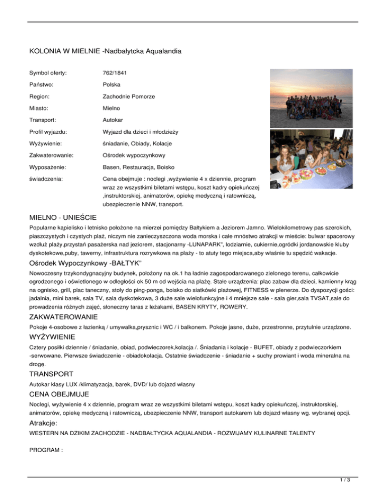 KOLONIA W MIELNIE -Nadbałytcka Aqualandia Symbol oferty: 762/1841 Państwo: Polska Region: Zachodnie Pomorze Miasto: Mielno Transport: Autokar Profil wyjazdu: Wyjazd dla dzieci i młodzieży Wyżywienie: śniadanie, Obiady, Kolacje Zakwaterowanie: Ośrodek wypoczynkowy Wyposażenie: Basen, Restauracja, Boisko świadczenia: Cena obejmuje : noclegi ,wyżywienie 4 x dziennie, program wraz ze wszystkimi biletami wstępu, koszt kadry opiekuńczej ,instruktorskiej, animatorów, opiekę medyczną i ratowniczą, ubezpieczenie NNW, transport. MIELNO - UNIEŚCIE Popularne kąpielisko i letnisko położone na mierzei pomiędzy Bałtykiem a Jeziorem Jamno. Wielokilometrowy pas szerokich, piaszczystych i czystych plaż, niczym nie zanieczyszczona woda morska i całe mnóstwo atrakcji w mieście: bulwar spacerowy wzdłuż plaży,przystań pasażerska nad jeziorem, stacjonarny -LUNAPARK”, lodziarnie, cukiernie,ogródki jordanowskie kluby dyskotekowe,puby, tawerny, infrastruktura rozrywkowa na plaży - to atuty tego miejsca,aby właśnie tu spędzić wakacje. Ośrodek Wypoczynkowy -BAŁTYK” Nowoczesny trzykondygnacyjny budynek, położony na ok.1 ha ładnie zagospodarowanego zielonego terenu, całkowicie ogrodzonego i oświetlonego w odległości ok.50 m od wejścia na plażę. Stałe urządzenia: plac zabaw dla dzieci, kamienny krąg na ognisko, grill, plac taneczny, stoły do ping-ponga, boisko do siatkówki plażowej, FITNESS w plenerze. Do dyspozycji gości: jadalnia, mini barek, sala TV, sala dyskotekowa, 3 duże sale wielofunkcyjne i 4 mniejsze sale - sala gier,sala TVSAT,sale do prowadzenia różnych zajęć, słoneczny taras z leżakami, BASEN KRYTY, ROWERY. ZAKWATEROWANIE Pokoje 4-osobowe z łazienką / umywalka,prysznic i WC / i balkonem. Pokoje jasne, duże, przestronne, przytulnie urządzone. WYŻYWIENIE Cztery posiłki dziennie / śniadanie, obiad, podwieczorek,kolacja /. Śniadania i kolacje - BUFET, obiady z podwieczorkiem -serwowane. Pierwsze świadczenie - obiadokolacja. Ostatnie świadczenie - śniadanie + suchy prowiant i woda mineralna na drogę. TRANSPORT Autokar klasy LUX /klimatyzacja, barek, DVD/ lub dojazd własny CENA OBEJMUJE Noclegi, wyżywienie 4 x dziennie, program wraz ze wszystkimi biletami wstępu, koszt kadry opiekuńczej, instruktorskiej, animatorów, opiekę medyczną i ratowniczą, ubezpieczenie NNW, transport autokarem lub dojazd własny wg. wybranej opcji. Atrakcje: WESTERN NA DZIKIM ZACHODZIE - NADBAŁTYCKA AQUALANDIA - ROZWIJAMY KULINARNE TALENTY PROGRAM : 1/3 PRZYGODA W KOŁOBRZEGU CAŁODZIENNA WYCIECZKA AUTOKAROWA z przewodnikiem do KOŁOBRZEGU MARSZRUTA SZLAKIEM KOŁOBRZESKICH ATRAKCJI z przewodnikiem: PORT PASAŻERSKI I RYBACKI, PROMENADA Festiwal Cukrowej Waty, Park Uzdrowiskowy z Amfiteatrem, Ratusz, Bazylika Mariacka, Muzeum Oręża Polskiego, molo. W ŚWIECIE KOWBOJÓW I INDIAN - zajęcia na terenie ośrodka oraz w Miasteczku WESTERN CITY Blade Twarze - przyjacielem Indian - poznanie indiańskich tradycji Budowanie -Wioski Indian” - stawianie wigwamu i budowa totemu Zwiedzanie Wioski Indiańskiej i mini ZOO w ZIELENIEWIE Na wojennej ścieżce - ćwiczenie sprawności wojowników Westernowa scenka - napad na bank Pokazy kaskaderskie kowbojów na koniach Spotkanie z Mustangiem i Ciemnym w salonie Ćwiczenia w rzucaniu lassem i strzelaniu z bicza SESJE ZDJĘCIOWE w strojach Indian i Kowbojów KALEJDOSKOP ATRAKCJI MIELNA - piesze eskapady Spacer nadmorską promenadą - wakacyjne jarmarki, relaks przy fontannie. Przystań rybacka - Praca rybaków na łodziach i w sieciarniach. Pomnik Morsa- symbol Międzynarodowych Zlotów Morsów, Pomnik Jelenia - pamiątka udanego polowania stoi w Mielnie ok.100 lat JEZIORO JAMNO - powstałe z dawnej zatoki morskiej, Rejs statkiem -MILA” z przystani TRAMP po Jeziorze Jamno WODNE IMPRESJE - zajęcia na krytym basenie Zachowanie w wodzie i nad wodą - zajęcia prowadzone przez ratownika Rozgrywki w piłkę wodną AQUAAEROBIC - ćwiczenia w basenie Wodne Igraszki - piłka wodna na basenie AQUAOLIMPIADA - zawody pływackie o tytuł SYRENKI i DELFINA , MASTERCHEF JUNIOR - KULINARNY ZAWRÓT GŁOWY Rozwijamy kulinarne talenty przyszłych Mistrzów Kuchni WIECZORNY KLUB KINOMANIAKA - projekcja filmów o tematyce kulinarnej OTWÓRZ BUZIĘ, ZAMKNIJ OCZY I ROZPOZNAJ CO CI WSKOCZY OWOCOWY AMULET - Projektowanie oryginalnych amuletów z owoców i warzyw ABC DOBREGO ZACHOWANIA PRZY STOLE - Elementy Savoir-Vivre’u ŚPIEWANIE NA ŚNIADANIE - konkurs na piosenkę/wierszyk o ulubionej potrawie KUCHENNE AKROBACJE - konkurs na najsmakowitszą przekąskę NA ZAKOŃCZENIE UCZESTNICY OTRZYMUJĄ UPOMINEK MASTER CHEFA I DYPLOM SMAKOSZA WARSZTATY PLASTYCZNE SZTUKA UŻYTKOWA - prezenty z wakacji - barwne inspiracje na gipsowych formach KREDKAMI I FARBĄ - rysunek w plenerze -nauka przedstawienia perspektywy i proporcji WAKACYJNA BIŻUTERIA - tworzenie kolii ,naszyjników i bransolet z darów natury OBRAZY MOZAIKOWE -fantazyjne pocztówki wakacyjne RUCH I GWAR TO ZABAWY CZAR Kąpiele słoneczne i morskie pod opieką ratownika ZGADUJ-ZGADULA gdzie utonie ZŁOTA KULA ? - wieczorny spacer na plażę, DISKOPOLOWANIE w MIELNIE: m.in. Bal Przebierańców, Pidżam Party, Tańce wśród piratów BALONOWE ZOO - modelowanie baloników - balonowe zwierzątka 2/3 TĘCZOWY FESTYN - pokazy wielkich baniek mydlanych ŚWIĘTO PIECZONEJ KIEŁBASKI - BIESIADA przy ognisku z quizami i konkursami CRAYZY CLUB - malowanie buzi , latające lampiony , wesoła maskotka , DISCO na trawie. MALOWANE KAMIENIE - barwne inspiracje WAKACYJNA OLIMPIADA SPORTOWA - zawody i turnieje GRY I ZABAWY : survivalowy chrzest kolonijny, NEPTUNALIA, wybory Najmilszej i Najmilszego, Bal u Prozerpiny, ”randka w ciemno”, poczta francuska ,pokaz letnich fryzur -Łamigłówki zabawy dla mądrej główki - - zagadki, rebusy, krzyżówki KONKURSY z nagrodami : plastyczny - WAKACJE Z PĘDZLAMI” , śmieszne rymowanki budowle i rzeźba w piasku, piosenka żeglarska, letnie tatuaże , opiek