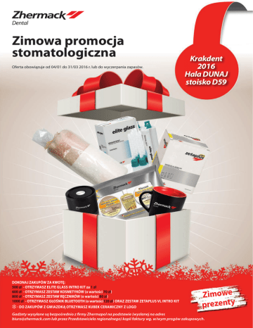 Zimowa promocja stomatologiczna Oferta obowiązuje od 04/01 do 31/03 2016 r. lub do wyczerpania zapasów. DOKONAJ ZAKUPÓW ZA KWOTĘ: 500 zł - OTRZYMASZ ELITE GLASS INTRO KIT za 1 zł 600 zł - OTRZYMASZ ZESTAW KOSMETYKÓW (o wartości 70 zł) 800 zł - OTRZYMASZ ZESTAW RĘCZNIKÓW (o wartości 80 zł) 1000 zł - OTRZYMASZ GŁOŚNIK BLUETOOTH (o wartości120 zł) ORAZ ZESTAW ZETAPLUS VL INTRO KIT - DO ZAKUPÓW Z GWIAZDKĄ OTRZYMASZ KUBEK CERAMICZNY Z LOGO ❄ Krakdent 2016 Hala DUNAJ stoisko D59 Zimowe prezenty Gadżety wysyłane są bezpośrednio z firmy Zhermapol na podstawie (wysłanej na adres [email protected] lub przez Przedstawiciela regionalnego) kopii faktury wg. w/wym progów zakupowych. hydrorise Niezawodne i precyzyjne o zwiększonej hydrofilności silikony typu A linii Hydrorise przeznaczone są do wszystkich technik pobierania wycisków w każdej sytuacji klinicznej. Szeroka linia mas wyciskowych Hydrorise umożliwia zastosowanie różnego stopnia lepkości w zależności od danego przypadku oraz dobranie właściwego czasu wiązania w zależności od potrzeb. Hydrorise Light/Regular Body 2 x 50ml Hydrorise Putty 2 x 300ml 249,00 zł 139,00 zł 268,00 zł 150,00 zł ❄ Hydrorise Maxi Monophase 2x380ml ❄ Hydrorise Maxi Putty 2 x 380ml A-silikony 449,00 zł 429,00 zł 525,00 zł 454,00 zł elite hd+ Silikonowe masy wyciskowe typu A o zwiększonej hydrofilności! Efektywne, precyzyjne, preferowane przez elitę stomatologów! Elite HD+ Putty 2x 250 ml 199,00 zł 222,00 zł Elite HD+ Light/Regular Body 2x 50 ml 129,00 zł ❄ 141,00 zł Elite HD+ Putty 2 x (450 ml + 450 ml) 619,00 zł 675,00 zł zmack system Estetyczny i uniwersalny widoczny w RTG kompozyt światłoutwardzalny do uzupełniania ubytków w zębach przednich i bocznych. OFERTA SPECJALNA Kup 10 strzykawek Zmack a otrzymasz stojak na kompozyty za 1 zł. Zmack Comp Kit* / Zmack Comp Kit-0** 6 szt. x 4g + bond + etch + akcesoria + stojak na kompozyty za 1,00 zł (o wartości 59,00 zł) Kompozyty 371,00 zł 559,00 zł ❄ Zmack Comp Kit* / Zmack Comp Kit-0** Zmack Comp 4 g x 6 szt. + W CENIE Zmack Bond 4,5 ml / Zmack Comp&Flow Kit*** + stojak na kompozyty za 1 zł (o wartości 59,00 zł) Zmack Flow 1,3 g (dowolny kolor) 295,00 zł 299,00 zł 37,00 zł 399,00 zł 554,00 zł * Zmack Comp Kit: A1, A2, A3, A3,5, B1, B2, bond, wytrawiacz, akcesoria ** Zmack Comp Kit-0: A2,A3, A3.5, B1, A2-0, A3.5-0, bond, wytrawiacz, akcesoria *** Zmack Comp&Flow Kit: comp 2x A2, 2x A3 + flow A2, A3 + bond, wytrawiacz, akcesoria 50,00 zł Kup 4 strzykawki Zmack Comp 4 g w dowolnym kolorze, a otrzymasz dodatkową strzykawkę Zmack Comp 4 g lub Zmack Flow 1,3 g za 1 zł. 201,00 zł 250,00 zł occlufast rock Masa poliwinylosiloksanowa typu A do rejestracji stosunków przestrzennych między żuchwą a szczęką. Occlufast Rock (2x50 ml + 12 zielonych końcówek mieszających) 139,00 zł elite glass Transparentny silikon do polimeryzacji materiałów światłoutwardzalnych. Niezbędny w każdym gabinecie! Niezwykła przejrzystość materiału! Wysoka precyzja wycisków! Idealna twardość wykonanych form! Elite Glass Intro Kit 50 ml + 3 zielone końcówki mieszające + transparentna łyżka wyciskowa Elite Glass 2x 50 ml + 6 zielonych końcówek mieszających 79,00 zł 129,00 zł 130,00 zł 228,00 zł A-silikony 147,00 zł Alginaty i mieszalniki do mas wyciskowych hurrimix Automatyczny mieszalnik do alginatowych mas wyciskowych i gipsów. Hurrimix + W CENIE urządzenia 4x dowolne zestawy alginatów Intro Kit alghamix II Mechaniczny mieszalnik do alginatowych i silikonowych mas wyciskowych oraz do gipsu. 3999,00 zł 1595,00 zł Alghamix II + W CENIE urządzenia 2x dowolne zestawy alginatów Intro Kit 4559,00 zł 1970,00 zł C-silikony zetaplus Zestaw precyzyjnych silikonów typu C polecanych w technice wycisków dwuwarstwowych. Oranwash 140 ml 39,00 zł 45,00 zł Thixoflex 140 ml Indurent gel 60 ml 39,00 zł 45,00 zł 35,00 zł 43,00 zł Zetaplus Intro Kit 139,00 zł 157,00 zł *Zhermapol Sp. z o.o. zastrzega sobie prawo do wcześniejszego zakończenia promocji bez uprzedniego powiadomienia. Regionalni menadżerowie sprzedaży: Przedstawiciele regionalni: Seweryn Piekarczyk 698 644 160 województwa: kujawsko-pomorskie, mazowieckie, podlaskie, pomorskie, warmińsko-mazurskie, łódzkie Przemysław Weber 600 877 208 województwa: dolnośląskie, lubuskie, opolskie, wielkopolskie, zachodniopomorskie Robert Zaleśny 602 880 576 województwa: lubelskie, małopolskie, podkarpackie, śląskie, świętokrzyskie Andrzej Plakwicz 602 353 571 województwa: kujawsko-pomorskie, mazowieckie, podlaskie, pomorskie, warmińsko-mazurskie, łódzkie Marian Kwiatkowski 517 962 441 województwa: małopolskie, śląskie Ryszard Radoń 600 877 211 województwa: dolnośląskie, opolskie, wielkopolskie Janusz Kulwas 600 877 210 województwa: kujawsko-pomorskie, pomorskie, warmińsko-mazurskie Katarzyna Ziółkowska 600 877 212 województwa: lubelskie, podkarpackie, świętokrzyskie Zhermapol Sp. z o.o. ul. Augustówka 14, 02-981 Warszawa tel. +48 22 858 82 72, fax +48 22 642 07 14 www.zhermapol.pl