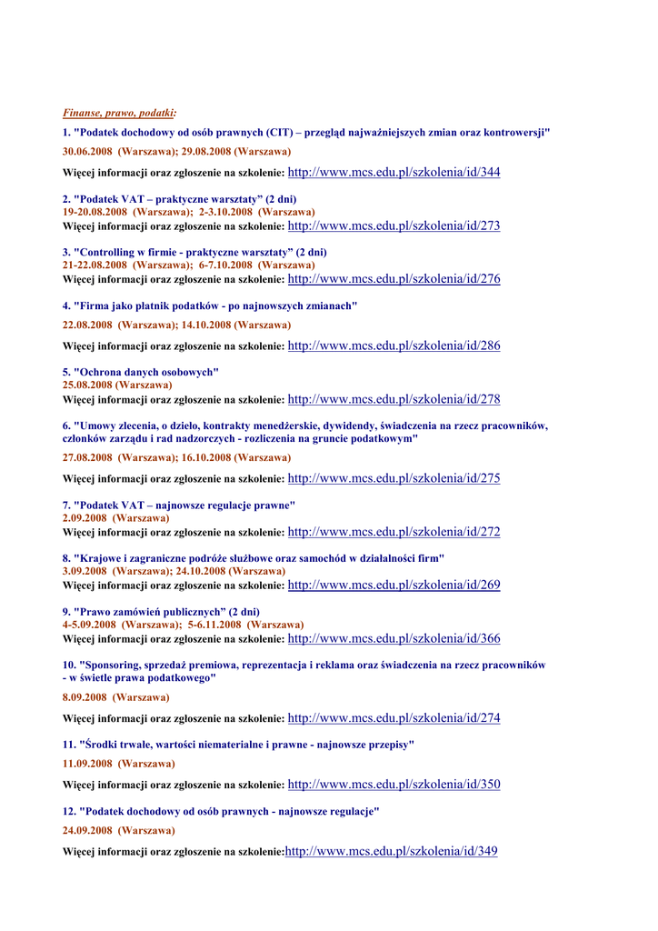 Finanse, prawo, podatki: 1. "Podatek dochodowy od osób prawnych (CIT) – przegląd najwaŜniejszych zmian oraz kontrowersji" 30.06.2008 (Warszawa); 29.08.2008 (Warszawa) Więcej informacji oraz zgłoszenie na szkolenie: http://www.mcs.edu.pl/szkolenia/id/344 2. "Podatek VAT – praktyczne warsztaty” (2 dni) 19-20.08.2008 (Warszawa); 2-3.10.2008 (Warszawa) Więcej informacji oraz zgłoszenie na szkolenie: http://www.mcs.edu.pl/szkolenia/id/273 3. "Controlling w firmie - praktyczne warsztaty” (2 dni) 21-22.08.2008 (Warszawa); 6-7.10.2008 (Warszawa) Więcej informacji oraz zgłoszenie na szkolenie: http://www.mcs.edu.pl/szkolenia/id/276 4. "Firma jako płatnik podatków - po najnowszych zmianach" 22.08.2008 (Warszawa); 14.10.2008 (Warszawa) Więcej informacji oraz zgłoszenie na szkolenie: http://www.mcs.edu.pl/szkolenia/id/286 5. "Ochrona danych osobowych" 25.08.2008 (Warszawa) Więcej informacji oraz zgłoszenie na szkolenie: http://www.mcs.edu.pl/szkolenia/id/278 6. "Umowy zlecenia, o dzieło, kontrakty menedŜerskie, dywidendy, świadczenia na rzecz pracowników, członków zarządu i rad nadzorczych - rozliczenia na gruncie podatkowym" 27.08.2008 (Warszawa); 16.10.2008 (Warszawa) Więcej informacji oraz zgłoszenie na szkolenie: http://www.mcs.edu.pl/szkolenia/id/275 7. "Podatek VAT – najnowsze regulacje prawne" 2.09.2008 (Warszawa) Więcej informacji oraz zgłoszenie na szkolenie: http://www.mcs.edu.pl/szkolenia/id/272 8. "Krajowe i zagraniczne podróŜe słuŜbowe oraz samochód w działalności firm" 3.09.2008 (Warszawa); 24.10.2008 (Warszawa) Więcej informacji oraz zgłoszenie na szkolenie: http://www.mcs.edu.pl/szkolenia/id/269 9. "Prawo zamówień publicznych” (2 dni) 4-5.09.2008 (Warszawa); 5-6.11.2008 (Warszawa) Więcej informacji oraz zgłoszenie na szkolenie: http://www.mcs.edu.pl/szkolenia/id/366 10. "Sponsoring, sprzedaŜ premiowa, reprezentacja i reklama oraz świadczenia na rzecz pracowników - w świetle prawa podatkowego" 8.09.2008 (Warszawa) Więcej informacji oraz zgłoszenie na szkolenie: http://www.mcs.edu.pl/szkolenia/id/274 11. "Środki trwałe, wartości niematerialne i prawne - najnowsze przepisy" 11.09.2008 (Warszawa) Więcej informacji oraz zgłoszenie na szkolenie: http://www.mcs.edu.pl/szkolenia/id/350 12. "Podatek dochodowy od osób prawnych - najnowsze regulacje" 24.09.2008 (Warszawa) Więcej informacji oraz zgłoszenie na szkolenie:http://www.mcs.edu.pl/szkolenia/id/349 Prawo pracy i ubezpieczenia społeczne: 1. "Rozliczenia z ZUS przez Internet - nowy przekaz elektroniczny w programie Płatnik" 25.06.2008 (Warszawa) Więcej informacji oraz zgłoszenie na szkolenie: http://www.mcs.edu.pl/szkolenia/id/374 2. "WARSZTATY PRAWA PRACY (3 dni / Ustroń) - nawiązywanie i rozwiązywanie stosunku pracy, czas pracy, urlopy wypoczynkowe oraz wynagrodzenie za pracę" 26-28.06.2008 (Ustroń / k. Katowic); 25-27.09.2008 (Ustroń / k. Katowic) Więcej informacji oraz zgłoszenie na szkolenie: http://www.mcs.edu.pl/szkolenia/id/307 3. "Kodeks pracy - po najnowszych zmianach" 1.09.2008 (Warszawa); 8.10.2008 (Warszawa) Więcej informacji oraz zgłoszenie na szkolenie: http://www.mcs.edu.pl/szkolenia/id/279 4. "Ubezpieczenia społeczne i składki ZUS – obowiązujące przepisy" 10.09.2008 (Warszawa); 17.10.2008 (Warszawa) Więcej informacji oraz zgłoszenie na szkolenie: http://www.mcs.edu.pl/szkolenia/id/335 5. "Czas pracy oraz urlopy wypoczynkowe - obowiązujące przepisy" 12.09.2008 (Warszawa); 21.10.2008 (Warszawa) Więcej informacji oraz zgłoszenie na szkolenie: http://www.mcs.edu.pl/szkolenia/id/280 6. "Świadczenia w razie choroby i macierzyństwa oraz świadczenia rodzinne" 18.09.2008 (Warszawa); 20.10.2008 (Warszawa) Więcej informacji oraz zgłoszenie na szkolenie: http://www.mcs.edu.pl/szkolenia/id/355