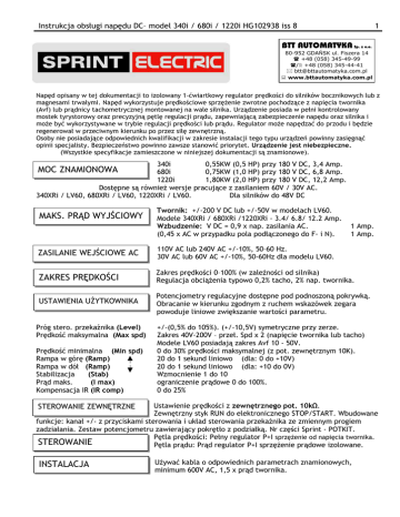 Instrukcja obsługi napędu DC– model 340i / 680i / 1220i HG102938 iss 8 1 BTT AUTOMATYKA Sp. z o.o. 80-952 GDAŃSK ul. Fiszera 14 +48 (058) 345-49-99 / +48 (058) 345-44-41 [email protected] www.bttautomatyka.com.pl Napęd opisany w tej dokumentacji to izolowany 1-ćwiartkowy regulator prędkości do silników bocznikowych lub z magnesami trwałymi. Napęd wykorzystuje prędkościowe sprzęŜenie zwrotne pochodzące z napięcia twornika (Avf) lub prądnicy tachometrycznej montowanej na wale silnika. Urządzenie posiada w pełni kontrolowany mostek tyrystorowy oraz precyzyjną pętlę regulacji prądu, zapewniającą zabezpieczenie napędu oraz silnika i moŜe być wykorzystywane w trybie regulacji prędkości lub prądu. Regulator moŜe napędzać do przodu i będzie regenerował w przeciwnym kierunku po przez siłę zewnętrzną. Osoby nie posiadające odpowiednich kwalifikacji w zakresie instalacji tego typu urządzeń powinny zasięgnąć opinii specjalisty. Bezpieczeństwo powinno zawsze stanowić priorytet. Urządzenie jest niebezpieczne. (Wszystkie specyfikacje zamieszczone w niniejszej dokumentacji są znamionowe). 340i 0,55KW (0,5 HP) przy 180 V DC, 3,4 Amp. 680i 0,75KW (1,0 HP) przy 180 V DC, 6,8 Amp. 1220i 1,80KW (2,0 HP) przy 180 V DC, 12,2 Amp. Dostępne są równieŜ wersje pracujące z zasilaniem 60V / 30V AC. 340XRi / LV60, 680XRi / LV60, 1220XRi / LV60. Dla silników do 48V DC MOC ZNAMIONOWA MAKS. PRĄD WYJŚCIOWY Twornik: +/-200 V DC lub +/-50V w modelach LV60. Modele 340XRi / 680XRi /1220XRi - 3.4/ 6.8/ 12.2 Amp. Wzbudzenie: V DC = 0,9 x nap. zasilania AC. (0,45 x AC w przypadku pola podłączonego do F- i N). 1 Amp. 1 Amp. ZASILANIE WEJŚCIOWE AC 110V AC lub 240V AC +/-10%, 50–60 Hz. 30V AC lub 60V AC +/-10%, 50-60Hz dla modelu LV60. ZAKRES PRĘDKOŚCI Zakres prędkości 0–100% (w zaleŜności od silnika) Regulacja obciąŜenia typowo 0,2% tacho, 2% nap. twornika. USTAWIENIA UśYTKOWNIKA Potencjometry regulacyjne dostępne pod podnoszoną pokrywką. Obracanie w kierunku zgodnym z ruchem wskazówek zegara powoduje liniowe zwiększanie wartości parametru. Próg stero. przekaźnika (Level) Prędkość maksymalna (Max spd) Prędkość minimalna (Min spd) Rampa w górę (Ramp) Rampa w dół (Ramp) Stabilizacja (Stab) Prąd maks. (I max) Kompensacja IR (IR comp) +/-(0,5% do 105%). (+/-10,5V) symetryczne przy zerze. Zakres 40V-200V – przeł. Spd x 2 (napięcie twornika lub tacho) Modele LV60 posiadają zakres Avf 10 - 50V. 0 do 30% prędkości maksymalnej (z pot. zewnętrznym 10K). 20 do 1 sekund liniowo (dla: 0 do +10V) 20 do 1 sekund liniowo (dla: +10 do 0V) Wzmocnienie 1 do 10 ograniczenie prądowe 0 do 100%. 0 do 25% Ustawienie prędkości z zewnętrznego pot. 10kΩ. Zewnętrzny styk RUN do elektronicznego STOP/START. Wbudowane funkcje: kanał +/- z przyciskami sterowania i układ sterowania przekaźnika ze zmiennym progiem zadziałania. Zestaw potencjometru zawierający pokrętło z podziałką. Nr części Sprint - POTKIT. Pętla prędkości: Pełny regulator P+I sprzęŜenie od napięcia twornika. STEROWANIE Pętla prądu: Prąd regulator P+I sprzęŜenie prądowe izolowane. STEROWANIE ZEWNĘTRZNE INSTALACJA UŜywać kabla o odpowiednich parametrach znamionowych, minimum 600V AC, 1,5 x prąd twornika. 2 Instrukcja obsługi napędu DC– model 340i / 680i / 1220i WYMAGANIA DOT. BEZPIECZNIKÓW Bezpieczniki półprzewodnikowe Sprint Electric. Bezpiecznik 20A 6 X 32 CH00620A Rozłącznik bezpiecznikowy 6 X 32 CP102071 Klips na szynę DIN roz. bezpiecznikowego FE101969 Odpowiedni do wykorzystania w obwodach, dla których prąd wyjściowy nie przekracza symetrycznie 5000A RMS, z bezpiecznikiem klasy Ar. UWAGA Urządzenie musi zostać zabezpieczone po przez zainstalowanie zewnętrznego bezpiecznika półprzewodnikowego zasilania AC o wartości znamionowej I2t poniŜej 150 A2s. SYGNAŁY STEROWANIA Przewody sygnałów sterowania są odizolowane od przewodów zasilania, a urządzenie moŜe być podłączane do innych przyrządów izolowanych. Jednostka została zaprojektowana do umieszczenia w szynie DIN. NaleŜy unikać wibracji oraz temperatury otoczenia poza zakresem od –10 do +40C. Chronić urządzenie przed zanieczyszczeniem. Upewnić się, Ŝe istnieje odpowiedni dopływ świeŜego powietrza, w celu chłodzenia urządzenia oraz obudowy, w której jest umieszczone (straty mocy w W = 5 x prąd twornika). ELEMENTY MECHANICZNE Silniki montowane na łapach muszą być wypoziomowane i zabezpieczone. NaleŜy zwrócić uwagę, aby jakiekolwiek ciała obce nie dostały się do silnika podczas instalacji. Dokładnie wyrównać wał silnika ze sprzęgłami. Nie wbijać kół pasowych lub sprzęgieł na wał silnika za pomocą młotka. Przed uruchomieniem silnika sprawdzić elementy wymienione w poniŜszej liście działań kontrolnych (Uwaga: wcześniej naleŜy odłączyć zasilanie). 1) Sprawdzić prawidłowość izolacji pomiędzy uzwojeniami silnika a ziemią. Rozłączyć wszystkie przewody napędu. 2) Sprawdzić, czy w wewnętrznej skrzynce rozdzielczej nie znajdują się jakiekolwiek ciała obce, uszkodzone końcówki itp. 3) Sprawdzić, czy szczotki znajdują się w dobrym stanie, są prawidłowo załoŜone i czy moŜna nimi swobodnie ‘poruszać’. Sprawdzić prawidłowe funkcjonowanie spręŜyn szczotek. 4) Otwory wentylacyjne silnika nie mogą być zatkane – przed uruchomieniem silnika naleŜy zdjąć osłony zabezpieczające. SILNIK ZASILANIE AC Aby uniknąć uszkodzenia, upewnić się, Ŝe przełącznik zasilania w urządzeniu jest ustawiony na odpowiednią wartość napięcia zasilania 110V lub 240V AC. W przypadku modeli LV60 30V lub 60V AC. Ustawić wartość I max (Prąd maks.) tak, aby mniej więcej odpowiadała ustawieniom znamionowym twornika silnika. Obrót do końca w kierunku zgodnym z ruchem wskazówek zegara odpowiada ustawieniu 100% wartości znamionowej (340i 3,4A, 680i 6,8A, 1220i 12,2A). Obrót do końca w kierunku przeciwnym odpowiada ustaw