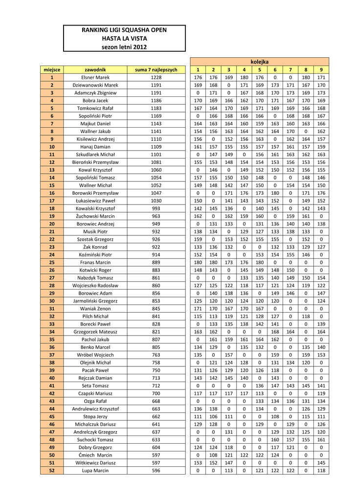 RANKING LIGI SQUASHA OPEN HASTA LA VISTA sezon letni 2012 kolejka miejsce 1 2 3 4 5 6 7 8 9 10 11 12 13 14 15 16 17 18 19 20 21 22 23 24 25 26 27 28 29 30 31 32 33 34 35 36 37 38 39 40 41 42 43 44 45 46 47 48 49 50 51 52 zawodnik Elsner Marek Dziewanowski Marek Adamczyk Zbigniew Bobra Jacek Tomkowicz Rafał Sopoliński Piotr Majkut Daniel Wallner Jakub Kisilewicz Andrzej Hanaj Damian Szkudlarek Michał Bieroński Przemysław Kowal Krzysztof Sopoliński Tomasz Wallner Michał Borowski Przemysław Łukasiewicz Paweł Kowalski Krzysztof Żuchowski Marcin Borowiec Andrzej Musik Piotr Szostak Grzegorz Żak Konrad Koźmiński Piotr Franas Marcin Kotwicki Roger Nabzdyk Tomasz Wojcieszko Radosław Borowiec Adam Jarmoliński Grzegorz Waniak Zenon Pilch Michał Borecki Paweł Grzegorzek Mateusz Pachol Jakub Benko Marcel Wróbel Wojciech Olejnik Michał Pacak Paweł Rejczak Damian Seta Tomasz Czapski Mariusz Ozga Rafał Andrulewicz Krzysztof Stopa Jerzy Michalczuk Dariusz Andrelczyk Grzegorz Suchocki Tomasz Dobry Grzegorz Ćmiech Marcin Witkiewicz Dariusz Lupa Marcin suma 7 najlepszych 1228 1191 1191 1186 1183 1169 1143 1141 1110 1109 1101 1081 1060 1054 1052 1047 1030 993 963 949 932 926 922 914 889 883 861 860 856 853 845 841 828 821 807 805 763 758 750 713 712 700 668 663 662 641 637 633 604 597 597 596 1 176 169 0 170 167 0 164 154 156 161 0 155 0 157 149 0 150 142 162 0 138 159 133 152 180 148 0 127 0 125 171 115 0 163 0 134 135 0 131 143 0 117 0 136 111 129 0 0 124 0 153 0 2 176 168 171 169 164 166 163 156 0 157 147 153 146 155 148 0 0 145 0 131 134 0 136 154 180 143 0 125 140 120 170 113 133 162 161 129 0 121 126 142 0 117 0 138 106 128 0 0 124 108 152 0 3 169 0 0 166 170 168 164 163 152 155 149 148 0 150 142 171 141 136 162 133 0 153 132 0 173 0 0 122 138 120 167 119 135 0 159 0 157 124 129 145 0 117 0 0 111 0 131 0 118 121 147 113 4 180 171 167 162 169 166 160 164 156 155 0 154 149 150 147 176 143 0 159 0 129 152 0 0 176 145 133 118 136 124 170 121 138 0 161 135 0 128 120 140 0 117 0 0 0 0 0 0 0 122 0 0 5 176 169 168 170 171 166 159 162 163 157 156 154 152 148 150 173 143 140 160 131 127 155 0 153 180 149 135 117 0 120 167 128 142 0 164 132 0 0 126 0 136 113 133 134 0 129 0 0 0 122 0 121 6 0 173 170 171 169 0 163 164 0 157 161 153 150 0 0 180 152 145 0 136 133 155 132 154 0 148 140 121 149 120 0 127 141 168 162 0 159 131 118 143 147 0 134 0 108 0 129 160 117 124 0 122 7 0 171 173 167 169 168 160 170 162 161 163 156 152 0 154 0 0 0 159 140 138 0 133 155 0 150 149 124 146 0 0 0 0 164 0 0 0 134 0 0 143 0 136 0 0 129 132 157 121 0 0 122 8 180 167 169 170 166 168 163 0 164 157 162 153 156 148 154 171 149 142 161 140 133 152 129 146 0 0 150 119 0 0 0 118 0 0 0 135 159 120 0 0 145 0 131 126 115 0 125 155 0 0 0 0 9 171 170 173 169 168 167 166 162 157 159 163 156 155 146 150 176 152 143 0 138 0 0 127 0 0 0 154 122 147 124 0 0 139 164 0 140 153 0 0 0 141 119 134 129 111 126 120 161 0 0 145 118 RANKING LIGI SQUASHA OPEN HASTA LA VISTA sezon letni 2012 kolejka miejsce 53 54 55 56 57 58 59 60 61 62 63 64 65 66 67 68 69 70 71 72 73 74 75 76 77 78 79 80 81 82 83 84 85 86 87 88 89 90 91 92 93 94 95 96 97 98 99 100 101 102 103 104 zawodnik Kowalewski Konrad Wachowska Aneta Zemke Aleksander Kowalewski Jacek Zelmozer Michał Pawlik Zbigniew Krupa Adrian Podbielski Paweł Grabowski Jacek Jura Michał Zarówna Klaudyna Monczak Krzysztof Witek Piotr Świstek Grzegorz Rumak Tomasz Terek Fabrice Wiercigroch Krzysztof Kabath Piotr Macalis Aksel Firlej Sławomir Majewski Rafał Słociński Michał Regulski Michał Pląskowski Tomasz Kałędkiewicz Tomasz Małecki Paweł Fulneczek Adrian Szewczuk Paweł Dobosiewicz Robert Spławski Piotr Barycki Mateusz Mendyka Bartosz Sawczuk Grzegorz Wróbel Tomasz Imirowicz Marcin Swoboda Szymon Maciejewski Łuakasz Jędrysiak Sylwester Raczyński Rafał Ganczarski Marcin Koźmiński Michał Woźniak Krzysztof Hyżyk Sławomir Pajor Grzegorz Jaworowska Barbara Cebula Grzegorz Migoń Tomasz Winnik Grzegorz Czaus Grzegorz Madej Jakub Bulczyński Rafał Waniak Igor suma 7 najlepszych 585 580 563 532 529 520 515 509 502 493 487 465 465 458 447 439 437 431 427 415 403 384 374 371 362 342 334 327 324 317 303 289 286 281 279 274 256 245 241 229 226 222 220 218 215 208 173 173 167 166 160 153 1 0 120 141 0 0 0 132 128 168 121 0 0 0 113 0 0 0 0 145 0 0 0 0 126 0 0 0 0 0 0 0 0 147 0 0 140 0 0 122 0 0 0 0 0 0 0 0 173 0 166 0 0 2 0 0 0 0 0 0 127 0 0 122 0 112 159 115 0 150 0 0 141 0 0 0 0 0 0 0 0 0 0 0 149 0 139 0 0 0 0 0 119 0 0 0 0 0 0 0 173 0 0 0 0 0 3 0 0 0 0 0 128 131 126 0 0 0 115 156 0 0 143 0 0 0 0 0 0 0 125 0 0 0 0 161 160 154 0 0 139 0 134 0 0 0 0 0 0 0 0 0 0 0 0 0 0 0 0 4 0 113 141 0 0 131 125 126 168 0 0 119 150 0 146 0 0 0 0 0 0 0 0 0 0 0 0 0 163 157 0 142 0 0 0 0 0 0 0 0 115 0 0 0 0 0 0 0 0 0 0 153 5 0 0 139 0 0 0 0 0 0 124 161 119 0 115 145 146 0 0 141 138 0 0 0 0 0 0 0 0 0 0 0 147 0 0 0 0 0 0 0 0 0 0 0 0 111 0 0 0 0 0 0 0 6 142 113 142 0 176 0 0 0 166 126 0 0 0 115 156 0 0 146 0 139 0 128 119 0 114 112 0 106 0 0 0 0 0 0 138 0 0 0 0 0 111 0 0 0 104 0 0 0 167 0 0 0 7 148 119 0 176 180 0 0 129 0 0 166 0 0 0 0 0 145 147 0 0 135 131 128 120 126 0 117 0 0 0 0 0 0 0 141 0 0 0 0 0 0 0 0 0 0 0 0 0 0 0 0 0 8 147 0 0 176 173 128 0 0 0 0 0 0 0 0 0 0 143 138 0 138 136 0 127 0 122 117 111 113 0 0 0 0 0 0 0 0 121 114 0 112 0 110 106 108 0 104 0 0 0 0 160 0 9 148 115 0 180 0 133 0 0 0 0 160 0 0 0 0 0 149 0 0 0 132 125 0 0 0 113 106 108 0 0 0 0 0 142 0 0 135 131 0 117 0 112 114 110 0 104 0 0 0 0 0 0 RANKING LIGI SQUASHA OPEN HASTA LA VISTA sezon letni 2012 kolejka miejsce 105 106 107 108 109 110 111 112 113 114 115 116 117 118 119 120 121 122 123 124 zawodnik Gorzelany Piotr Lipiński Daniel Naglik Dominik Pietrzak Rafał Horodeński Piotr Engel Daniel Jetz Karol Bredschneider Michał Homiak Bogdan Woziński Łukasz Pułka Marek Woziński Robert Zatorski Leszek Tomaszewski Jakub Czarnecki Bartosz Klecuń Marek Popów Marcin Majewska Anna Derucki Marcin Kulisiewicz Jan suma 7 najlepszych 148 1