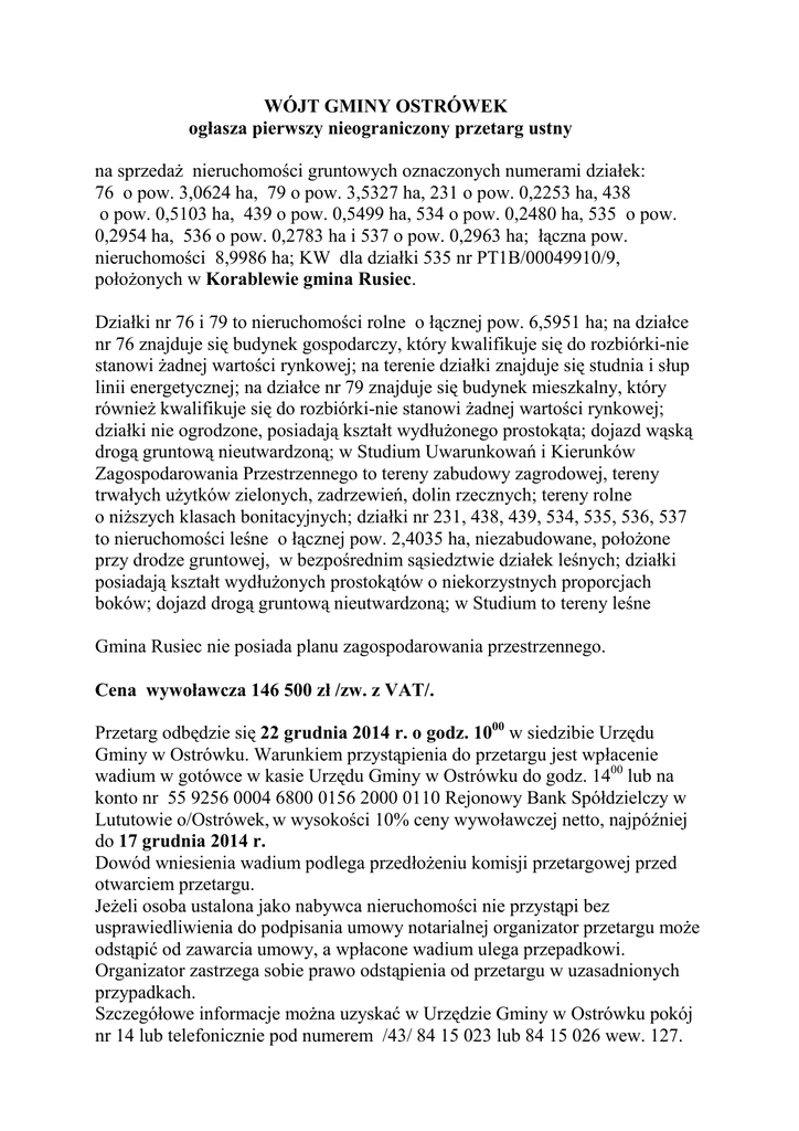 WÓJT GMINY OSTRÓWEK ogłasza pierwszy nieograniczony przetarg ustny na sprzedaż nieruchomości gruntowych oznaczonych numerami działek: 76 o pow. 3,0624 ha, 79 o pow. 3,5327 ha, 231 o pow. 0,2253 ha, 438 o pow. 0,5103 ha, 439 o pow. 0,5499 ha, 534 o pow. 0,2480 ha, 535 o pow. 0,2954 ha, 536 o pow. 0,2783 ha i 537 o pow. 0,2963 ha; łączna pow. nieruchomości 8,9986 ha; KW dla działki 535 nr PT1B/00049910/9, położonych w Korablewie gmina Rusiec. Działki nr 76 i 79 to nieruchomości rolne o łącznej pow. 6,5951 ha; na działce nr 76 znajduje się budynek gospodarczy, który kwalifikuje się do rozbiórki-nie stanowi żadnej wartości rynkowej; na terenie działki znajduje się studnia i słup linii energetycznej; na działce nr 79 znajduje się budynek mieszkalny, który również kwalifikuje się do rozbiórki-nie stanowi żadnej wartości rynkowej; działki nie ogrodzone, posiadają kształt wydłużonego prostokąta; dojazd wąską drogą gruntową nieutwardzoną; w Studium Uwarunkowań i Kierunków Zagospodarowania Przestrzennego to tereny zabudowy zagrodowej, tereny trwałych użytków zielonych, zadrzewień, dolin rzecznych; tereny rolne o niższych klasach bonitacyjnych; działki nr 231, 438, 439, 534, 535, 536, 537 to nieruchomości leśne o łącznej pow. 2,4035 ha, niezabudowane, położone przy drodze gruntowej, w bezpośrednim sąsiedztwie działek leśnych; działki posiadają kształt wydłużonych prostokątów o niekorzystnych proporcjach boków; dojazd drogą gruntową nieutwardzoną; w Studium to tereny leśne Gmina Rusiec nie posiada planu zagospodarowania przestrzennego. Cena wywoławcza 146 500 zł /zw. z VAT/. Przetarg odbędzie się 22 grudnia 2014 r. o godz. 1000 w siedzibie Urzędu Gminy w Ostrówku. Warunkiem przystąpienia do przetargu jest wpłacenie wadium w gotówce w kasie Urzędu Gminy w Ostrówku do godz. 1400 lub na konto nr 55 9256 0004 6800 0156 2000 0110 Rejonowy Bank Spółdzielczy w Lututowie o/Ostrówek, w wysokości 10% ceny wywoławczej netto, najpóźniej do 17 grudnia 2014 r. Dowód wniesienia wadium podlega przedłożeniu komisji przetargowej przed otwarciem przetargu. Jeżeli osoba ustalona jako nabywca nieruchomości nie przystąpi bez usprawiedliwienia do podpisania umowy notarialnej organizator przetargu może odstąpić od zawarcia umowy, a wpłacone wadium ulega przepadkowi. Organizator zastrzega sobie prawo odstąpienia od przetargu w uzasadnionych przypadkach. Szczegółowe informacje można uzyskać w Urzędzie Gminy w Ostrówku pokój nr 14 lub telefonicznie pod numerem /43/ 84 15 023 lub 84 15 026 wew. 127.