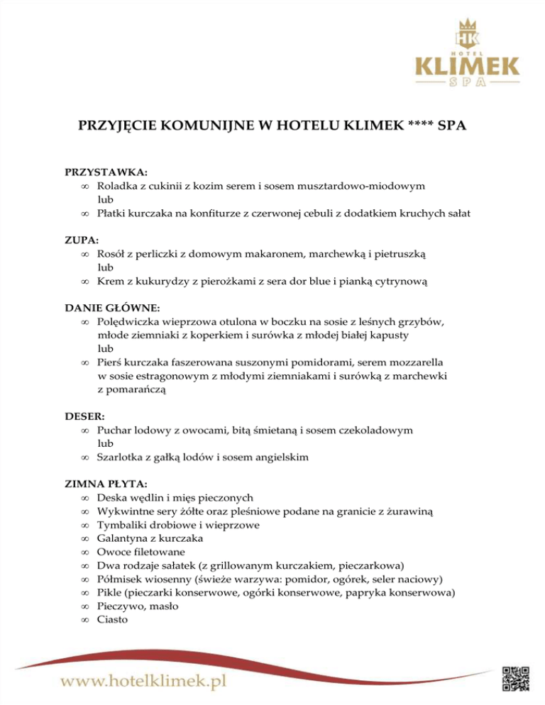 PRZYJĘCIE KOMUNIJNE W HOTELU KLIMEK **** SPA PRZYSTAWKA: • Roladka z cukinii z kozim serem i sosem musztardowo-miodowym lub • Płatki kurczaka na konfiturze z czerwonej cebuli z dodatkiem kruchych sałat ZUPA: • Rosół z perliczki z domowym makaronem, marchewką i pietruszką lub • Krem z kukurydzy z pierożkami z sera dor blue i pianką cytrynową DANIE GŁÓWNE: • Polędwiczka wieprzowa otulona w boczku na sosie z leśnych grzybów, młode ziemniaki z koperkiem i surówka z młodej białej kapusty lub • Pierś kurczaka faszerowana suszonymi pomidorami, serem mozzarella w sosie estragonowym z młodymi ziemniakami i surówką z marchewki z pomarańczą DESER: • Puchar lodowy z owocami, bitą śmietaną i sosem czekoladowym lub • Szarlotka z gałką lodów i sosem angielskim ZIMNA PŁYTA: • Deska wędlin i mięs pieczonych • Wykwintne sery żółte oraz pleśniowe podane na granicie z żurawiną • Tymbaliki drobiowe i wieprzowe • Galantyna z kurczaka • Owoce filetowane • Dwa rodzaje sałatek (z grillowanym kurczakiem, pieczarkowa) • Półmisek wiosenny (świeże warzywa: pomidor, ogórek, seler naciowy) • Pikle (pieczarki konserwowe, ogórki konserwowe, papryka konserwowa) • Pieczywo, masło • Ciasto DANIE GORĄCE: • Paprykarz wieprzowy z kluskami kładzionymi lub • Boeuf Stroganow NAPOJE ZIMNE: • Soki w dzbankach • Napoje gazowane • Woda mineralna w dzbankach NAPOJE GORĄCE: • Kawa • Herbata Dostosowując się do Państwa indywidualnych potrzeb Hotel Klimek **** SPA oferuje dodatkowe możliwości: • możliwość skomponowania własnego menu • możliwość zamówienia specjalnego tortu • możliwość stworzenia unikalnej atmosfery (stworzenia klimatycznego wystroju poprzez odpowiednią muzykę, aranżację w postaci kwiatów i innych elementów wystroju, zależnych od potrzeb Gościa) Estetyczny, standardowy wystrój wnętrza, proponowany przez nas wliczony jest w cenę usługi. – Dzieci do 3 roku życia bezpłatnie – Dzieci do 10 roku życia 50% ceny Hotel Klimek **** SPA 33-370 Muszyna, Złockie 107 tel.: + 48 18 477 82 22 fax: + 48 18 477 71 82 [email protected] marketing@hotel-klimek www.hotelklimek.pl