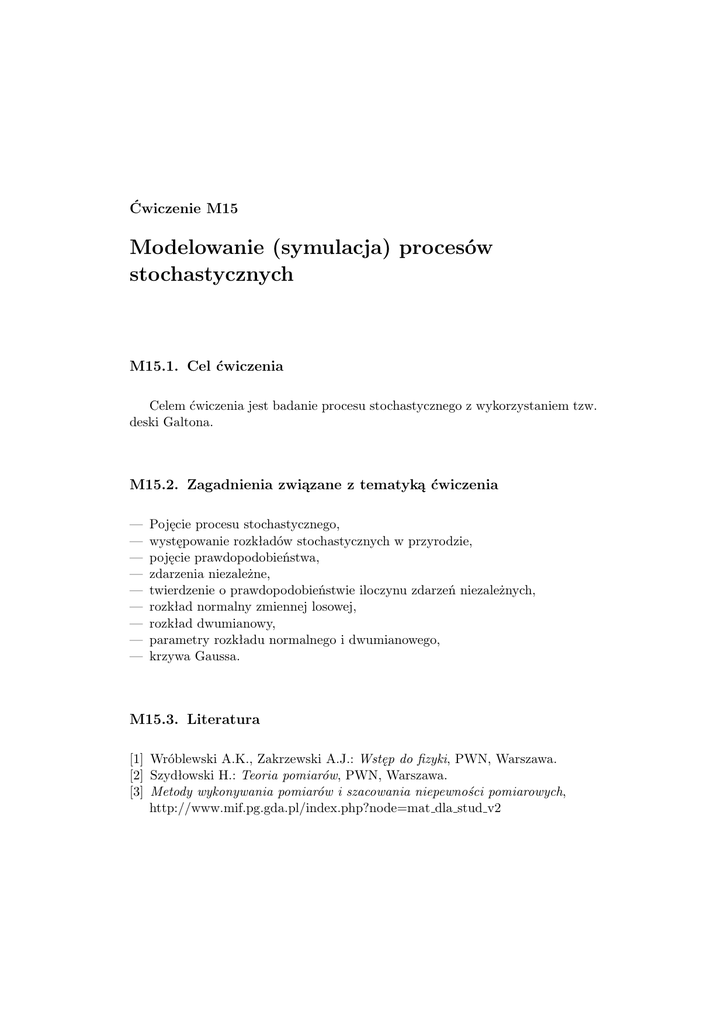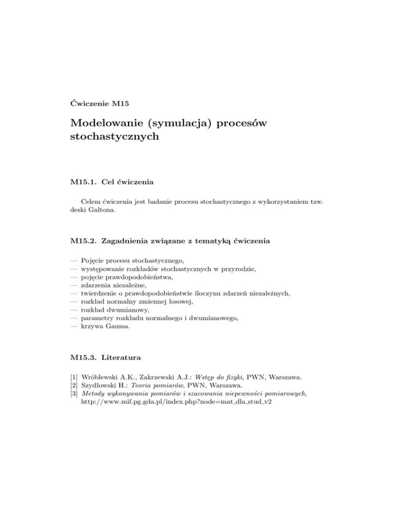Ćwiczenie M15 Modelowanie (symulacja) procesów stochastycznych M15.1. Cel ćwiczenia Celem ćwiczenia jest badanie procesu stochastycznego z wykorzystaniem tzw. deski Galtona. M15.2. Zagadnienia związane z tematyką ćwiczenia — — — — — — — — — Pojęcie procesu stochastycznego, występowanie rozkładów stochastycznych w przyrodzie, pojęcie prawdopodobieństwa, zdarzenia niezależne, twierdzenie o prawdopodobieństwie iloczynu zdarzeń niezależnych, rozkład normalny zmiennej losowej, rozkład dwumianowy, parametry rozkładu normalnego i dwumianowego, krzywa Gaussa. M15.3. Literatura [1] Wróblewski A.K., Zakrzewski A.J.: Wstęp do fizyki, PWN, Warszawa. [2] Szydłowski H.: Teoria pomiarów, PWN, Warszawa. [3] Metody wykonywania pomiarów i szacowania niepewności pomiarowych, http://www.mif.pg.gda.pl/index.php?node=mat dla stud v2 194 Ćwiczenie M15 M15.4. Przebieg ćwiczenia i zadania do wykonania Układ doświadczalny Rysunek M15.1 przedstawia zdjęcie układu pomiarowego, tzw. deski Galtona. Rysunek M15.1. Zdjęcie układu pomiarowego Przebieg doświadczenia Przed przystąpieniem do pomiarów należy przechylić deskę i przesypać wszystkie kulki do lejka zsypowego. Następnie badamy rozkład pierwszej serii 100 kulek, uwalniając kolejno kulkę za kulką. Zliczamy kulki w poszczególnych przegródkach (rowkach) deski, a wyniki zapisujemy w tabeli sporządzonej według wzoru (tabela M15.4). Powtarzamy cykl pomiarów dla następnych serii po 100 kulek każda, zwiększając w ten sposób całkowitą liczbę kulek do 200 w drugim i 300 w trzecim pomiarze. Wyniki zapisujemy w odpowiednich wierszach tabeli. W przedstawionej tabeli ν jest całkowitą liczbą kulek w kolejnym pomiarze (100, 200, 300), νn liczbą kulek w n-tym rowku (n = 1, 2, 3, . . . , N ), N = 23 jest całkowitą liczbą rowków deski Galtona. 195 Modelowanie (symulacja) procesów stochastycznych ν n 100 νn Pexp (n) 200 νn Pexp (n) 300 νn Pexp (n) 1 2 3 4 5 6 ... ... N=23 Tabela M15.1. Wzór tabelki pomiarowej Zadania do wykonania M15.1. Wyznaczyć eksperymentalne wartości prawdopodobieństwa wpadnięcia kulki do n-tego rowka dla serii ν = 100, 200, 300 kulek. M15.2. Wyznaczyć prawdopodobieństwo P (n) wpadnięcia kulki do n-tego rowka na podstawie rozkładu normalnego dla ν = 300 kulek. M15.3. Wykreślić otrzymane w doświadczeniu rozkłady dla całkowitej liczby ν = 100, 200, 300 kulek. Na ten sam wykres nanieść rozkład Gaussa dla ν = 300 kulek, wyliczony w punkcie M15.2. M15.4. Obliczyć względną liczbę kulek, które znalazły się w rowkach deski zawartych w przedziale n̄ ± σ dla całkowitej liczby 300 kulek. Uzupełnienie do zadania M15.1 Korzystając z zależności: Pexp (n) = νn ν (M15.1) dla trzech serii pomiarów obliczamy doświadczalne prawdopodobieństwa wpadnięcia kulki do n-tego rowka. Uzupełnienie do zadania M15.2 Obliczamy estymaty zmiennej losowej n̄ i odchylenia standardowego σ rozkładu Gaussa: n̄ν = N X nνn n=1 ν , σν = N X (n − n̄ν )2 νn n=1 ν−1 ! 21 . (M15.2) 196 Ćwiczenie M15 Następnie wyznaczamy gęstość prawdopodobieństwa rozkładu normalnego na podstawie wzoru: " # (n − n̄)2 1 . (M15.3) ϕ(n) = √ exp − 2σ 2 σ 2π Korzystając z wyznaczonych wielkości, obliczamy prawdopodobieństwo P (n) wpadnięcia kulki do n-tego rowka: Z P (n) = ϕ(n)dn = ϕ(n) · ∆n, (M15.4) n gdzie ∆n = 1. Uzupełnienie do zadania M15.3 Sporządzić wykres słupkowy rozkładu normalnego dla trzech serii pomiarów (n = 100, 200, 300), wykorzystując wartości Pexp (n) zawarte w tabeli. Na ten sam wykres nanieść punkty wyliczone ze wzoru (M15.4) na rozkład Gaussa – odpowiednie wartości P (n) zawarte są w ostatnim wierszu tabeli. Uzupełnienie do zadania M15.4 Obliczyć względną liczbę kulek, które znalazły się w rowkach deski Galtona, w przedziale n̄ ± σ i porównać wynik z teoretyczną wartością prawdopodobieństwa znalezienia się kulek w rowkach z tego samego przedziału, wynikającą z rozkładu Gaussa. M15.5. Rachunek niepewności Deska Galtona jest swego rodzaju analogiem przyrządu pomiarowego, którego najmniejsza działka jest szerokością rowka, równą dokładnie odległości między środkami kołków w każdym rzędzie. Ruch kulki jest symulacją procesu pomiaru, a wynik pomiaru to wartość zmiennej losowej n (numer rowka, do którego ostatecznie trafi kulka). Zatem odchylenie standardowe σ jest miarą niepewności pojedynczego pomiaru (kulka doznaje zawsze elementarnego poziomego przemieszczenia po zderzeniu z kołkiem – w pomiarze zawsze występują niepewności przypadkowe). Odchylenie standardowe σ w teorii błędu nazywa się błędem średnim kwadratowym pojedynczego pomiaru. Należy pamiętać, że zmienna losowa n przyjmuje wartości dyskretne, zatem estymaty zmiennej losowej n i odchylenia standardowego σ są liczbami całkowitymi! Wyniki obliczeń wartości prawdopodobieństw Pexp (n) i P (n) podać z dokładnością do trzech cyfr znaczących.