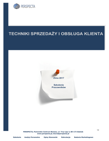 TECHNIKI SPRZEDAŻY I OBSŁUGA KLIENTA Zima 2017 Szkolenie Pracowników 1/2 PERSPECTA, Pomorskie Centrum Biznesu, ul. Trzy Lipy 3, 80-172 Gdańsk www.perspecta.pl, [email protected] Szkolenia Audyty Personalne Opisy Stanowisk Rekrutacja Badania Marketingowe KORZYŚCI UCZESTNICTWA W SZKOLENIACH ZAMKNIĘTYCH Program indywidualnie przygotowany dla Uczestników szkolenia Część praktyczna szkolenia opracowana w oparciu o specyfikę branży i stanowiska uczestników Imienny certyfikat ukończenia szkolenia Bogaty pakiet materiałów szkoleniowych Doświadczona kadra trenerska Realizację w formie 20% teorii, 80% praktyki Dostęp do najnowszej wiedzy i narzędzi szkoleniowych Warunki organizacyjne: Termin Miejsce Przybliżony koszt Do ustalenia. Do ustalenia. Szkolenia organizujemy na terenie całego kraju. 3500 PLN netto – 1 dzień szkoleniowy (8 godzin zegarowych) dla grupy do 10 osób. 10% zniżki przy podpisaniu umowy na miesiąc przed realizacją szkolenia. W cenie: opracowanie indywidualnego programu dopasowanego do potrzeb Klienta, przygotowanie materiałów uwzględniających specyfikę branży, przeprowadzenie szkolenia, bogaty pakiet materiałów szkoleniowych, imienne certyfikaty ukończenia szkolenia. PRZYKŁADOWE MODUŁY SZKOLENIA Cel szkolenia: Jakość obsługi klienta jest ważną formą komunikacji między interesantem a firmą. Trzeba staranie przygotować się, aby sprostać oczekiwaniom naszego rozmówcy. Dlatego też celem szkolenia jest wypracowanie w uczestnikach umiejętności zarządzania relacjami z klientami według określonych standardów. Moduły Szkoleniowe: STANDARDY OBSŁUGI KLIENTA (m.in. kluczowe kompetencje pracowników działu sprzedaży, standardy obsługi telefonicznej, elektronicznej i bezpośredniej Klientów, sprzedaż produktów vs sprzedaż usług - słowa kluczowe w podejściu do Klienta) KOMUNIKACJA I AUTOPREZENCJA (m.in. skuteczna komunikacja w biznesie, wywieranie pozytywnego wrażenia, efektywne metody komunikacji, zasady autoprezentacji, gestykulacja podczas obsługi Klienta, trening aktywnego słuchania, pytania zamknięte i otwarte i ich wpływ na obsługę Klienta, umiejętność parafrazowania, dowartościowywanie, indywidualne treningi autoprezentacji i komunikacji uczestników szkolenia). TYPY KLIENTÓW I TECHNIKI SPRZEDAŻY (m.in. klient asertywny, bierny, agresywny, rozmowny, dopasowanie kanałów komunikacyjnych do różnych typów klientów, sprzedaż produktów za pomocą zasady cecha-zaleta-korzyść, metoda kanapki, metoda oszczędnościowa, metoda porównania, klient zdenerwowany i sposoby radzenia sobie w sytuacjach konfliktowych, metoda ASAP i jej skuteczne wykorzystanie, reklamacje oraz zwroty przydatne w trudnych sytuacjach. Indywidualne treningi uczestników pozwalające na wykorzystanie technik sprzedaży). TWORZENIE OFERT HANDLOWYCH (m.in. zasady opracowywania oferty handlowej, kolorystyka, czcionka, logo, dobór słów kluczowych, najczęstsze błędy w tworzeniu ofert. Indywidualne opracowywanie ofert handlowych uczestników szkolenia). POZYSKIWANIE KLIENTA (m.in. źródła pozyskiwania klientów, bazy danych, promocje, reklama, dopasowanie oferty do Klienta, wyznaczanie celu sprzedażowego za pomocą zasady SMART). WYWIERANIE WPŁYWU NA KLIENTA (m.in. zasady wywierania wpływu w sprzedaży m.in. społeczny dowód słuszności, ekspert, zasada lubienia, stopa w drzwiach, psychologia manipulacji oraz zastosowanie w kontakcie z Klientem, treningi pozwalające na wykorzystanie dotychczas zdobytej wiedzy praz praca nad mocnymi słabymi stronami uczestników). NEGOCJACJE (m.in. standardy formalne przygotowania negocjacji, negocjacje indywidualne i zbiorowe oraz ich wady i zalety, ustalanie celu negocjacji, zalety i wady miejsca negocjacji, analiza stron negocjacji, typy negocjacji, fazy negocjacji, negocjacje miękkie, twarde oraz na zasadach i ich skuteczność w praktyce, indywidualne treningi pozwalające na wykorzystanie materiału i pracę nad mocnymi i słabymi stronami poszczególnych uczestników szkolenia). Powyższe moduły szkolenia są przykładowe. Program szkolenia zostanie dopasowany do Państwa potrzeb oraz będzie uwzględniać specyfikę branży. Dla Klientów realizujących szkolenia cykliczne dodatkowy rabat, uzależniony od wielkości całego projektu. W celu opracowania indywidualnej oferty wraz z programem szkolenia prosimy o przesłanie zapytania do Działu Szkoleń: [email protected] podając preferowaną tematykę szkolenia oraz ilość osób. Konsultanci dopasują ofertę do Państwa potrzeb. 2/2 PERSPECTA, Pomorskie Centrum Biznesu, ul. Trzy Lipy 3, 80-172 Gdańsk www.perspecta.pl, [email protected] Szkolenia Audyty Personalne Opisy Stanowisk Rekrutacja Badania Marketingowe