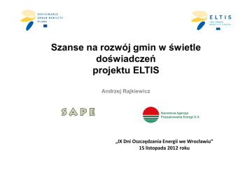 Szanse na rozwój gmin w świetle doświadczeń projektu ELTIS Andrzej Rajkiewicz „IX Dni Oszczędzania Energii we Wrocławiu” 15 listopada 2012 roku ELTIS: Najważniejszy europejski portal informacyjny na temat transportu miejskiego i mobilności www.eltis.org Co oznacza skrót ELTIS? European Local Transport Information Service (ELTIS) to największy europejski portal informacyjny na temat transportu miejskiego i mobilności. ELTIS stanowi inicjatywę Dyrekcji Generalnej Komisji Europejskiej ds. Energii i Transportu. 21 November 2012 www.eltis.org ELTIS daje użytkownikom następujące możliwości: otrzymywanie informacji na temat najnowszych inicjatyw w wybranych gałęziach transportu. poznanie najlepszych praktyk stosowanych w europejskich miastach i regionach, 21 November 2012 wyszukiwanie określonych rozwiązań transportowych, www.eltis.org Współpraca w ramach serwisu powinna zaowocować stworzeniem w miastach bardziej zrównoważonej przestrzeni do życia, zapewniającej mieszkańcom łatwiejszy dostęp do jej zasobów oraz większą mobilność. 21 November 2012 www.eltis.org Zasoby online Wiadomości Studia przypadków Wydarzenia Odnośniki Zaproszenia do przetargów Stowarzyszenie Użytkowników Inicjatywy i polityki UE Głosuj i wygrywaj Narzędzia dla profesjonalistów 21 November 2012 www.eltis.org Kategorie studiów przypadków dostępnych online (1) Ekologiczne i oszczędne pojazdy mechaniczne Rower Zarządzanie popytem i planowanie cen Usługi z dziedziny elastycznej mobilności Integracja, intermodalność i organizacja transportu Zarządzanie mobilnością i kształtowanie świadomości obywateli w zakresie transportu 21 November 2012 www.eltis.org Kategorie studiów przypadków dostępnych online (2) Pasażerski transport publiczny Ochrona i bezpieczeństwo Zarządzanie ruchem Planowanie transportu i gospodarka przestrzenna Transport dla osób z ograniczeniami mobilności Transport towarowy w miastach/logistyka Komunikacja piesza 21 November 2012 www.eltis.org Planowanie transportu • istotne znaczenie mobilności komunikacyjnej dla rozwoju społeczno-gospodarczego miast oraz negatywne następstwa w postaci kongestii, wypadków komunikacyjnych i szkód środowiskowych związane z motoryzacją indywidualną; • w planowaniu transportu w miastach powinno się przyjąć zasady adekwatne dla strategii jego zrównoważonego rozwoju, traktując integralnie wszystkie środki i rodzaje transportu; • w wysoko rozwiniętych gospodarczo krajach Unii Europejskiej plany transportowe są opracowywane na podstawie aktów prawnych wysokiej rangi i uzupełniają się z planami zagospodarowania przestrzennego; • tendencją występującą w krajach Unii Europejskiej jest sporządzanie, poza planami zrównoważonego transportu dla miast i aglomeracji, także planów mobilności dla dużych przedsiębiorstw i innych źródeł ruchu pasażerskiego. Równoważenie transportu • racjonalny podział zadań przewozowych pomiędzy transport zbiorowy i indywidualny • dążenie do skrócenia odległości podróży i zmniejszenia ich liczby • koordynowanie planowania przestrzennego i planowania transportu, głównie zbiorowego, w celu przeciwdziałania już na tym etapie nadmiernemu wykorzystywaniu samochodów osobowych • rosnące oczekiwania nabywców względem jakości usług transportu miejskiego skutkują koniecznością ponoszenia wyższych nakładów na zaspokojenie potrzeb • bez wykorzystania instrumentów restrykcyjnych polityki transportowej w stosunku do motoryzacji indywidualnej nie będzie można zrealizować dążeń mieszkańców miast oraz ich władz w zakresie zapewnienia wysokiej jakości życia i środowiska Zasady planowania transportu miejskiego zawarte w metodyce tworzenia Planów Zrównoważonego Transportu Miejskiego (SUTP) • • • • • • kreowanie wspólnej wizji – angażowanie w fazach planowania i wdrażania wszystkich zainteresowanych stron; racjonalne proporcje zrównoważenia aspektów społecznych, ekonomicznych i środowiskowych; zintegrowane podejście planistyczne – zachowanie integracji poziomej pomiędzy planami transportu i innymi planami samorządowymi oraz integracji pionowej pomiędzy planami miejskimi, regionalnymi, narodowymi i unijnymi; innowacyjność – traktowanie planowania jako instrumentu innowacyjnego sposobu podejścia do problemów związanych z transportem; bilans korzyści i kosztów transportu – szacowanie korzyści i kosztów transportu w zakresie ekonomicznym, społecznym i środowiskowym; realność i elastyczność – dostarczenie konkretnych rezultatów przy wykorzystaniu metodologii zarządzania ryzykiem i monitoringu wdrażania. Źródło: L. Michalski, Planowanie zrównoważonego transportu miast bałtyckich. „Transport Miejski i Regionalny” 2009, nr 7-8 Zarządzanie mobilnością • • • Zarządzanie mobilnością koncentruje się przede wszystkim na „działaniach miękkich” (bezinwestycyjnych), takich jak wprowadzanie różnego rodzaju opłat dla użytkowników infrastruktury transportowej czy też tworzenia planów transportowych. Działania inwestycyjne mają na celu przede wszystkim wzrost efektywności już istniejącej infrastruktury transportowej. Zarządzanie mobilnością oznacza wdrażanie strategii i działań zmierzających do zaspokojenia potrzeb transportowych możliwie szerokiej grupy użytkowników miasta, polegających przede wszystkim na bardziej efektywnym wykorzystaniu środków transportu zbiorowego oraz indywidualnego Szczególną rolę w procesie zarządzania mobilnością odgrywają działania promocyjne, dzięki którym możliwa jest komunikacja z najważniejszymi podmiotami po stronie popytu, do których zaliczają się: – – – – duże przedsiębiorstwa; instytucje publiczne; sektor edukacji; pojedyncze osoby. Sustainable Urban Transport. Final Report from the European Project Trendsetter. CIVITAS. Environmental and Health Protection Agency, City of S