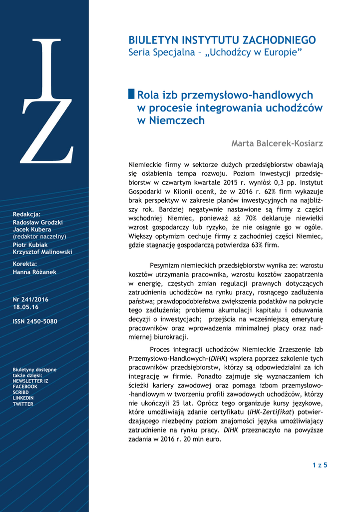 BIULETYN INSTYTUTU ZACHODNIEGO Seria Specjalna – „Uchodźcy w Europie” Rola izb przemysłowo-handlowych w procesie integrowania uchodźców w Niemczech Marta Balcerek-Kosiarz Redakcja: Radosław Grodzki Jacek Kubera (redaktor naczelny) Piotr Kubiak Krzysztof Malinowski Korekta: Hanna Różanek Nr 241/2016 18.05.16 ISSN 2450-5080 Biuletyny dostępne także dzięki: NEWSLETTER IZ FACEBOOK SCRIBD LINKEDIN TWITTER Niemieckie firmy w sektorze dużych przedsiębiorstw obawiają się osłabienia tempa rozwoju. Poziom inwestycji przedsiębiorstw w czwartym kwartale 2015 r. wyniósł 0,3 pp. Instytut Gospodarki w Kilonii ocenił, że w 2016 r. 62% firm wykazuje brak perspektyw w zakresie planów inwestycyjnych na najbliższy rok. Bardziej negatywnie nastawione są firmy z części wschodniej Niemiec, ponieważ aż 70% deklaruje niewielki wzrost gospodarczy lub ryzyko, że nie osiągnie go w ogóle. Większy optymizm cechuje firmy z zachodniej części Niemiec, gdzie stagnację gospodarczą potwierdza 63% firm. Pesymizm niemieckich przedsiębiorstw wynika ze: wzrostu kosztów utrzymania pracownika, wzrostu kosztów zaopatrzenia w energię, częstych zmian regulacji prawnych dotyczących zatrudnienia uchodźców na rynku pracy, rosnącego zadłużenia państwa; prawdopodobieństwa zwiększenia podatków na pokrycie tego zadłużenia; problemu akumulacji kapitału i odsuwania decyzji o inwestycjach; przejścia na wcześniejszą emeryturę pracowników oraz wprowadzenia minimalnej płacy oraz nadmiernej biurokracji. Proces integracji uchodźców Niemieckie Zrzeszenie Izb Przemysłowo-Handlowych-(DIHK) wspiera poprzez szkolenie tych pracowników przedsiębiorstw, którzy są odpowiedzialni za ich integrację w firmie. Ponadto zajmuje się wyznaczaniem ich ścieżki kariery zawodowej oraz pomaga izbom przemysłowo-handlowym w tworzeniu profili zawodowych uchodźców, którzy nie ukończyli 25 lat. Oprócz tego organizuje kursy językowe, które umożliwiają zdanie certyfikatu (IHK-Zertifikat) potwierdzającego niezbędny poziom znajomości języka umożliwiający zatrudnienie na rynku pracy. DIHK przeznaczyło na powyższe zadania w 2016 r. 20 mln euro. 1z5 Z kolei 79 izb przemysłowo-handlowych realizuje proces integracji uchodźców w Niemczech w ramach federalnego programu Ankommen in Deutschland – Gemeinsam unterstützen wir Integration. W pierwszym kwartale 2016 r. zmiany objęły dostosowanie struktury organizacyjnej izb do wymagań integracji. Dla realizacji tego zadania zatrudniono 170 nowych pracowników, czyli około 3 osoby w jednej izbie. Utworzenie nowego działu ds. uchodźców w izbach pozwoliło na przystąpienie do następnego etapu prac, który polega ł na przygotowaniu przewodnika dla przedsiębiorców w sprawie zatrudnienia uchodźców oraz ich edukacji na terenie krajów związkowych. Istotnym elementem jest wprowadzenie usług doradczych dla firm w sprawie wykorzystania potencjału uchodźców do rozwoju przedsiębiorstw. W celu zachęcenia niemieckich pracodawców do ich zatrudnienia izby gwarantują pomoc finansową, która częściowo ma odciążyć firmy z obowiązkowych kursów szkoleniowych dla uchodźców, które umożliwią im pozyskanie niezbędnych kwalifikacji pod kątem pracy w danej firmie. Pozostała część kwoty przeznaczonej na doszkalanie będzie pochodzić z budżetu przedsiębiorstw. Kolejnym etapem realizacji procesu integracji było wyznaczenie izbom nowych zadań względem uchodźców podzielonych na dwie grupy wiekowe. W pierwszej grupie znaleźli się uchodźcy, którzy nie ukończyli 25. roku życia. Dla tej grupy izba przygotowała specjalny program podnoszenia kwalifikacji zawodowych pożądanych z perspektywy gospodarki niemieckiej. Komplementarnie wobec inicjatyw izby, firmy zostały zobowiązane do pogłębionej współpracy w ramach systemu szkolnictwa zawodowego, która polega na przygotowaniu większej liczby miejsc praktyk i staży. Uchodźcy są traktowani jako główna grupa osób, dzięki której otwiera się szansę na odbudowę szkolnictwa zawodowego w Niemczech. Drugą grupą, do której skierowane są działania izby, są uchodźcy po 25. roku życia. W celu ich szybkiej asymilacji na rynku pracy instytucje samorządu gospodarczego odpowiedzialne są za nostryfikację tytułów zawodowych oraz dyplomów i świadectw uchodźców. Dzięki temu przedsiębiorcy, przynależący do izb, mają większą pewność co do kwalifikacji przyszłych pracowników. Izby oferują również usługi z zakresu doradztwa zawodowego dla uchodźców. W każdej izbie funkcjonuje program Stark für die Ausbildung, w ramach którego izby organizują kursy przekwalifikowujące uchodźców pod kątem wymagań przedsiębiorców. Po przeprowadzeniu nostryfikacji dokumentów poświadczających umiejętności zawodowe izby mają obowiązek znalezienia dla nich odpowiednich miejsc zatrudnienia. Zanim pracodawcy podpiszą umowę o pracę z uchodźcą izba informuje i doradza w zakresie regulacji prawnych dotyczących ich zatrudnienia. Po przyjęciu do pracy izba kontroluje plan pracy uchodźców dostosowany do obowiązkowych kursów językowych. Jej zadaniem jest także organizowanie w miejscach pracy dodatkowych kursów językowych z danej branży gospodarki. Ma ona również kompetencje w zakresie wspierania uchodźców, którzy chcą rozpocząć własną działalność gospodarczą. Oprócz działań doradczych izba pełni także funkcje integracyjne względem uchodźców. Polegają one na proponowaniu akcji integrujących pracowników firmy oraz organizowaniu spotkań poświęconych sytuacji społeczno-politycznej państw, z których pochodzą nowi pracobiorcy. Należy dodać, że na zrealizowanie powyższych zadań 79 izb przeznaczyło łącznie 20 mln euro w swoich budżetach na 2016 r. 2z5 Po zatrudnieniu uchodźcy przedsiębiorca jest zobowiązany do spełnienia licznych wymagań. Firmy mają obowiązek udzielać pomocy uchodźcom w nabyciu umiejętnoś