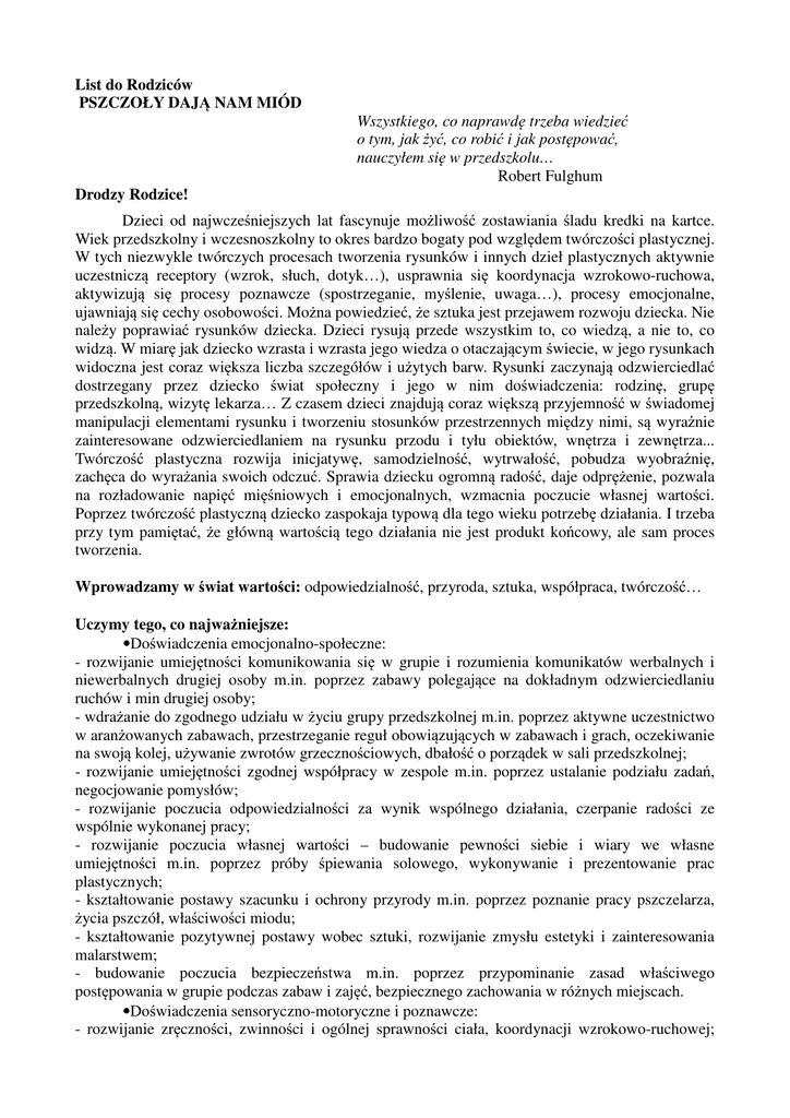 List do Rodziców PSZCZOŁY DAJĄ NAM MIÓD Wszystkiego, co naprawdę trzeba wiedzieć o tym, jak żyć, co robić i jak postępować, nauczyłem się w przedszkolu… Robert Fulghum Drodzy Rodzice! Dzieci od najwcześniejszych lat fascynuje możliwość zostawiania śladu kredki na kartce. Wiek przedszkolny i wczesnoszkolny to okres bardzo bogaty pod względem twórczości plastycznej. W tych niezwykle twórczych procesach tworzenia rysunków i innych dzieł plastycznych aktywnie uczestniczą receptory (wzrok, słuch, dotyk…), usprawnia się koordynacja wzrokowo-ruchowa, aktywizują się procesy poznawcze (spostrzeganie, myślenie, uwaga…), procesy emocjonalne, ujawniają się cechy osobowości. Można powiedzieć, że sztuka jest przejawem rozwoju dziecka. Nie należy poprawiać rysunków dziecka. Dzieci rysują przede wszystkim to, co wiedzą, a nie to, co widzą. W miarę jak dziecko wzrasta i wzrasta jego wiedza o otaczającym świecie, w jego rysunkach widoczna jest coraz większa liczba szczegółów i użytych barw. Rysunki zaczynają odzwierciedlać dostrzegany przez dziecko świat społeczny i jego w nim doświadczenia: rodzinę, grupę przedszkolną, wizytę lekarza… Z czasem dzieci znajdują coraz większą przyjemność w świadomej manipulacji elementami rysunku i tworzeniu stosunków przestrzennych między nimi, są wyraźnie zainteresowane odzwierciedlaniem na rysunku przodu i tyłu obiektów, wnętrza i zewnętrza... Twórczość plastyczna rozwija inicjatywę, samodzielność, wytrwałość, pobudza wyobraźnię, zachęca do wyrażania swoich odczuć. Sprawia dziecku ogromną radość, daje odprężenie, pozwala na rozładowanie napięć mięśniowych i emocjonalnych, wzmacnia poczucie własnej wartości. Poprzez twórczość plastyczną dziecko zaspokaja typową dla tego wieku potrzebę działania. I trzeba przy tym pamiętać, że główną wartością tego działania nie jest produkt końcowy, ale sam proces tworzenia. Wprowadzamy w świat wartości: odpowiedzialność, przyroda, sztuka, współpraca, twórczość… Uczymy tego, co najważniejsze: •Doświadczenia emocjonalno-społeczne: - rozwijanie umiejętności komunikowania się w grupie i rozumienia komunikatów werbalnych i niewerbalnych drugiej osoby m.in. poprzez zabawy polegające na dokładnym odzwierciedlaniu ruchów i min drugiej osoby; - wdrażanie do zgodnego udziału w życiu grupy przedszkolnej m.in. poprzez aktywne uczestnictwo w aranżowanych zabawach, przestrzeganie reguł obowiązujących w zabawach i grach, oczekiwanie na swoją kolej, używanie zwrotów grzecznościowych, dbałość o porządek w sali przedszkolnej; - rozwijanie umiejętności zgodnej współpracy w zespole m.in. poprzez ustalanie podziału zadań, negocjowanie pomysłów; - rozwijanie poczucia odpowiedzialności za wynik wspólnego działania, czerpanie radości ze wspólnie wykonanej pracy; - rozwijanie poczucia własnej wartości – budowanie pewności siebie i wiary we własne umiejętności m.in. poprzez próby śpiewania solowego, wykonywanie i prezentowanie prac plastycznych; - kształtowanie postawy szacunku i ochrony przyrody m.in. poprzez poznanie pracy pszczelarza, życia pszczół, właściwości miodu; - kształtowanie pozytywnej postawy wobec sztuki, rozwijanie zmysłu estetyki i zainteresowania malarstwem; - budowanie poczucia bezpieczeństwa m.in. poprzez przypominanie zasad właściwego postępowania w grupie podczas zabaw i zajęć, bezpiecznego zachowania w różnych miejscach. •Doświadczenia sensoryczno-motoryczne i poznawcze: - rozwijanie zręczności, zwinności i ogólnej sprawności ciała, koordynacji wzrokowo-ruchowej; ćwiczenie równowagi; rozwijanie sprawności manualnej i koordynacji ręka-oko m.in. poprzez kończenie rysunków, kolorowanie; - rozwijanie spostrzegawczości i pamięci wzrokowej m.in. poprzez opowiadanie treści obrazków, odnajdowanie różnic i zmian w kolejności obrazków; poznanie graficznego obrazu wyrazów i wyrażeń (np. kolorowe ule); - rozwijanie spostrzegawczości słuchowej, m.in. poprzez ćwiczenie szybkiego reagowania na sygnał, rozpoznawania źródeł dźwięku; słuchu fonematycznego – m.in. poprzez dobieranie kilku obrazków, których nazwy się rymują; - doskonalenie umiejętności budowania wypowiedzi poprawnej gramatycznie, opisywanie wyglądu uli z zaznaczeniem różnić między obiektami m.in. w kształcie, kolorze, wielkości, wysokości; wzbogacanie słownictwa o wyrazy związane z tematami zajęć m.in. pszczelarz, pasieka, o wyrazy przeciwstawne oraz powiedzenia np. krzątać się jak pszczółka; ćwiczenia usprawniające ruchome narządy artykulacyjne ze szczególnym zwróceniem uwagi na prawidłową ruchliwość języka; doskonalenie umiejętności prawidłowej realizacji głoski z; - rozbudzanie zainteresowania czytaniem i książkami m.in. poprzez słuchanie utworów zawierających humor literacki i wypowiadanie się na temat treści utworów, omawianie ilustracji; - poszerzanie wiedzy na temat życia pszczół, pracy pszczelarza i właściwości miodu; - doskonalenie wrażliwości zmysłu smaku; - doskonalenie umiejętności: rozumowania m.in. poprzez klasyfikowanie przedmiotów o cechach wspólnych i przeciwstawnych oraz nazywanie tych cech, mierzenia objętości podczas zabawy wiaderkami i foremkami, posługiwania się liczebnikami porządkowymi, układania kompozycji z figur geometrycznych. Jak wspierać dziecko? •Nie należy poprawiać rysunków dziecka i nie należy narzucać dzieciom dorosłego sposobu widzenia świata. Nic nie szkodzi, że prace dziecka nie odzwierciedlają proporcji, nie uwzględniają perspektywy, a kolorystyka nie zawsze odpowiada rzeczywistości. Swobodne, niczym nie skrępowane posługiwanie się pędzlem czy kredkami stanowi istotę dziecięcej twórczości. Jest to najbardziej rozpowszechniona forma wypowiedzi najmłodszych i jest ona zarazem sposobem uzewnętrznienia ich osobowości, trosk, marzeń, pr