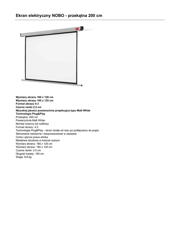 Ekran elektryczny NOBO - przekątna 200 cm Wymiary ekranu 160 x 120 cm Wymiary obrazu 165 x 125 cm Format obrazu 4:3 Czarne ramki 2.5 cm Wysokiej jakości powierzchnia projekcyjna typu Matt White Technologia Plug&Play Przekątna: 200 cm Powierzchnia Matt White Montaż ścienny lub sufitowy Format obrazu: 4:3 Technologia Plug&Play - ekran działa od razu po podłączeniu do prądu Sterowanie naścienne i bezprzewodowe w zestawie Cicha i płynna praca silnika Metalowa obudowa w kolorze szarym Wymiary ekranu: 165 x 125 cm Wymiary obrazu: 160 x 120 cm Czarne ramki: 2.5 cm Długość kasety: 183 cm Waga: 8.8 kg
