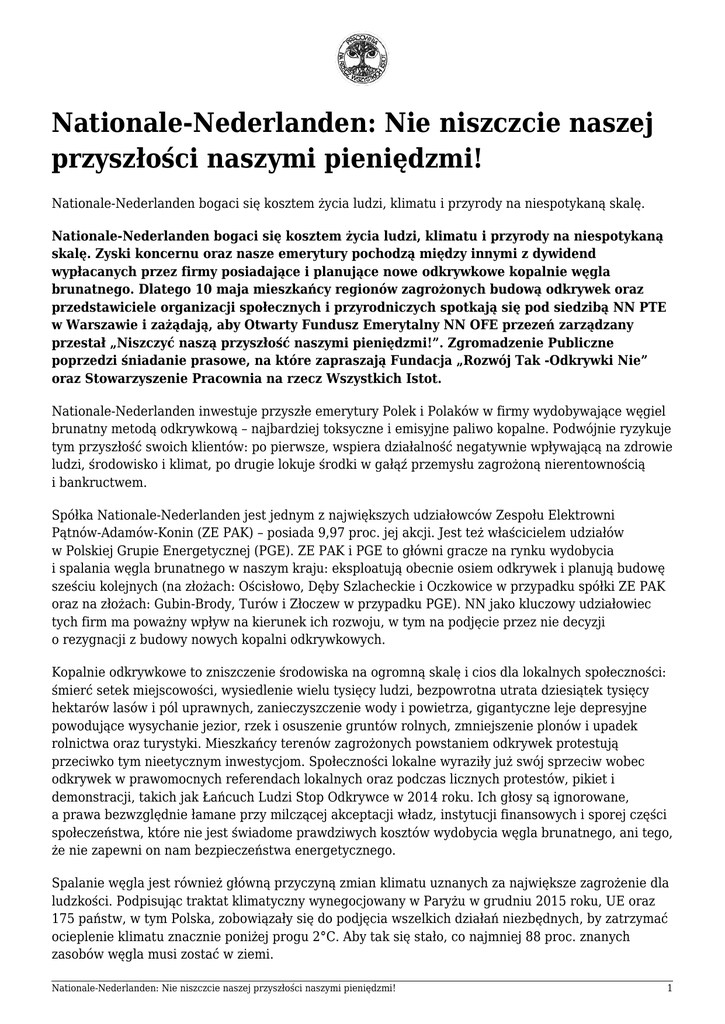 Nationale-Nederlanden: Nie niszczcie naszej przyszłości naszymi pieniędzmi! Nationale-Nederlanden bogaci się kosztem życia ludzi, klimatu i przyrody na niespotykaną skalę. Nationale-Nederlanden bogaci się kosztem życia ludzi, klimatu i przyrody na niespotykaną skalę. Zyski koncernu oraz nasze emerytury pochodzą między innymi z dywidend wypłacanych przez firmy posiadające i planujące nowe odkrywkowe kopalnie węgla brunatnego. Dlatego 10 maja mieszkańcy regionów zagrożonych budową odkrywek oraz przedstawiciele organizacji społecznych i przyrodniczych spotkają się pod siedzibą NN PTE w Warszawie i zażądają, aby Otwarty Fundusz Emerytalny NN OFE przezeń zarządzany przestał „Niszczyć naszą przyszłość naszymi pieniędzmi!”. Zgromadzenie Publiczne poprzedzi śniadanie prasowe, na które zapraszają Fundacja „Rozwój Tak -Odkrywki Nie” oraz Stowarzyszenie Pracownia na rzecz Wszystkich Istot. Nationale-Nederlanden inwestuje przyszłe emerytury Polek i Polaków w firmy wydobywające węgiel brunatny metodą odkrywkową – najbardziej toksyczne i emisyjne paliwo kopalne. Podwójnie ryzykuje tym przyszłość swoich klientów: po pierwsze, wspiera działalność negatywnie wpływającą na zdrowie ludzi, środowisko i klimat, po drugie lokuje środki w gałąź przemysłu zagrożoną nierentownością i bankructwem. Spółka Nationale-Nederlanden jest jednym z największych udziałowców Zespołu Elektrowni Pątnów-Adamów-Konin (ZE PAK) – posiada 9,97 proc. jej akcji. Jest też właścicielem udziałów w Polskiej Grupie Energetycznej (PGE). ZE PAK i PGE to główni gracze na rynku wydobycia i spalania węgla brunatnego w naszym kraju: eksploatują obecnie osiem odkrywek i planują budowę sześciu kolejnych (na złożach: Ościsłowo, Dęby Szlacheckie i Oczkowice w przypadku spółki ZE PAK oraz na złożach: Gubin-Brody, Turów i Złoczew w przypadku PGE). NN jako kluczowy udziałowiec tych firm ma poważny wpływ na kierunek ich rozwoju, w tym na podjęcie przez nie decyzji o rezygnacji z budowy nowych kopalni odkrywkowych. Kopalnie odkrywkowe to zniszczenie środowiska na ogromną skalę i cios dla lokalnych społeczności: śmierć setek miejscowości, wysiedlenie wielu tysięcy ludzi, bezpowrotna utrata dziesiątek tysięcy hektarów lasów i pól uprawnych, zanieczyszczenie wody i powietrza, gigantyczne leje depresyjne powodujące wysychanie jezior, rzek i osuszenie gruntów rolnych, zmniejszenie plonów i upadek rolnictwa oraz turystyki. Mieszkańcy terenów zagrożonych powstaniem odkrywek protestują przeciwko tym nieetycznym inwestycjom. Społeczności lokalne wyraziły już swój sprzeciw wobec odkrywek w prawomocnych referendach lokalnych oraz podczas licznych protestów, pikiet i demonstracji, takich jak Łańcuch Ludzi Stop Odkrywce w 2014 roku. Ich głosy są ignorowane, a prawa bezwzględnie łamane przy milczącej akceptacji władz, instytucji finansowych i sporej części społeczeństwa, które nie jest świadome prawdziwych kosztów wydobycia węgla brunatnego, ani tego, że nie zapewni on nam bezpieczeństwa energetycznego. Spalanie węgla jest również główną przyczyną zmian klimatu uznanych za największe zagrożenie dla ludzkości. Podpisując traktat klimatyczny wynegocjowany w Paryżu w grudniu 2015 roku, UE oraz 175 państw, w tym Polska, zobowiązały się do podjęcia wszelkich działań niezbędnych, by zatrzymać ocieplenie klimatu znacznie poniżej progu 2°C. Aby tak się stało, co najmniej 88 proc. znanych zasobów węgla musi zostać w ziemi. Nationale-Nederlanden: Nie niszczcie naszej przyszłości naszymi pieniędzmi! 1 Nie tylko Polska walczy o to, by cele Szczytu Klimatycznego w Paryżu zostały osiągnięte. W maju 2016 na całym świecie mają miejsce obywatelskie manifestacje i protesty pod wspólnym hasłem Break Free from Fossil Fuels. Ich celem jest pokazanie rządom, koncernom energetycznym i inwestorom, że mieszkańcom Ziemi nie jest obojętne, jaka będzie jej przyszłość. Miesiąc BREAK FREE to społeczny sygnał, że najwyższy czas na zmiany, które doprowadzą do rezygnacji ze spalania paliw kopalnych i pozwolą ograniczyć globalne ocieplenie do poziomu znacznie poniżej 2°C. Czerpiąc zyski z energetyki węglowej – sektora schyłkowego i nierentownego – Nationale-Nederlanden ryzykuje pieniędzmi obywateli, całkowicie ignorując światowe trendy. Dotychczas już ponad 500 instytucji finansowych, których aktywa oceniono na 3,4 biliona dolarów, pozbyło się udziałów w spółkach węglowych. Akcja Nie Niszczcie! jest wyrazem braku społecznego przyzwolenia na to, by emerytury Polek i Polaków umożliwiały zniszczenie życia ludzi, ich więzi, tradycji i kultury oraz trwałą degradację przyrody i klimatu. Podczas Zgromadzenia Publicznego reprezentanci społeczności zagrożonych budową odkrywek i wspomagające je organizacje społeczne przedstawią zarządowi Nationale-Nederlanden PTE S.A: 1. Apel Koalicji „Rozwój Tak – Odkrywki Nie” do przewodniczącego rady nadzorczej NN PTE S.A. o wycofanie inwestycji NN ze spółek planujących budowę nowych kopalni odkrywkowych węgla brunatnego. 2. Oficjalne żądanie, aby Nationale-Nederlanden OFE zarządzany przez NN PTE S.A. wezwał spółkę ZE PAK do rezygnacji ze szkodliwych inwestycji lub sprzedał swoje udziały w spółce ZE PAK, jeżeli ta nie zastosuje się do wezwania. Zapraszamy również na śniadanie prasowe, które poprzedzi akcję Nie Niszczcie! W dyskusji pod hasłem „Nationale-Nederlanden – nieznane oblicze, czyli kto niszczy środowisko i klimat za nasze pieniądze?” wezmą udział eksperci: ● ● ● dr Michał Wilczyński – ekspert ds. paliw i energii, były główny geolog kraju i wiceminister środowiska, Marcin Popkiewicz – redaktor portali Ziemianarozdrozu.pl i Naukaoklimacie.pl, laureat głównej nagrody konkursu Dziennikarze dla Klimatu 2015, Kuba Gogolewski – ekonomista, kampanier finanso