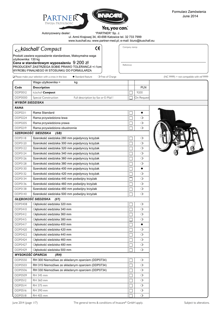 Formularz Zamówienia June 2014 Autoryzowany dealer: “PARTNER” Sp. J. ul. Armii Krajowej 34, 40-698 Katowice tel. 32 733 7999 www.kuschall.eu; www.partner-med.pl; e-mail: [email protected] Compact Company stamp: Produkt zawiera wyposażenie standardowe, Maksymalna waga użytkownika: 130 kg Cena w standardowym wyposażeniu 9 200 zł PRODUCENT ZASTRZEGA SOBIE PRAWO TOLERANCJI +/-1cm WYROBU FINALNEGO W STOSUNKU DO FORMULARZA ❏Please make your selection with a cross in the box Waga użytkownika = Code ◆Standard feature Reference: ❍Free of Charge (NC 9999) = not compatible with ref 9999 kg PLN DDP0012 küschall Compact DDP0000 Special Construction Full description by fax or E-Mail ! 9200 On Request WYBÓR SIEDZISKA RAMA DDP0211 Rama Standard u DDP0224 Rama przywiedziona lewa m DDP0205 Rama przywiedziona prawa m DDP0219 Rama przywiedziona obustronnie m m SZEROKOŚĆ SIEDZISKA DDP0118 (SB) Szerokość siedziska 280 mm pojedynczy krzyżak DDP0120 Szerokość siedziska 300 mm pojedynczy krzyżak m DDP0122 Szerokość siedziska 320 mm pojedynczy krzyżak m DDP0124 Szerokość siedziska 340 mm pojedynczy krzyżak m DDP0126 Szerokość siedziska 360 mm pojedynczy krzyżak m m DDP0128 Szerokość siedziska 380 mm pojedynczy krzyżak DDP0130 Szerokość siedziska 400 mm pojedynczy krzyżak u DDP0132 Szerokość siedziska 420 mm pojedynczy krzyżak m DDP0134 Szerokość siedziska 440 mm podwójny krzyżak m DDP0136 Szerokość siedziska 460 mm podwójny krzyżak m DDP0138 Szerokość siedziska 480 mm podwójny krzyżak m DDP0140 Szerokość siedziska 500 mm podwójny krzyżak m GŁĘBOKOŚĆ SIEDZISKA DDP0408 Głębokość siedziska 320 mm m DDP0410 Głębokość siedziska 340 mm m DDP0412 Głębokość siedziska 360 mm m DDP0415 Głębokość siedziska 380 mm m DDP0417 Głębokość siedziska 400 mm u DDP0420 Głębokość siedziska 420 mm m DDP0422 Głębokość siedziska 440 mm m DDP0424 Głębokość siedziska 460 mm m DDP0427 Głębokość siedziska 480 mm m DDP0429 Głębokość siedziska 500 mm m WYSOKOŚĆ OPARCIA (RH) DDP0550 RH 300 Niemożliwe ze składanym oparciem (DDP0734) m DDP0503 RH 315 Niemożliwe ze składanym oparciem (DDP0734) m DDP0506 RH 330 Niemożliwe ze składanym oparciem (DDP0734) m DDP0509 RH 345 mm m DDP0512 RH 360 mm m DDP0514 RH 375 mm m DDP0516 RH 390 mm m DDP0518 RH 405 mm m June 2014 (page 1/7) The general terms & conditions of Invacare® GmbH apply. Subject to alterations. Company: _________________________________________________________ Reference: ___________________________________________________________ DDP0520 RH 420 mm Compact u DDP0522 RH 435 mm m DDP0524 RH 450 mm m DDP0526 RH 465 mm m DDP0528 RH 480 mm m DDP0530 RH 495 mm m DDP0532 RH 510 mm m WYSOKOŚĆ SIEDZISKA Z PZRODU (DO PODŁOGI) DDP0843 SHv 410 mm m DDP0844 SHv 420 mm m DDP0845 SHv 430 mm m DDP0846 SHv 440 mm m DDP0847 SHv 450 mm m DDP0848 SHv 460 mm m DDP0849 SHv 470 mm m DDP0850 SHv 480 mm m DDP0851 SHv 490 mm m DDP0852 SHv 500 mm u DDP0853 SHv 510 mm m DDP0854 SHv 520 mm m DDP0855 SHv 530 mm m WYSOKOŚĆ SIEDZISKA Z TYŁU (SHH) 70° frame: SHh = "SHv-10cm" to "SHv- 0cm" ; 80° & 90° frame: SHh = "SHv-10cm" to "SHv-3cm" DDP0943 SHh 380 mm m DDP0944 SHh 390 mm m DDP0945 SHh 400 mm m DDP0946 SHh 410 mm m DDP0947 SHh 420 mm m DDP0948 SHh 430 mm m DDP0949 SHh 440 mm m DDP0950 SHh 450 mm u DDP0951 SHh 460 mm m DDP0952 SHh 470 mm m DDP0953 SHh 480 mm m DDP0954 SHh 490 mm m DDP0955 SHh 500 mm m ODLEGŁO ŚĆ KOLANO-PIĘTA dla ramy 70°: UL max. = "SHv-20 mm" dla ramy 80° i 9 0° : UL max. = SHV-30 mm" DDP1662 UL 210 mm W zależności od konfiguracji płyta podnóżka może być wysoko montowana - zobacz w sekcji “PODNÓŻEK” m DDP1663 UL 220 mm W zależności od konfiguracji płyta podnóżka może być wysoko montowana - zobacz w sekcji “PODNÓŻEK” m DDP1664 UL 230 mm W zależności od konfiguracji płyta podnóżka może być wysoko montowana - zobacz w sekcji “PODNÓŻEK” m DDP1665 UL 240 mm W zależności od konfiguracji płyta podnóżka może być wysoko montowana - zobacz w sekcji “PODNÓŻEK” m DDP1666 UL 250 mm W zależności od konfiguracji płyta podnóżka może być wysoko montowana - zobacz w sekcji “PODNÓŻEK” m DDP1667 UL 260 mm W zależności od konfiguracji płyta podnóżka może być wysoko montowana - zobacz w sekcji “PODNÓŻEK” m DDP1668 UL 270 mm W zależności od konfiguracji płyta podnóżka może być wysoko montowana - zobacz w sekcji “PODNÓŻEK” m DDP1669 UL 280 mm W zależności od konfiguracji płyta podnóżka może być wysoko montowana - zobacz w sekcji “PODNÓŻEK” m DDP1670 UL 290 mm W zależności od konfiguracji płyta podnóżka może być wysoko montowana - zobacz w sekcji “PODNÓŻEK” m DDP1671 UL 300 mm W zależności od konfiguracji płyta podnóżka może być wysoko montowana - zobacz w sekcji “PODNÓŻEK” m DDP1672 UL 310 mm W zależności od konfiguracji płyta podnóżka może być wysoko montowana - zobacz w sekcji “PODNÓŻEK” m UL 320 mm W zależności od konfiguracji płyta podnóżka może być wysoko montowana - zobacz w sekcji “PODNÓŻEK” m DDP1673 June 2014 (page 2/7) SHh / Rozmiar tylnego koła 22" : 380-450 mm 24" : 390-480 mm 26" : 420-500 mm Customer UL must be measured taking away the cushion thickness UL = ULpat-SK The general terms & conditions of Invacare ® GmbH apply. Subject to alterations. Company: _________________________________________________________ Reference: ___________________________________________________________ DDP1674 , UL 330 mm W zależności od konfiguracji płyta podnóżka m może być wysoko montowana - zobacz w sekcji “PODNÓŻEK” UL 340 mm W zależności od konfiguracji płyta podnóżka może być wysoko montowana - zobacz w sekcji “PODNÓŻEK” m UL 350 mm W zależności od konfiguracji płyta podnóżka może być wysoko montowana - zobacz w sekcji “PODNÓŻEK” m DDP1677 UL 360 mm m DDP1678 UL 370 mm m DDP1679 UL 380 mm m DDP1680 UL 390 m