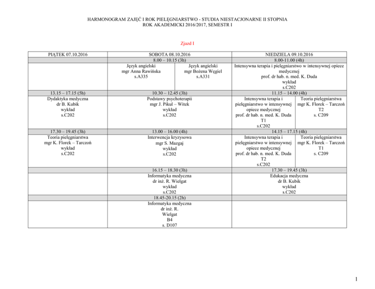 HARMONOGRAM ZAJĘĆ I ROK PIELĘGNIARSTWO - STUDIA NIESTACJONARNE II STOPNIA ROK AKADEMICKI 2016/2017, SEMESTR I Zjazd I PIĄTEK 07.10.2016 SOBOTA 08.10.2016 8.00 – 10.15 (3h) Język angielski Język angielski mgr Anna Rawińska mgr Bożena Węgiel s.A335 s.A331 13.15 – 17.15 (5h) Dydaktyka medyczna dr B. Kubik wykład s.C202 10.30 – 12.45 (3h) Podstawy psychoterapii mgr J. Pikul – Witek wykład s.C202 17.30 – 19.45 (3h) Teoria pielęgniarstwa mgr K. Florek – Tarczoń wykład s.C202 13.00 – 16.00 (4h) Interwencja kryzysowa mgr S. Mazgaj wykład s.C202 16.15 – 18.30 (3h) Informatyka medyczna dr inż. R. Wielgat wykład s.C202 18.45-20.15 (2h) Informatyka medyczna dr inż. R. Wielgat B4 s. D107 NIEDZIELA 09.10.2016 8.00-11.00 (4h) Intensywna terapia i pielęgniarstwo w intensywnej opiece medycznej prof. dr hab. n. med. K. Duda wykład s.C202 11.15 – 14.00 (4h) Intensywna terapia i Teoria pielęgniarstwa pielęgniarstwo w intensywnej mgr K. Florek – Tarczoń opiece medycznej T2 prof. dr hab. n. med. K. Duda s. C209 T1 s.C202 14.15 – 17.15 (4h) Intensywna terapia i Teoria pielęgniarstwa pielęgniarstwo w intensywnej mgr K. Florek – Tarczoń opiece medycznej T1 prof. dr hab. n. med. K. Duda s. C209 T2 s.C202 17.30 – 19.45 (3h) Edukacja medyczna dr B. Kubik wykład s.C202 1 HARMONOGRAM ZAJĘĆ I ROK PIELĘGNIARSTWO - STUDIA NIESTACJONARNE II STOPNIA ROK AKADEMICKI 2016/2017, SEMESTR I Zjazd II PIĄTEK 28.10.2016 13.45-16.45 (4h) Podstawy Informatyka Podstawy psychoterapii psychoterap medyczna mgr J. Pikul – Witek ii dr inż. R. B3 mgr M. Wielgat s. C209 Kozicka B4 B2 s. D107 s. C202 13.00-14.30 (2h) 17.00-20.00 (4h) Informatyka medyczna dr inż. R. Wielgat B2 s. D107 Podstawy psychoterapii mgr J. Pikul – Witek B4 s. C209 SOBOTA 29.10.2016 8.00-10.15 (3h) Język angielski Język angielski mgr Anna Rawińska mgr Bożena s.A335 Węgiel s.A331 10.30 - 12.45 (3h) Podstawy psychoterapii mgr J. Pikul – Witek wykład s.C202 13.00 – 16.00 (4h) Podstawy Informatyk Podstawy psychoterapii a medyczna psychoterapii mgr M. dr inż. R. mgr J. Pikul – Kozicka Wielgat Witek B2 B1 B3 s. C209 s. D107 s.C202 NIEDZIELA 30.10.2016 9.30 – 11.45 (3h) Diabetologia, choroby metaboliczne prof. dr hab. n. med. J. Sieradzki wykład s.C202 12.00 – 15.00 (4h) Edukacja zdrowotna dr B. Kubik wykład s.C202 15.15 – 17.30 (3h) Informatyka medyczna dr inż. R. Wielgat wykład s.C202 16.15-18.30 (3h) 17.45 – 20.00 (3h) Dydaktyka medyczna dr B. Kubik wykład s.C202 Interwencja kryzysowa mgr S. Mazgaj wykład s.C202 2 HARMONOGRAM ZAJĘĆ I ROK PIELĘGNIARSTWO - STUDIA NIESTACJONARNE II STOPNIA ROK AKADEMICKI 2016/2017, SEMESTR I Zjazd III PIĄTEK 4. 11.2015 13.00 – 17.00 (5h) Dydaktyka medyczna dr B. Kubik wykład s.C202 17.15 – 19.30 (3h) Teoria pielęgniarstwa mgr K. Florek – Tarczoń wykład s.C202 SOBOTA 5.11.2016 8.00-10.15 (3h) Język angielski Język angielski mgr Anna Rawińska mgr Bożena s.A335 Węgiel s.A331 10.30 – 13.30 (4h) Intensywna terapia i pielęgniarstwo w intensywnej opiece medycznej prof. dr hab. n. med. K. Duda wykład s.C202 13.45 – 16.45 (4h) Dydaktyka medyczna Intensywna terapia i Mgr E. Smoła pielęgniarstwo w D3 intensywnej opiece s.C209 medycznej prof. dr hab. n. med. K. Duda T1 s.C202 17.00-20.00 (4h) Podstawy Informaty psychoter ka apii medyczna mgr M. dr inż. R. Kozicka Wielgat B1 B2 S.C209 s. D107 Intensywna terapia i pielęgniarstwo w intensywnej opiece medycznej prof. dr hab. n. med. K. Duda T2 s.C202 NIEDZIELA 6. 11.2016 9.30 – 11.45 (3h) Diabetologia, choroby metaboliczne prof. dr hab. n. med. J. Sieradzki wykład s.C202 12.00-13.30 (2h) Diabetologia, choroby Teoria pielęgniarstwa metaboliczne mgr K. Florek – Tarczoń prof. dr hab. n. med. J. T2 Sieradzki s. C209 T1 s.C202 13.45 – 15.15 (2h) Diabetologia, choroby Teoria pielęgniarstwa metaboliczne mgr K. Florek – Tarczoń prof. dr hab. n. med. J. T1 Sieradzki s. C209 T2 s.C202 15.30-18.30 (4h) Informatyka medyczna dr inż. R. Wielgat B1 s. D107 Podstawy psychoterapii mgr J. Pikul – Witek B3 s.C209 3 HARMONOGRAM ZAJĘĆ I ROK PIELĘGNIARSTWO - STUDIA NIESTACJONARNE II STOPNIA ROK AKADEMICKI 2016/2017, SEMESTR I Zjazd IV PIĄTEK 18.11.2015 13.00-15.15 (3h) Podstawy psychoterapii mgr J. Pikul – Witek wykład s.C202 15.30-18.30 (4h) Dydaktyka Medyczna dr M. Kołpa D1 s.C202 Podstawy psychoterapii mgr J. Pikul – Witek B4 s. C209 18.45-20.15 (2h) Podstawy psychoterapii mgr M. Kozicka B2 s.C202 Informatyka medyczna dr inż. R. Wielgat B4 s. D107 SOBOTA 19.11.2016 8.00-10.15 (3h) Język angielski Język angielski mgr Anna Rawińska mgr Bożena s.A335 Węgiel s.A331 10.30 – 14.15 (5h) Onkologia i pielęgniarstwo onkologiczne Prof. dr hab. Leszek Kołodziejski Wykład s.C202 14.30 – 17.30 (4h) Podstawy Informatyka Podstawy psychoterapii medyczna psychoterapii mgr M. Kozicka dr inż. R. mgr J. Pikul – B1 Wielgat Witek s. C209 B2 B3 s. D107 s.C202 17.45-19.15 (2h) Podstawy psychoterapii mgr M. Kozicka B2 s.C202 Informatyka medyczna dr inż. R. Wielgat B4 s. D107 17.45-20.00 (3h) NIEDZIELA 20.11.2016 9.30 – 11.45 (3h) Diabetologia, choroby metaboliczne prof. dr hab. n. med. J. Sieradzki wykład s.C202 12.00-13.30 (2h) Diabetologia, choroby Edukacja zdrowotna metaboliczne mgr K. Moździerz T2 prof. dr hab. n. med. J. s. C209 Sieradzki T1 s.C202 13.45– 15.15 (2h) Diabetologia, choroby Edukacja zdrowotna metaboliczne mgr K. Moździerz T1 prof. dr hab. n. med. J. s. C209 Sieradzki T2 s.C202 15.30-18.30 (4h) Interwencja kryzysowa mgr S. Mazgaj D2 s.C202 15.30-19.15 (5h) Dydaktyka medyczna Mgr E. Smoła D3 s.C209 Informatyka medyczna dr inż. R. Wielgat B1 s. D107 4 HARMONOGRAM ZAJĘĆ I ROK PIELĘGNIARSTWO - STUDIA NIESTACJONARNE II STOPNIA ROK AKADEMICKI 2016/2017, SEMESTR I Zjazd V PIĄTEK 25.11.2016 13.00-16.00 (4h) Teoria pielęgniarstwa mgr K. Florek – Tarczoń wykład s.C202 16.15-19.15 (4h) Dydaktyka Medyczna dr M. Kołpa D1 s.C202 Teoria pielęgniarstwa mgr K. Florek – T