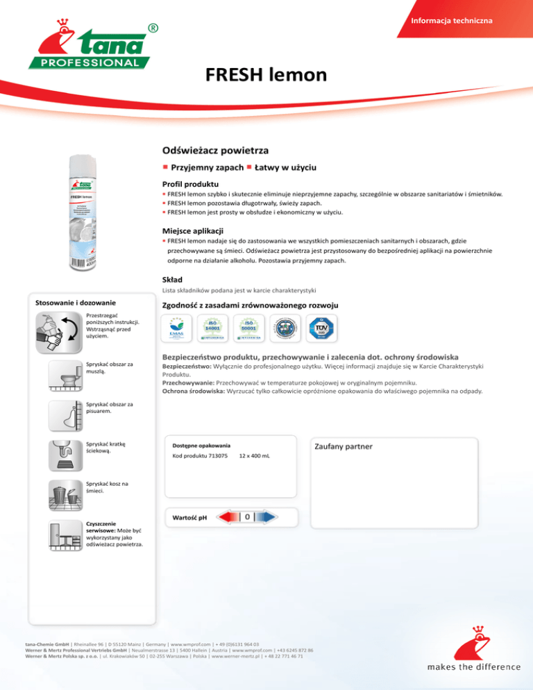 Informacja techniczna FRESH lemon Odświeżacz powietrza ■ Przyjemny zapach ■ Łatwy w użyciu Profil produktu FRESH lemon szybko i skutecznie eliminuje nieprzyjemne zapachy, szczególnie w obszarze sanitariatów i śmietników. FRESH lemon pozostawia długotrwały, świeży zapach. ■ FRESH lemon jest prosty w obsłudze i ekonomiczny w użyciu. ■ ■ Miejsce aplikacji ■ FRESH lemon nadaje się do zastosowania we wszystkich pomieszczeniach sanitarnych i obszarach, gdzie przechowywane są śmieci. Odświeżacz powietrza jest przystosowany do bezpośredniej aplikacji na powierzchnie odporne na działanie alkoholu. Pozostawia przyjemny zapach. Skład Lista składników podana jest w karcie charakterystyki Stosowanie i dozowanie Zgodność z zasadami zrównoważonego rozwoju Przestrzegać poniższych instrukcji. Wstrząsnąć przed użyciem. Spryskać obszar za muszlą. Bezpieczeństwo produktu, przechowywanie i zalecenia dot. ochrony środowiska Bezpieczeństwo: Wyłącznie do profesjonalnego użytku. Więcej informacji znajduje się w Karcie Charakterystyki Produktu. Przechowywanie: Przechowywać w temperaturze pokojowej w oryginalnym pojemniku. Ochrona środowiska: Wyrzucać tylko całkowicie opróżnione opakowania do właściwego pojemnika na odpady. Spryskać obszar za pisuarem. Spryskać kratkę ściekową. Zaufany partner Dostępne opakowania Kod produktu 713075 12 x 400 mL Spryskać kosz na śmieci. Czyszczenie serwisowe: Może być wykorzystany jako odświeżacz powietrza. Wartość pH 0 tana-Chemie GmbH | Rheinallee 96 | D 55120 Mainz | Germany | www.wmprof.com | + 49 (0)6131 964 03 Werner & Mertz Professional Vertriebs GmbH | Neualmerstrasse 13 | 5400 Hallein | Austria | www.wmprof.com | +43 6245 872 86 Werner & Mertz Polska sp. z o.o. | ul. Krakowiaków 50 | 02-255 Warszawa | Polska | www.werner-mertz.pl | + 48 22 771 46 71
