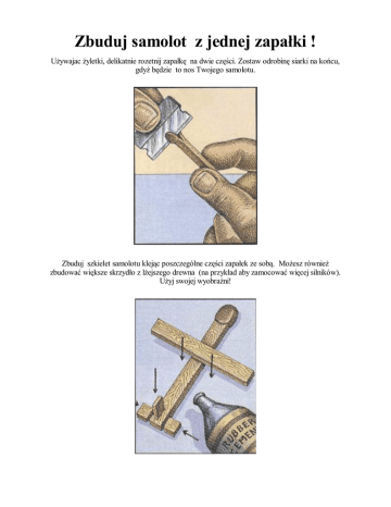 Zbuduj samolot z jednej zapa ki ! ywajac yletki, delikatnie rozetnij zapa na dwie cz ci. Zostaw odrobin siarki na ko cu, gdy b dzie to nos Twojego samolotu. Zbuduj szkielet samolotu klej c poszczególne cz ci zapa ek ze sob . Mo esz równie zbudowa wi ksze skrzyd o z l ejszego drewna (na przyk ad aby zamocowa wi cej silników). yj swojej wyobra ni! ap kilka much i umie je w s oiku. Wstaw s oik do zamra arki. Po kilku sekundach muchy wyzi bione i nieruchome. Nie sch adzaj swoich silników za bardzo - to je zabije! Je li ysz je do lodówki zamiast do zamra arki - potrwa to troch d ej. Podczas gdy czekasz na to aby Twoje silniki si ozi bi y i zesztywnia y, na kleju na miejsca gdzie chcesz umie ci swoje silniki. kilka kropelek Wyjmij swoje muchy z zamra arki (lub z lodówki). Umie je w miejscach gdzie na klej. Chuchnij ciep ym powietrzem na muchy. Niewiarygodne! Muchy, które jeszcze przed chwil by y zamro one, nagle wracaj do ycia. Wystartuj samolot. Je li zrobi wszystko poprawnie, b dzie lata ! Usi wygodnie i obserwuj muchy bawi ce si samolotem. adna z nich nie do wiadczy a czego takiego przedtem :) Mi ej zabawy!