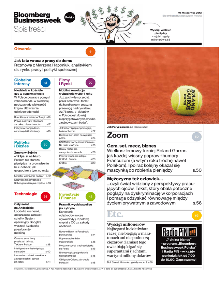 10–16 czerwca 2013 Bloomberg Businessweek Polska Spis treści Wyścigi wielkich pieniędzy – rajdy i regaty milionerów s.63 Otwarcie 6 Jak tata wraca z pracy do domu Rozmowa z Marzeną Haponiuk, analitykiem ds. rynku pracy i polityki społecznej Globalne Interesy 12 Niedziela w kościele czy w supermarkecie W Polsce powraca pomysł zakazu handlu w niedzielę, podczas gdy większość krajów UE właśnie od niego odchodzi Bunt klasy średniej w Turcji s.16 Prawo pobytu w Hiszpanii za zakup nieruchomości s.17 Fabryki w Bangladeszu na krawędzi katastrofy s.18 Firmy i Rynki 20 Mobilna rewolucja wybuchnie w 2014 roku Już za chwilę sprzedaż przez smartfon i tablet da handlowcom znaczną przewagę nad rywalami. Aż 76 proc. e–sklepów w Polsce jest do niej nieprzygotowanych, wynika z najnowszych badań. „X Factor” i papież pomagają bukmacherom s.22 Biznes z ser(c)em na wyższej półce s.24 Polityka i Biznes31 30 Zmora w Sejmie – 12 tys. zł na biuro Posłom nie starcza pieniędzy na prowadzenie biur. Zobacz, jak gospodarują tym, co mają SABMiller warzy piwo z manioku. Na razie w Afryce s.25 Heavy metal gra na wycieczkowcach s.26 Poczta wraca do sklepu. W USA i Polsce s.28 Krótko s.29 Minister wzmacnia nadzór s.32 Korzyści z medycznego Schengen wiszą na rządzie s.33 Technologie 36 Inwestycje i Finanse 42 Cały świat na Androidzie Lodówki, kuchenki, odkurzacze, a nawet satelity. System operacyjny Google’a wyszedł już daleko poza branżę mobilną Prawnik wyciska polisę tu będzie zdjęcie jak cytrynę Kancelarie do polityki lub do odszkodowawcze finansów wywalczyły już połowę wypłat z OC za szkody informacja jakie ma osobowe być w piatek Czas na smartfony prostsze i tańsze. Także w Polsce Ubywa rachunków maklerskich Nowy mBank to Facebook plus Łowicz s.44 s.38 Inteligentne miasto tysiąca sensorów s.40 Innowator: odzież z reaktora zawsze sucha i czysta jak lotos s.41 s.45 Moda na social trading dotarła do Polski s.46 Niemcy wykupują włoskie nieruchomości s.48 Obligacje Orlenu jak ciepłe bułeczki s.48 Jak Paryż zarabia na tenisie s.50 Zoom 50 Gem, set, mecz, biznes Wielkoszlemowy turniej Roland Garros jak każdej wiosny poprawił humory Francuzom (a w tym roku trochę nawet Polakom). I po raz kolejny okazał się maszynką do robienia pieniędzy s.50 Mężczyzna też człowiek… …czyli świat widziany z perspektywy pracujących ojców. Tekst, który obala potoczne poglądy na dyskryminację w korporacjach i pomaga odzyskać równowagę między życiem prywatnym a zawodowym s.56 Etc. Wyścigi milionerów Najbogatsi ludzie świata raczej nie biegają w maratonach ani nie podnoszą ciężarów. Zamiast tego uwielbiają ścigać się superautami i jachtami wartymi miliony dolarów Bull Street. Historie z giełdy – odc. 2 s.66 OKŁADKA: © 2013 BY BLOOMBERG L.P. ALL RIGHTS RESERVED; ZDJĘCIA W SPISIE TREŚCI: AFP, © 2013 BY BLOOMBERG L.P. ALL RIGHTS RESERVED 63 „7 dni na biznes” – program „Bloomberg Businessweek Polska” i Radia PiN – w każdy poniedziałek od 7.00 do 10.00. Zapraszamy!