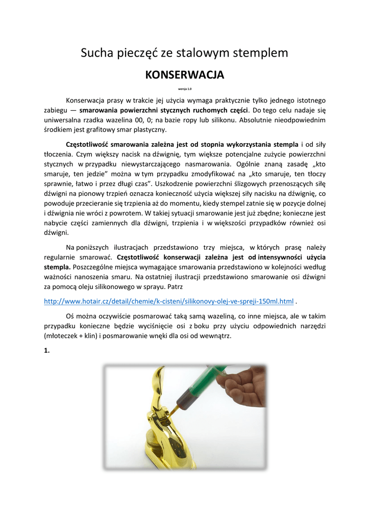 Sucha pieczęć ze stalowym stemplem KONSERWACJA wersja 1.0 Konserwacja prasy w trakcie jej użycia wymaga praktycznie tylko jednego istotnego zabiegu — smarowania powierzchni stycznych ruchomych części. Do tego celu nadaje się uniwersalna rzadka wazelina 00, 0; na bazie ropy lub silikonu. Absolutnie nieodpowiednim środkiem jest grafitowy smar plastyczny. Częstotliwość smarowania zależna jest od stopnia wykorzystania stempla i od siły tłoczenia. Czym większy nacisk na dźwignię, tym większe potencjalne zużycie powierzchni stycznych w przypadku niewystarczającego nasmarowania. Ogólnie znaną zasadę „kto smaruje, ten jedzie” można w tym przypadku zmodyfikować na „kto smaruje, ten tłoczy sprawnie, łatwo i przez długi czas”. Uszkodzenie powierzchni ślizgowych przenoszących siłę dźwigni na pionowy trzpień oznacza konieczność użycia większej siły nacisku na dźwignię, co powoduje przecieranie się trzpienia aż do momentu, kiedy stempel zatnie się w pozycje dolnej i dźwignia nie wróci z powrotem. W takiej sytuacji smarowanie jest już zbędne; konieczne jest nabycie części zamiennych dla dźwigni, trzpienia i w większości przypadków również osi dźwigni. Na poniższych ilustracjach przedstawiono trzy miejsca, w których prasę należy regularnie smarować. Częstotliwość konserwacji zależna jest od intensywności użycia stempla. Poszczególne miejsca wymagające smarowania przedstawiono w kolejności według ważności nanoszenia smaru. Na ostatniej ilustracji przedstawiono smarowanie osi dźwigni za pomocą oleju silikonowego w sprayu. Patrz http://www.hotair.cz/detail/chemie/k-cisteni/silikonovy-olej-ve-spreji-150ml.html . Oś można oczywiście posmarować taką samą wazeliną, co inne miejsca, ale w takim przypadku konieczne będzie wyciśnięcie osi z boku przy użyciu odpowiednich narzędzi (młoteczek + klin) i posmarowanie wnęki dla osi od wewnątrz. 1. 2. 3.