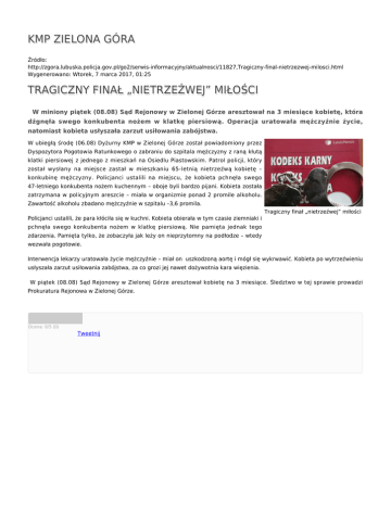 KMP ZIELONA GÓRA Źródło: http://zgora.lubuska.policja.gov.pl/go2/serwis-informacyjny/aktualnosci/11827,Tragiczny-final-nietrzezwej-milosci.html Wygenerowano: Wtorek, 7 marca 2017, 01:25 TRAGICZNY FINAŁ „NIETRZEŹWEJ” MIŁOŚCI W miniony piątek (08.08) Sąd Rejonowy w Zielonej Górze aresztował na 3 miesiące kobietę, która dźgnęła swego konkubenta nożem w klatkę piersiową. Operacja uratowała mężczyźnie życie, natomiast kobieta usłyszała zarzut usiłowania zabójstwa. W ubiegłą środę (06.08) Dyżurny KMP w Zielonej Górze został powiadomiony przez Dyspozytora Pogotowia Ratunkowego o zabraniu do szpitala mężczyzny z raną kłutą klatki piersiowej z jednego z mieszkań na Osiedlu Piastowskim. Patrol policji, który został wysłany na miejsce zastał w mieszkaniu 65-letnią nietrzeźwą kobietę – konkubinę mężczyzny. Policjanci ustalili na miejscu, że kobieta pchnęła swego 47-letniego konkubenta nożem kuchennym – oboje byli bardzo pijani. Kobieta została zatrzymana w policyjnym areszcie – miała w organizmie ponad 2 promile alkoholu. Zawartość alkoholu zbadano mężczyźnie w szpitalu –3,6 promila. Tragiczny finał „nietrzeźwej” miłości Policjanci ustalili, że para kłóciła się w kuchni. Kobieta obierała w tym czasie ziemniaki i pchnęła swego konkubenta nożem w klatkę piersiową. Nie pamięta jednak tego zdarzenia. Pamięta tylko, że zobaczyła jak leży on nieprzytomny na podłodze – wtedy wezwała pogotowie. Interwencja lekarzy uratowała życie mężczyźnie – miał on uszkodzoną aortę i mógł się wykrwawić. Kobieta po wytrzeźwieniu usłyszała zarzut usiłowania zabójstwa, za co grozi jej nawet dożywotnia kara więzienia. W piątek (08.08) Sąd Rejonowy w Zielonej Górze aresztował kobietę na 3 miesiące. Śledztwo w tej sprawie prowadzi Prokuratura Rejonowa w Zielonej Górze. Ocena: 0/5 (0) Tweetnij