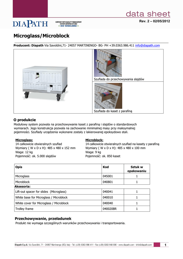 Rev. 2 – 02/05/2012 Microglass/Microblock Producent: Diapath Via Savoldini,71- 24057 MARTINENGO- BG- PH +39.0363.986.411 [email protected] Szuflada do przechowywania slajdów Szuflada do kaset z parafiną O produkcie Modułowy system pozwala na przechowywanie kaset z parafiną i slajdów o standardowych wymiarach. Jego konstrukcja pozwala na zachowanie minimalnej masy przy maksymalnej pojemności. Szuflady urządzenia wykonane zostały z lakierowanej epoksydowo stali. Microglass: 14 całkowicie otwieralnych szuflad Wymiary ( W x D x H): 485 x 480 x 152 mm Waga: 12 kg Pojemność: ok. 5.000 slajdów Microblock: 14 całkowicie otwieralnych szuflad na kasety z parafiną Wymiary ( W x D x H): 485 x 480 x 100 mm Waga: 9 kg Pojemność: ok. 850 kaset Opis Kod Sztuk w opakowaniu Microglass 045001 1 Microblock 040801 1 Lift-out spacer for slides (Microglass) 040041 1 White base for Microglass / Microblock 040010 1 White cover for Microglass / Microblock 040040 1 Trolley frame 040020BR 1 Aksesoria: Przechowywanie, przeładunek Produkt nie wymaga szczególnych warunków przechowywania i transportowania. 1