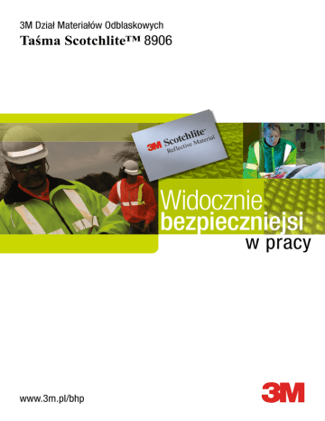 3M Dział Materiałów Odblaskowych Taśma Scotchlite™ 8906 Widocznie bezpieczniejsi w pracy www.3m.pl/bhp Scotchlite™ 8906 Scotchlite™ 8906 – srebrna taśma odblaskowa: ■do naszywania; ■do prania w warunkach domowych. Cechy produktu: ■wysoka odblaskowość, zgodna z normą EN ISO 20471:2013 (klasa II); ■podłoże – tkanina poliestrowo-bawełniana (70% poliestru, 30% bawełny); ■właściwości odblaskowe nieuzależnione od kąta padania światła; ■doskonała układalność na odzieży; ■idealnie nadaje się na kamizelki ostrzegawcze. Trwałość: ■ 30 cykli prania w warunkach domowych, w temperaturze 60°C (według normy EN ISO 20471:2013); ■ taśma posiada certyfikat zgodności z normą EN ISO 20471:2013. Dobra jakość: ■zachowujemy stały, wysoki poziom jakości taśm ScotchliteTM (dzięki produkcji zgodnej ze standardami ISO 9002). Zastosowanie: ■w odzieży z tkanin poliestrowych o gramaturze 150÷200 g/m2; ■w odzieży roboczej (do robót drogowych, pracy na kolei, w transporcie itp.). 3M Poland Sp. z o.o. Dział Materiałów Odblaskowych al. Katowicka 117 05-830 Nadarzyn, Kajetany k. Warszawy tel.: 22 739 60 00 fax: 22 739 60 01 www.3m.pl/bhp
