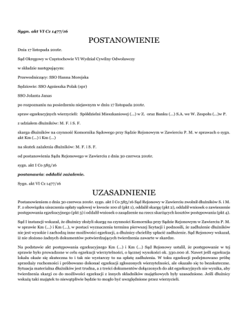 Sygn. akt VI Cz 1477/16 POSTANOWIENIE Dnia 17 listopada 2016r. Sąd Okręgowy w Częstochowie VI Wydział Cywilny Odwoławczy w składzie następującym: Przewodniczący: SSO Hanna Morejska Sędziowie: SSO Agnieszka Polak (spr) SSO Jolanta Janas po rozpoznaniu na posiedzeniu niejawnym w dniu 17 listopada 2016r. spraw egzekucyjnych wierzycieli: Spółdzielni Mieszkaniowej (...) w Z. oraz Banku (...) S.A. we W. Zespołu (...)w P. z udziałem dłużników: M. F. i S. F. skarga dłużników na czynność Komornika Sądowego przy Sądzie Rejonowym w Zawierciu P. M. w sprawach o sygn. akt Km (...) i Km (...) na skutek zażalenia dłużników: M. F. i S. F. od postanowienia Sądu Rejonowego w Zawierciu z dnia 30 czerwca 2016r. sygn. akt I Co 585/16 postanawia: oddalić zażalenie. Sygn. akt VI Cz 1477/16 UZASADNIENIE Postanowieniem z dnia 30 czerwca 2016r. sygn. akt I Co 585/16 Sąd Rejonowy w Zawierciu zwolnił dłużników S. i M. F. z obowiązku uiszczenia opłaty sądowej w kwocie 100 zł (pkt 1), oddalił skargę (pkt 2), oddalił wniosek o zawieszenie postępowania egzekucyjnego (pkt 3) i oddalił wniosek o zasądzenie na rzecz skarżących kosztów postępowania (pkt 4). Sąd I instancji wskazał, że dłużnicy złożyli skargę na czynności Komornika przy Sądzie Rejonowym w Zawierciu P. M. w sprawie Km (...) i Km (...), w postaci wyznaczenia terminu pierwszej licytacji i podnosili, że zadłużenie dłużników nie jest wysokie i zachodzą inne możliwości egzekucji, a dłużnicy chcieliby spłacić zadłużenie. Sąd Rejonowy wskazał, iż nie złożono żadnych dokumentów potwierdzających twierdzenia zawarte w skardze. Na podstawie akt postępowania egzekucyjnego Km (...) i Km (...) Sąd Rejonowy ustalił, że postępowanie w tej sprawie było prowadzone w celu egzekucji wierzytelności, o łącznej wysokości ok. 330.000 zł. Nawet jeśli egzekucja lokalu okaże się skuteczna to i tak nie wystarczy to na spłatę zadłużenia. W toku egzekucji podejmowano próbę sprzedaży ruchomości i próbowano dokonać egzekucji zgłoszonych wierzytelności, ale okazało się to bezskuteczne. Sytuacja materialna dłużników jest trudna, a z treści dokumentów dołączonych do akt egzekucyjnych nie wynika, aby twierdzenia skargi co do możliwości egzekucji z innych składników majątkowych były uzasadnione. Jeśli dłużnicy wskażą taki majątek to niewątpliwie będzie to mogło być uwzględnione przez wierzycieli. Sąd Rejonowy odnosząc się do treści art. 767 k.p.c. podał, że na czynności komornika przysługuje skarga, ale w tym trybie można skutecznie zaskarżyć jedynie uchybienia w czynnościach egzekucyjnych, bądź bezczynność komornika. Zgodnie z art. 804 k.p.c. organ egzekucyjny nie jest uprawniony do badania zasadności i wymagalności obowiązku stwierdzonego tytułem wykonawczym. Komornik wszczął egzekucję w sprawie i prowadził ją zgodnie z wnioskiem wierzyciela, na podstawie złożonego do akt tytułu wykonawczego, dlatego w ocenie Sądu Rejonowego brak było podstaw do kwestionowania tych czynności. Jako podstawę prawną rozstrzygnięcia Sąd wskazał art. art. 767 k.p.c., art. 804 k.p.c. art. 942 k.p.c. i art. 945 k.p.c. Zażalenie na powyższe postanowienie złożyli dłużnicy M. F. i S. F. wnosząc o jego zmianę i uwzględnienie skargi. Skarżący zarzucili nienależytą interpretację art. 798 k.p.c. oraz art. 799 k.p.c. W uzasadnieniu zażalenia wskazali, że wyrażają wolę polubownego uregulowania należności wobec wierzycieli. Natomiast zgodnie z treścią art. 799 § 1 k.p.c. chcą to zrobić w sposób najmniej uciążliwy, a zarazem najbardziej skuteczny dla wierzycieli. Niestety wierzyciele wybrali najbardziej uciążliwy i godzący w interes dłużników sposób tj. wskazując możliwość prowadzenia postępowania egzekucyjnego z ich nieruchomości. Zdaniem skarżących wierzyciele mogli uzyskać zaspokojenie swoich należności z innych składników majątkowych dłużników. Nadto na podstawie art. 798 k.p.c. dłużnikom przysługuje wybór między świadczeniami, które mają spełnić, a jeśli jeszcze tego nie dokonali, komornik wszczynając egzekucję celem spełnienia tych świadczeń, na wniosek wierzyciela wyznacza dłużnikom odpowiedni termin do dokonania wyboru. Dopiero po upływie tego terminu wierzyciel wybiera świadczenie, które ma być spełnione. Według skarżących wierzyciel uzyskałby swoje należności, a dłużnicy bez zbędnego ciężaru spłaciliby je. Sąd Okręgowy zważył, co następuje: Zażalenie nie jest uzasadnione. Na wstępie należy zauważyć, że w uzasadnieniu Sądu Rejonowego wystąpiła zdaniem Sądu Okręgowego omyłka pisarska, która nie ma wpływu na trafność orzeczenia. Sąd ten wskazał, że dłużnicy złożyli skargę na czynności Komornika przy Sądzie Rejonowym w Zawierciu P. M. w sprawie Km (...) i Km (...), w postaci wyznaczenia terminu pierwszej licytacji, podczas, gdy skarga dotyczyła czynności polegającej na wyznaczeniu terminu opisu i oszacowania spółdzielczego własnościowego prawa do lokalu mieszkalnego nr (...) położonego w Z. przy ulicy (...). Okoliczność ta jasno wynika z treści skargi i Sąd Rejonowy odnosi się do niej w dalszej części uzasadnienia powołując odpowiednie przepisy m.in. art. 942 k.p.c. i 945 k.p.c. Rozstrzygnięcie Sądu Rejonowego odpowiada prawu i nie narusza wskazanych przez skarżących przepisów art. 798 k.p.c. oraz art. 799 k.p.c.. Przepis art. 798 k.p.c. stanowi, że „ jeżeli dłużnikowi przysługuje wybór między świadczeniami, które ma spełnić, a wyboru jeszcze nie dokonał, komornik, wszczynając egzekucję celem spełnienia tych świadczeń, na wniosek wierzyciela wyznaczy dłużnikowi odpowiedni termin do dokonania wyboru. Po bezskutecznym upływie tego terminu wierzyciel wybierze świadczenie, które ma być spełnione”. Przepis ten dotyczy egzekucji, w której przedmiotem są świadczenia wynikające z zobowiąza