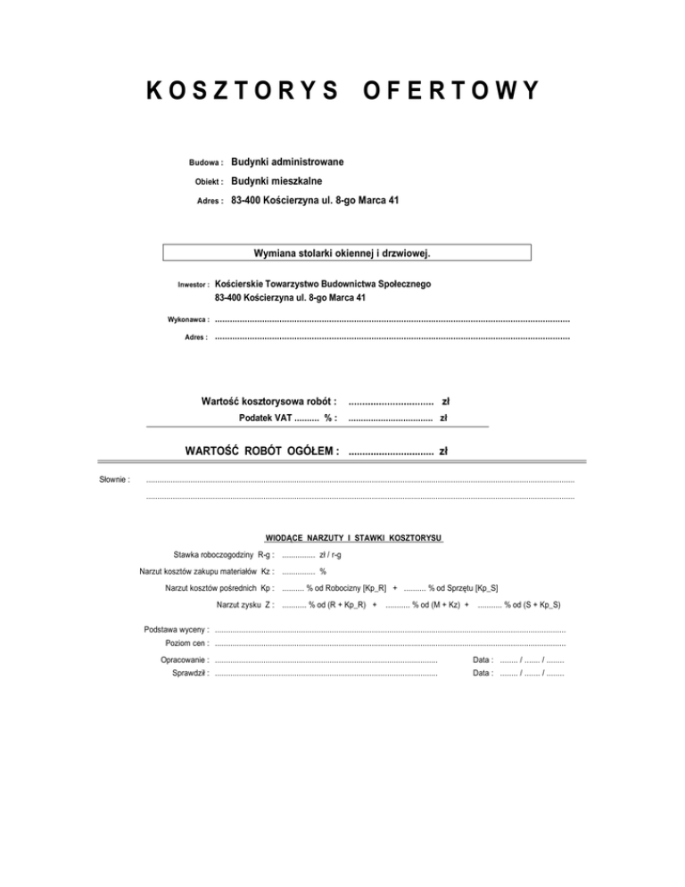 KOSZTORYS OFERTOWY Budowa : Budynki administrowane Obiekt : Budynki mieszkalne Adres : 83-400 Kościerzyna ul. 8-go Marca 41 Wymiana stolarki okiennej i drzwiowej. Inwestor : Kościerskie Towarzystwo Budownictwa Społecznego 83-400 Kościerzyna ul. 8-go Marca 41 Wykonawca : ............................................................................................................................................... Adres : ............................................................................................................................................... Wartość kosztorysowa robót : ............................... zł Podatek VAT .......... % : .................................. zł WARTOŚĆ ROBÓT OGÓŁEM : ............................... zł Słownie : .................................................................................................................................................................................................. .................................................................................................................................................................................................. WIODĄCE NARZUTY I STAWKI KOSZTORYSU Stawka roboczogodziny R-g : ............... zł / r-g Narzut kosztów zakupu materiałów Kz : ............... % Narzut kosztów pośrednich Kp : .......... % od Robocizny [Kp_R] + .......... % od Sprzętu [Kp_S] Narzut zysku Z : ........... % od (R + Kp_R) + ........... % od (M + Kz) + ........... % od (S + Kp_S) Podstawa wyceny : ............................................................................................................................................................... Poziom cen : ............................................................................................................................................................... Opracowanie : ..................................................................................................... Data : ........ / ....... / ........ Sprawdził : ..................................................................................................... Data : ........ / ....... / ........ FORMULARZ OFERTOWY ORGBUD-SERWIS Poznań KOBRA wer. 9.0 Wymiana stolarki okiennej i drzwiowej. Budowa : Budynki administrowane Obiekt : Budynki mieszkalne Adres : 83-400 Kościerzyna ul. 8-go Marca 41 WIODĄCE NARZUTY I STAWKI KOSZTORYSU Stawka roboczogodziny R-g : ............... zł / r-g Narzut kosztów zakupu materiałów Kz : ............... % Narzut kosztów pośrednich Kp : ............... % od Robocizny [Kp_R] + ............... % od Sprzętu [Kp_S] Narzut zysku Z : ............... % od (R + Kp_R) + ............... % od (M+ Kz) + ............... % od (S + Kp_S) Poziom cen : .................................................................................................................................... TABELA ELEMENTÓW SCALONYCH Lp. Opis pozycji tabeli Str: 1 Wartość [ zł ] A Stolarka okienna i drzwiowa A.a Dworcowa 16 - wymiana drzwi wejściowych .................................. A.b Kartuska 8 - wymiana drzwi wejściowych i drzwi do piwnicy .................................. A.c Kartuska 12 - wymiana drzwi wejściowych .................................. A.d Kartuska 16 - wymiana drzwi do piwnicy .................................. A.e Tysiąclecia 2 - wymiana okien w pralni i suszarnia oraz je zmiejszenie .................................. A.f Tysiąclecia 5 - wymiana drzwi do piwnicy .................................. A.g Tysiąclecia 13 - wymiana okien w piwnicy .................................. A.h Rogali 18 - wymiana drzwi wejściowych, loggi i do piwnicy .................................. A.i Strzelecka 26 -wymiana okien na klatce schodowej i w części wspólnej .................................. A.j Rynek 19 - drzwi na klatce schodowej wewnętrzne PCV .................................. Razem : Stolarka okienna i drzwiowa .................................. K O S Z T O R Y S O W A W A R T O Ś Ć R O B Ó T : .................................. FORMULARZ OFERTOWY ORGBUD-SERWIS Poznań KOBRA wer. 9.0 Wymiana stolarki okiennej i drzwiowej. Budowa : Budynki administrowane Obiekt : Budynki mieszkalne Adres : 83-400 Kościerzyna ul. 8-go Marca 41 WIODĄCE NARZUTY I STAWKI KOSZTORYSU Stawka roboczogodziny R-g : ............... zł / r-g Narzut kosztów zakupu materiałów Kz : ............... % Narzut kosztów pośrednich Kp : ............... % od Robocizny [Kp_R] + ............... % od Sprzętu [Kp_S] Narzut zysku Z : ............... % od (R + Kp_R) + ............... % od (M+ Kz) + ............... % od (S + Kp_S) Poziom cen : .................................................................................................................................... KOSZTORYS OFERTOWY Lp. Podstawa kalkulacji / Opis pozycji Ilość J.m. Cena jednostkowa Str: 1 Wartość [ zł ] A. Stolarka okienna i drzwiowa A.a. Dworcowa 16 - wymiana drzwi wejściowych 1. KNR 401-0354-05-00 3,480 m2 Wykucie z muru ościeŜnic drewnianych o powierzchni: ponad 2 m2 - drzwi ............................... ............................... 2. KNR 401-0318-06-00 3,480 m2 ............................... ............................... Obsadzenie ościeŜnic drewnianych w ścianach zewnętrznych z cegieł, o powierzchni otworu: ponad 2 m2 - drzwi aluminiowe zewnętrzne łukowe 3. A.wł 3,480 m2 ............................... ............................... Dostawa materiałów - drzwi zewnętrzne aluminiowe łukowe1,5 skrzydłowe z przegrodą termiczną o współczynniku przenikania ciepła 1,4 W/m2K w kolorze brązowym wyposaŜone w elektrozaczep, klamko -klamkę, zamek punktowy zwykły z wkładką, próg, samozamykacz z fukcja stop, szyba o wspólczynniku przenikania ciepła 1,1 W/m2xK / skrzydło o wymiarach 90x200 cm/ 4. 15,000 szt ............................... ............................... Dorobienie kluczy 5. KNR 401-0708-02-00 6,250 m .........................