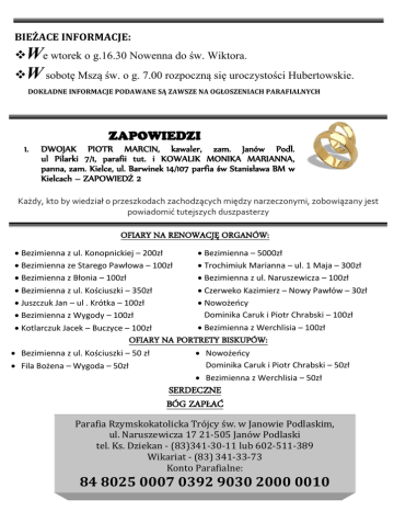 BIEŻACE INFORMACJE: We wtorek o g.16.30 Nowenna do św. Wiktora. W sobotę Mszą św. o g. 7.00 rozpoczną się uroczystości Hubertowskie. DOKŁADNE INFORMACJE PODAWANE SĄ ZAWSZE NA OGŁOSZENIACH PARAFIALNYCH ZAPOWIEDZI 1. DWOJAK PIOTR MARCIN, kawaler, zam. Janów Podl. ul Pilarki 7/1, parafii tut. i KOWALIK MONIKA MARIANNA, panna, zam. Kielce, ul. Barwinek 14/107 parfia św Stanisława BM w Kielcach – ZAPOWIEDŹ 2 Każdy, kto by wiedział o przeszkodach zachodzących między narzeczonymi, zobowiązany jest powiadomić tutejszych duszpasterzy OFIARY NA RENOWACJĘ ORGANÓW: Bezimienna z ul. Konopnickiej – 200zł Bezimienna ze Starego Pawłowa – 100zł Bezimienna z Błonia – 100zł Bezimienna z ul. Kościuszki – 350zł Juszczuk Jan – ul . Krótka – 100zł Bezimienna z Wygody – 100zł Kotlarczuk Jacek – Buczyce – 100zł Bezimienna – 5000zł Trochimiuk Marianna – ul. 1 Maja – 300zł Bezimienna z ul. Naruszewicza – 100zł Czerweko Kazimierz – Nowy Pawłów – 30zł Nowożeńcy Dominika Caruk i Piotr Chrabski – 100zł Bezimienna z Werchlisia – 100zł OFIARY NA PORTRETY BISKUPÓW: Bezimienna z ul. Kościuszki – 50 zł Fila Bożena – Wygoda – 50zł Nowożeńcy Dominika Caruk i Piotr Chrabski – 50zł Bezimienna z Werchlisia – 50zł SERDECZNE BÓG ZAPŁAĆ Parafia Rzymskokatolicka Trójcy św. w Janowie Podlaskim, ul. Naruszewicza 17 21-505 Janów Podlaski tel. Ks. Dziekan - (83)341-30-11 lub 602-511-389 Wikariat - (83) 341-33-73 Konto Parafialne: 84 8025 0007 0392 9030 2000 0010 5 października 2014 r. Nr 40 W CIENIU KOLEGIATY PISMO PARAFII TRÓJCY ŚW. W JANOWIE PODLASKIM -do użytku wewnętrznego- DWUDZIESTA SIÓDMA NIEDZIELA ZWYKŁA Jezus powiedział do arcykapłanów i starszych ludu: Posłuchajcie innej przypowieści! Był pewien gospodarz, który założył winnicę. Otoczył ją murem, wykopał w niej tłocznię, zbudował wieżę, w końcu oddał ją w dzierżawę rolnikom i wyjechał. Gdy nadszedł czas zbiorów, posłał swoje sługi do rolników, by odebrali plon jemu należny. Ale rolnicy chwycili jego sługi i jednego obili, drugiego zabili, trzeciego zaś ukamienowali. Wtedy posłał inne sługi, więcej niż za pierwszym razem, lecz i z nimi tak samo postąpili. W końcu posłał do nich swego syna, tak sobie myśląc: Uszanują mojego syna. Lecz rolnicy zobaczywszy syna mówili do siebie: To jest dziedzic; chodźcie zabijmy go, a posiądziemy jego dziedzictwo. Chwyciwszy go, wyrzucili z winnicy i zabili. Kiedy więc właściciel winnicy przyjdzie, co uczyni z owymi rolnikami? Rzekli Mu: Nędzników marnie wytraci, a winnicę odda w dzierżawę innym rolnikom, takim, którzy mu będą oddawali plon we właściwej porze. Jezus im rzekł: Czy nigdy nie czytaliście w Piśmie: Właśnie ten kamień, który odrzucili budujący, stał się głowicą węgła. Pan to sprawił, i jest cudem w naszych oczach. Dlatego powiadam wam: Królestwo Boże będzie wam zabrane, a dane narodowi, który wyda jego owoce. Mt 21,33–43 Iz 5,1-7; Flp 4,6-9; Mt 21,33-43 ZE SKARBCA SŁÓW ŚW. JANA PAWŁA II "Różaniec jest to modlitwa, którą bardzo ukochałem (…). Przedziwna w swej istocie i głębi (…). Oto bowiem na kanwie słów Pozdrowienia Anielskiego przesuwają się przed oczyma naszej duszy główne momenty z życia Jezusa Chrystusa (…) jakbyśmy obcowali z Panem Jezusem przez serce Jego Matki. Równocześnie zaś w te same dziesiątki różańca, serce nasze może wprowadzić wszystkie sprawy, które składają się na życie człowieka, rodziny, narodu, Kościoła, ludzkości (…). W tajemnicach radosnych widzimy (…) radość rodziny, macierzyństwa, przyjaźni, wzajemnej pomocy. W tajemnicach bolesnych rozważamy w Chrystusie (i razem z Jego Matką) wszystkie cierpienia człowieka. W tajemnicach chwalebnych odżywają nadzieje życia wiecznego. W Chrystusie zmartwychwstałym cały świat zmartwychwstaje". Via Consecrata PONIEDZIAŁEK – 6 października 2014 7.00 1. – O przebłaganie za grzech pokoleniowe i uzdrowienie ich następstw w rodzinie Bogu wiadomej 2. + Tadeusza, Wiesława, Marka, Zdzisława, zm. zr. Karpiuków – Antonina Karpiuk 17.00 1. + Wiktora i Annę Jańczuk – zakończenie gregorianki 2. + Ryszarda i Sławomirę Sadowskich, Olgę i Włodzimierza Ziniewiczów, Justynę i Pawła Szagunów 3. + Jana (15r), Mariannę, Tomasza, Aleksandrę, Jerzego Trochimiuków – Rodzina WTOREK – 7 października 2014 WSPOMNIENIE NAJŚWIĘTSZEJ MARYI PANNY RÓŻAŃCOWEJ 7.00 1. – O przebłaganie za grzech pokoleniowe i uzdrowienie ich następstw w rodzinie Bogu wiadomej 2. + Za zmarłe siostry KRK zel. Teresy Prokopiuk i za zmarłych z ich rodzin Nowenna do św. Wiktora g 16.30 17.00 1. + Franciszka z racji imienin – Mama 2. + Zofię i Tadeusza Rogulskich – Syn z rodziną ŚRODA – 8 października 2014 7.00 1. + Jadwigę, Grzegorza Durajko, zm. zr. Durajków, Tereszków, Lenartowiczów – Dzieci 2. + Antoninę Szewczuk (1r) – Córka 3. + Kazimierę Marcinuk (30dz) 17.00 1. + Sabinę (r), Wiktora, zm. zr. Brzezińskich – Dzieci 2. – O przebłaganie za grzech pokoleniowe i uzdrowienie ich następstw w rodzinie Bogu wiadomej CZWARTEK – 9 października 2014 WSPOMNIENIE BŁ. WINCENTEGO KADŁUBKA, BISKUPA 7.00 1. + Franciszka, Andrzeja, zm. zr. Peszuków, Łukaszuków, Kowaluków, Sositków – Rodzina 2. – O przebłaganie za grzech pokoleniowe i uzdrowienie ich następstw w rodzinie Bogu wiadomej 3. + Władysława Skórkiewiczów (9dz) 17.00 1. + Nadzieję (r), Edwarda, Zbigniewa, Mariannę, Stanisława zm. zr. Samków – Rodzina 2. + Marka Mamruka PIĄTEK – 10 października 2014 7.00 1. – O przebłaganie za grzech pokoleniowe i uzdrowienie ich następstw w rodzinie Bogu wiadomej 2. + Irenę, Bronisławę, Józefa, Juliana, Kazimierza, zm. zr. Stachniaków, Filipiuków, Michaluków, Wojczuków – Maria Michaluk KORONKA DO MIŁOSIERDZIA BOŻEGO g. 16.30 17.00 1. + Stanisława, Jana, Janinę Eugeniusza, Jerzego, An