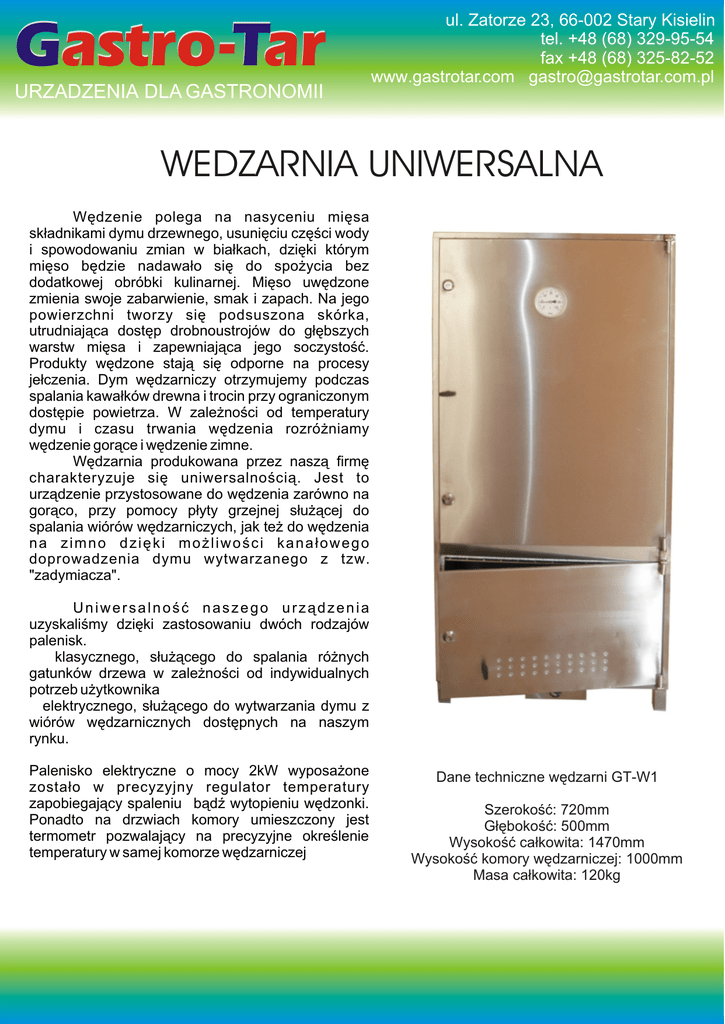 Gastro-Tar Gastro-Tar URZADZENIA DLA GASTRONOMII ul. Zatorze 23, 66-002 Stary Kisielin tel. +48 (68) 329-95-54 fax +48 (68) 325-82-52 www.gastrotar.com [email protected] WEDZARNIA UNIWERSALNA Wêdzenie polega na nasyceniu miêsa sk³adnikami dymu drzewnego, usuniêciu czêœci wody i spowodowaniu zmian w bia³kach, dziêki którym miêso bêdzie nadawa³o siê do spo¿ycia bez dodatkowej obróbki kulinarnej. Miêso uwêdzone zmienia swoje zabarwienie, smak i zapach. Na jego powierzchni tworzy siê podsuszona skórka, utrudniaj¹ca dostêp drobnoustrojów do g³êbszych warstw miêsa i zapewniaj¹ca jego soczystoœæ. Produkty wêdzone staj¹ siê odporne na procesy je³czenia. Dym wêdzarniczy otrzymujemy podczas spalania kawa³ków drewna i trocin przy ograniczonym dostêpie powietrza. W zale¿noœci od temperatury dymu i czasu trwania wêdzenia rozró¿niamy wêdzenie gor¹ce i wêdzenie zimne. Wêdzarnia produkowana przez nasz¹ firmê charakteryzuje siê uniwersalnoœci¹. Jest to urz¹dzenie przystosowane do wêdzenia zarówno na gor¹co, przy pomocy p³yty grzejnej s³u¿¹cej do spalania wiórów wêdzarniczych, jak te¿ do wêdzenia na zimno dziêki mo¿liwoœci kana³owego doprowadzenia dymu wytwarzanego z tzw. "zadymiacza". Uniwersalnoœæ naszego urz¹dzenia uzyskaliœmy dziêki zastosowaniu dwóch rodzajów palenisk. ? klasycznego, s³u¿¹cego do spalania ró¿nych gatunków drzewa w zale¿noœci od indywidualnych potrzeb u¿ytkownika ? elektrycznego, s³u¿¹cego do wytwarzania dymu z wiórów wêdzarnicznych dostêpnych na naszym rynku. Palenisko elektryczne o mocy 2kW wyposa¿one zosta³o w precyzyjny regulator temperatury zapobiegaj¹cy spaleniu b¹dŸ wytopieniu wêdzonki. Ponadto na drzwiach komory umieszczony jest termometr pozwalaj¹cy na precyzyjne okreœlenie temperatury w samej komorze wêdzarniczej Dane techniczne wêdzarni GT-W1 Szerokoœæ: 720mm G³êbokoœæ: 500mm Wysokoœæ ca³kowita: 1470mm Wysokoœæ komory wêdzarniczej: 1000mm Masa ca³kowita: 120kg