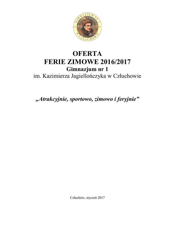 OFERTA FERIE ZIMOWE 2016/2017 Gimnazjum nr 1 im. Kazimierza Jagiellończyka w Człuchowie „Atrakcyjnie, sportowo, zimowo i feryjnie” Człuchów, styczeń 2017 HARMONOGRAM ZAJĘĆ W CZASIE FERII RODZAJ ZAJĘĆ TERMIN MIEJSCE ZAJĘĆ I TYDZIEŃ FERII 16.01.2017 9:00 – 13:00 16.01.2017 9:00 – 13:00 17.01.2017 9:00 – 12:00 17.01.2017 9:00 – 13:00 17.01.2017 10:00 – 12:00 17.01.2017 9:00 – 13:00 18.01.2017 9:00 – 13:00 18.01.2017 9:00 – 12:00 18.01.2017 9:00 – 13:00 19.01.2017 9:00 – 13:00 19.01.2017 9:00 – 13:00 19.01.2017 10:00 – 12:00 19.01.2017 9:00 – 12:00 20.01.2017 9:00 – 13:00 20.01.2017 7:00 – 22:00 Zajęcia z edukacji czytelniczej i informacyjnej Gimnazjum nr 1 w Człuchowie - czytelnia biblioteki szkolnej Program zajęć rekreacyjno-sportowych mała hala gimnastyczna Gimnazjum nr 1 w Człuchowie, - basen sportowy oraz lodowisko kryte przy basenie sportowym w Człuchowie Przedpołudnie z filmem Gimnazjum nr 1 w Człuchowie, sala 71 Program zajęć rekreacyjno-sportowych mała hala gimnastyczna Gimnazjum nr 1 w Człuchowie, - basen sportowy oraz lodowisko kryte przy basenie sportowym w Człuchowie British Day Gimnazjum nr 1 w Człuchowie, sala 57 Zajęcia z edukacji czytelniczej i informacyjnej Gimnazjum nr 1 w Człuchowie - czytelnia biblioteki szkolnej Program zajęć rekreacyjno-sportowych mała hala gimnastyczna Gimnazjum nr 1 w Człuchowie, - basen sportowy oraz lodowisko kryte przy basenie sportowym w Człuchowie Przedpołudnie z filmem Gimnazjum nr 1 w Człuchowie, sala 71 Zajęcia z edukacji czytelniczej i informacyjnej Gimnazjum nr 1 w Człuchowie - czytelnia biblioteki szkolnej Program zajęć rekreacyjno-sportowych mała hala gimnastyczna Gimnazjum nr 1 w Człuchowie, - basen sportowy oraz lodowisko kryte przy basenie sportowym w Człuchowie Zajęcia z edukacji czytelniczej i informacyjnej Gimnazjum nr 1 w Człuchowie - czytelnia biblioteki szkolnej British Day Gimnazjum nr 1 w Człuchowie, sala 57 Przedpołudnie z filmem Gimnazjum nr 1 w Człuchowie, sala 71, wyjście do redakcji „Tygodnika Człuchowskiego” Program zajęć rekreacyjno-sportowych mała hala gimnastyczna Gimnazjum nr 1 w Człuchowie, - basen sportowy oraz lodowisko kryte przy basenie sportowym w Człuchowie Teatr i Ja Teatr Muzyczny w Gdyni - wycieczka II TYDZIEŃ FERII 23.01.2017 9:00 – 13:00 24.01.2017 10:00 – 12:00 24.01.2017 9:00 – 13:00 25.01.2017 9:00 – 13:00 26.01.2017 10:00 – 12:00 26.01.2017 9:00 – 13:00 27.01.2017 9:00 – 13:00 Program zajęć rekreacyjno-sportowych mała hala gimnastyczna Gimnazjum nr 1 w Człuchowie, - basen sportowy oraz lodowisko kryte przy basenie sportowym w Człuchowie British Day Gimnazjum nr 1 w Człuchowie, sala 57 Program zajęć rekreacyjno-sportowych mała hala gimnastyczna Gimnazjum nr 1 w Człuchowie, - basen sportowy oraz lodowisko kryte przy basenie sportowym w Człuchowie Program zajęć rekreacyjno-sportowych mała hala gimnastyczna Gimnazjum nr 1 w Człuchowie, - basen sportowy oraz lodowisko kryte przy basenie sportowym w Człuchowie British Day Gimnazjum nr 1 w Człuchowie, sala 57 Program zajęć rekreacyjno-sportowych mała hala gimnastyczna Gimnazjum nr 1 w Człuchowie, - basen sportowy oraz lodowisko kryte przy basenie sportowym w Człuchowie Program zajęć rekreacyjno-sportowych mała hala gimnastyczna Gimnazjum nr 1 w Człuchowie, - basen sportowy oraz lodowisko kryte przy basenie sportowym w Człuchowie