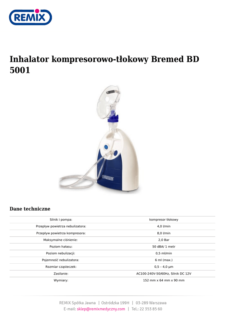 Inhalator kompresorowo-tłokowy Bremed BD 5001 Dane techniczne Silnik i pompa: kompresor tłokowy Przepływ powietrza nebulizatora: 4,0 l/min Przepływ powietrza kompresora: 8,0 l/min Maksymalne ciśnienie: 2,0 Bar Poziom hałasu: 50 dBA/ 1 metr Poziom nebulizacji: 0,5 ml/min Pojemność nebulizatora: 6 ml (max.) Rozmiar cząsteczek: 0,5 – 4,0 µm Zasilanie: AC100-240V-50/60Hz, Silnik DC 12V Wymiary: 152 mm x 64 mm x 90 mm Masa: 420 g Zestaw akcesoriów: Maseczka dla dorosłych x 1 Maseczka dla dzieci x 1 Ustnik x 1 Nebulizator (pojemnik na lek) x 1 Przewód powietrza 1,20 m Zestaw 2 filtrów Nylonowa saszetka