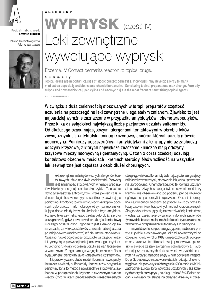 A L E R G E N Y Prof. dr hab. n. med. Edward Rudzki Klinika Dermatologiczna A.M. w Warszawie WYPRYSK (część IV) Leki zewnętrzne wywołujące wyprysk Eczema. IV Contact dermatits reaction to topical drugs. S u m m a r y Topical drugs are important causes of atopic contact dermatitis. Individuals may develop allergy to many medication especially antibiotics and chemiotherapeutics. Sensitizing topical preparations may change. Formerly sulpha and now antibiotics [ penicylins and neomycins] are the most frequent senstitizing topical agents. ........................... W związku z dużą zmiennością stosowanych w terapii preparatów częstość uczulenia na poszczególne leki zewnętrzne ulega stałym zmianom. Zjawisko to jest najbardziej wyraźnie zaznaczone w przypadku antybiotyków i chemoterapeutyków. Przez kilka dziesięcioleci największą liczbę pacjentów uczulały sulfonamidy. Od dłuższego czasu najczęstszymi alergenami kontaktowymi w obrębie leków zewnętrznych są antybiotyki aminoglikozydowe, spośród których uczula głównie neomycyna. Pomiędzy poszczególnymi antybiotykami z tej grupy nieraz zachodzą odczyny krzyżowe, z których największe znaczenie kliniczne mają odczyny krzyżowe między neomycyną i gentamycyną. Ostatnio coraz częściej uczulają kontaktowo obecne w maściach i kremach steroidy. Nadwrażliwość na wszystkie leki zewnętrzne jest częstsza u osób dłużej chorujących. L eki zewnętrzne należą do ważnych alergenów kontaktowych. Mają one dwie osobliwości. Pierwszą jest zmienność stosowanych w terapii preparatów. Niekiedy następuje ona bardzo szybko. To ostatnie dotyczy zwłaszcza antybiotyków. Przez pewien czas w dermatologii stosowane były maści i kremy zawierające penicylinę. Działo się to w okresie, kiedy szczepów opornych było bardzo mało i dlatego otrzymywano zaskakująco dobre efekty leczenia. Jednak z tego antybiotyku, jako leku zewnętrznego, trzeba było dość szybko zrezygnować, gdyż powodował on alergię kontaktową u dużego odsetka osób. Zgodne to jest z dawno opisaną zasadą, że większość leków znacznie łatwiej uczula po miejscowym (naskórnym) niż doustnym stosowaniu. Opisano nawet pojedyńcze przypadki wstrząsów anafilaktycznych po pierwszej iniekcji omawianego antybiotyku u chorych, którzy wcześniej uczulili się nań leczeniem zewnętrznym. Z tego samego względu jeszcze krótsza była „kariera” penicyliny jako konserwanta kosmetyków. Nieporównywalnie dłużej maści i kremy, a nawet pudry lecznicze zawierały sulfonamidy. Inaczej niż w przypadku penicyliny była to metoda powszechnie stosowana, zalecana w podręcznikach i zgodna z ówczesnym stanem wiedzy. Choć w latach pięćdziesiątych i sześćdziesiątych 18 ALERGIA Lato 2003 ubiegłego wieku sulfonamidy były najczęściej alergizującymi lekami zewnętrznymi, stosowanie ich jednak powszechnie aprobowano. Chemoterapeutyki te również uczulały, ale u nadwrażliwych w następstwie stosowania maści czy kremów nie obserwowano po podaniu per os objawów ogólnych, co po penicylinie opisywano. Obecnie i penicylina i sulfonamidy zalecane są jeszcze niekiedy przez lekarzy zwolenników tradycyjnych metod terapeutycznych. Alergolodzy interesujący się nadwrażliwością kontaktową wiedzą, że część skierowywanych do nich pacjentów (wprawdzie bardzo mała) może i obecnie być uczulona na zewnętrznie przepisywane sulfonamidy lub penicylinę. Innymi dawniej często alergizującymi, a obecnie prawie zupełnie niestosowanymi lekami zewnętrznymi są dziegcie. Kiedy w roku 1969 grupa czołowych europejskich znawców alergii kontaktowej opracowywała pierwszy w świecie zestaw alergenów standardowy t. j. substancji przeznaczonych do testowania wszystkich chorych na wyprysk, dziegcie zajęły w nim poczesne miejsce. Do prób płatkowych stosowano oba ich rodzaje: drzewne i węglowe. Na pierwszy z nich w grupie 5000 osób z 6 Klinik Zachodniej Europy było wówczas uczulonych 8,6% kolejnych chorych na wyprysk, na drugi - tylko 2,6%. Dalsze badania wykazały, że alergia na dziegieć drzewny u części A L E R G E N Y pacjentów jest wynikiem odczynów krzyżowych z substancjami roślinnymi używanymi do produkcji kosmetyków, co szczególnie wyraźnie występowało w Kopenhadze. Dziś już chorych na wyprysk się dziegciami nie testuje. Mówiąc o nadwrażliwości kontaktowej na leki zewnętrzne trzeba pamiętać, ze stwierdza się ją tylko u ludzi wcześniej cierpiących na jakieś zmiany skórne. Nieraz bywają to alergozy, ale często są to dermatozy zupełnie nie związane z nadwrażliwością. Ze zdrową niezmienioną skorą leki zewnętrzne stykają się głównie w przypadku producentów, których niekiedy alergizują.. Natomiast pielęgniarki smarujące maściami i kremami chorych z reguły się na nie nie uczulają. Chloromycetyna i tetracykliny W kilku krajach , a zwłaszcza w Niemczech, w pewnym okresie chloromycetyna była często stosowanym antybiotykiem dodawanym do maści i innych leków zewnętrznych. Niekiedy stwierdzano na nią nadwrażliwość aż u 8,0% ogółu kolejnych chorych na wyprysk, a w grupie pacjentów z owrzodzeniami podudzi odsetek ten był jeszcze większy. U krócej chorujących na ten typ alergii obserwowano objawy rzadziej (w jednym z materiałów klinicznych u 0,7% osób) niż u dłużej cierpiących na wyprysk (2,9% osób leczonych w tym samym ośrodku). Niekiedy obserwuje się też wyprysk zawodowy. W Polsce opisywano go tylko u producentów leków, ale w Danii był rozpoznawany i u lekarzy weterynarii. Wielokrotnie donoszono, że osoby kontaktowo uczulone na chloramfenikol nieraz źle znoszą podanie doustne lub parenteralne tego leku. Niekiedy (bardzo rzadko) dochodzi nawet do powstania lekkich wstrząsów anafilaktycznych, a względnie częściej do zaburzeń ze strony przewodu pokarmowego i do nudności. U jednego chorego z wypryskiem podudzi i dodatnią próbą płatkową na o