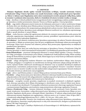 POSTANOWIENIA OGÓLNE § 1. DEFINICJE Niniejszy Regulamin określa ogólne warunki korzystania ze Sklepu, warunki zawierania Umowy o Świadczenie Usług i Umowy Sprzedaży oraz zasady korzystania z usług świadczonych przez Sprzedawcę. Ilekroć w dalszej części Regulaminu użyto niżej wymienionych zwrotów pisanych wielką literą, należy je rozumieć w podanym niżej znaczeniu, chyba że z kontekstu ich użycia wyraźnie wynika co innego: – Cena – określona w złotych polskich kwota wynagrodzenia brutto (uwzględniająca należne podatki) należnego Sprzedawcy tytułem przeniesienia własności Towaru na Klienta zgodnie z Umową Sprzedaży; – Hasło – ciąg znaków alfanumerycznych, konieczny do dokonania autoryzacji w trakcie uzyskiwania dostępu do Konta, który jest określony przez Klienta podczas tworzenia Konta. Klient jest zobowiązany do zachowania Hasła w ścisłej poufności (do nieujawniania go jakimkolwiek osobom trzecim). Hasło może być zmienione w ustawieniach Konta. Sprzedawca może udostępnić Klientowi możliwość tzw. odzyskania zapomnianego Hasła w sposób określony w ramach Sklepu; – Klient – osoba fizyczna o pełnej lub ograniczonej zdolności do czynności prawnych albo osoba prawna lub jednostka organizacyjna nieposiadająca osobowości prawnej, prawidłowo reprezentowana przez właściwą osobę fizyczną, która zaakceptuje Regulamin. – Kod rabatowy – kod rabatowy wydawany przez Sprzedawcę uprawniający do nabycia Towarów oferowanych do sprzedaży w Sklepie po promocyjnej cenie lub przy uwzględnieniu określonego rabatu procentowego lub kwotowego. Klient może otrzymać kod rabatowy podczas akcji promocyjnej organizowanej na odrębnych zasadach przez Sprzedawcę; – Konsument – Klient, który jest osobą fizyczną zawierającą ze Sprzedawcą Umowę o Świadczenie Usług lub Umowę Sprzedaży w celach niezwiązanych bezpośrednio z jej działalnością gospodarczą lub zawodową; – Konto Klienta/Konto – przestrzeń udostępniana Klientowi w ramach Sklepu zgodnie z Umową o Świadczenie Usług, pozwalająca na korzystanie przez Klienta z dodatkowych funkcjonalności/usług. Klient uzyskuje dostęp do Konta Klienta za pomocą Loginu i Hasła. Klient loguje się na swoje Konto po dokonaniu rejestracji na stronie internetowej Sklepu; – Koszyk – usługa udostępniana każdemu Klientowi oraz każdemu użytkownikowi Sklepu, który korzysta ze Sklepu, polegająca w szczególności na umożliwieniu mu łatwego dokonania zakupu jednego lub kilku Towarów, wpisanie Kodów rabatowych umożliwiających obniżenie Ceny na zasadach określonych odrębnymi regulaminami, wyświetlenie podsumowania Ceny zakupu poszczególnych Towarów i wszystkich Towarów łącznie (w tym ew. kosztów wysyłki) oraz dla użytkowników zalogowanych zapamiętanie Towarów dodanych do koszyka również po zakończeniu sesji przeglądarki; – Login – adres e-mail Klienta podany w ramach Sklepu podczas tworzenia Konta przez Klienta; – Newsletter – usługa dostarczania przez Sprzedawcę Klientowi informacji handlowej dotyczącej Towarów lub usług Sprzedawcy lub towarów lub usług podmiotów współpracujących ze Sprzedawcą (tj. towarów lub usług, które nie są Towarami lub usługami oferowanymi przez Sprzedawcę); – Promocje – szczególne warunki sprzedaży, uregulowane na zasadach wyrażonych w odrębnych regulaminach, dotyczące specjalnej oferty Sklepu obowiązującej w określonym czasie, z których Klient może skorzystać na zasadach tam określonych. W przypadku rozbieżności postanowień właściwego regulaminu Promocji z postanowieniami Regulaminu, pierwszeństwo mają postanowienia właściwego regulaminu Promocji; – Umowa o Świadczenie Usług – niniejszy dokument określający zasady zawierania Umów Sprzedaży oraz zasady świadczenia i korzystania z usług oferowanych przez Sprzedawcę za pośrednictwem Sklepu na rzecz Klientów. Regulamin określa prawa i obowiązki Klienta i Sprzedawcy. W zakresie usług świadczonych drogą elektroniczną niniejszy Regulamin jest regulaminem, o którym mowa w art. 8 ustawy z dnia 18 lipca 2002 r. o świadczeniu usług drogą elektroniczną (Dz.U. z 2002 r. Nr 144, poz. 1204 z późn. zm.); – Sklep – platforma sprzedaży Towarów oraz świadczenia usług oferowanych przez Sprzedawcę, prowadzona przez Sprzedawcę, stanowiąca zespół połączonych ze sobą stron internetowych, dostępna za pośrednictwem adresu URL http://intertype.pl – Sprzedawca – „Inter-Type”. z siedzibą w Mysłowicach, ul. Kraszewskiego 6, 41‒400 Mysłowice, wpisana do Re- jestru Ewidencji Przedsiębiorców dla miasta Mysłowice nr 3139/1999, NIP 2220012466, REGON: 278258993, tel. 32 222 88 24, adres poczty elektronicznej: [email protected]. – Towar – rzecz sprzedawana przez Sprzedawcę za pośrednictwem Sklepu na rzecz Klienta, za zapłatą Ceny; – Treść/Treści – elementy tekstowe, graficzne lub multimedialne (np. informacje o Towarach, zdjęcia Towaru, filmy promocyjne, opisy, komentarze) w tym utwory w rozumieniu Ustawy o prawie autorskim i prawach pokrewnych oraz wizerunki osób fizycznych, jakie są zamieszczane i rozpowszechniane przez odpowiednio Sprzedawcę, kontrahentów Sprzedawcy, Klienta albo inną osobę korzystającą ze Sklepu; – Umowa Sprzedaży – umowa sprzedaży w rozumieniu przepisów Kodeksu cywilnego, zawierana z wykorzystaniem środków porozumiewania się na odległość i dotycząca sprzedaży przez Sprzedawcę na rzecz Klienta Towarów za zapłatą Ceny powiększonej o ew. koszty wysyłki; – Wymagania Techniczne – minimalne wymagania techniczne, których spełnienie jest niezbędne do korzystania ze Sklepu, zawarcia Umowy o Świadczenie Usług lub zawarcia Umowy Sprzedaży, określone w Załączniku nr 1 do Regulaminu – Wymagania techniczne korzystania ze Sklepu. Aby utworzyć Konto i dokonać zakupów w Sklepie Klient musi posiadać ważny/aktywny adre