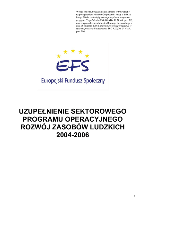 Wersja scalona, uwzględniająca zmiany wprowadzone rozporządzeniem Ministra Gospodarki i Pracy z dnia 22 lutego 2005 r. zmieniającym rozporządzenie w sprawie przyjęcia Uzupełnienia SPO RZL (Dz. U. Nr 40, poz. 382, oraz rozporządzeniem Ministra Rozwoju Regionalnego z dnia 30 stycznia 2006 r. zmieniającym rozporządzenie w sprawie przyjęcia Uzupełnienia SPO RZL(Dz. U. Nr29, poz. 206) UZUPEŁNIENIE SEKTOROWEGO PROGRAMU OPERACYJNEGO ROZWÓJ ZASOBÓW LUDZKICH 2004-2006 1 SPIS TREŚCI Rozdział I. Wstęp ......................................................................................................................................................................... 11 Rozdział II. Cel Uzupełnienia Programu i strategia jego osiągnięcia .......................................................................................... 13 Rozdział III. Ogólny opis oceny ex ante Działań Programu ........................................................................................................ 18 Rozdział IV. Opis Działań w podziale na obszary wsparcia ........................................................................................................ 20 4.1 Aktywna polityka rynku pracy ......................................................................................................................................... 20 4.1.1 Analiza aktywnych form wspierania rozwoju zasobów ludzkich ............................................................................ 20 4.1.2 Wyniki konsultacji społecznych............................................................................................................................... 20 4.1.3 Działanie 1.1 Rozwój i modernizacja instrumentów i instytucji rynku pracy.......................................................... 20 4.1.4 Działanie 1.2 Perspektywy dla młodzieży ............................................................................................................... 33 4.1.5 Działanie 1.3 Przeciwdziałanie i zwalczanie długotrwałego bezrobocia ................................................................. 42 4.2 Przeciwdziałanie zjawisku wykluczenia społecznego ...................................................................................................... 50 4.2.1 Analiza zjawiska wykluczenia społecznego............................................................................................................. 50 4.2.2 Wyniki konsultacji społecznych............................................................................................................................... 51 4.2.3 Działanie 1.4 Integracja zawodowa i społeczna osób niepełnosprawnych .............................................................. 52 4.2.4 Działanie 1.5 Promocja aktywnej polityki społecznej poprzez wsparcie grup szczególnego ryzyka ...................... 63 4.3 Wyrównywanie szans kobiet na rynku pracy ................................................................................................................... 74 4.3.1 Analiza sytuacji kobiet na rynku pracy .................................................................................................................... 74 4.3.2 Wyniki konsultacji społecznych............................................................................................................................... 74 4.3.3 Działanie 1.6 Integracja i reintegracja zawodowa kobiet......................................................................................... 76 4.4 Kształcenie ustawiczne ..................................................................................................................................................... 87 4.4.1 Analiza systemu edukacji, w tym kształcenia ustawicznego ................................................................................... 87 4.4.2 Wyniki konsultacji społecznych............................................................................................................................... 87 4.4.3 Działanie 2.1 Zwiększenie dostępu do edukacji - promocja kształcenia przez całe życie ....................................... 89 4.4.4 Działanie 2.2. Podniesienie jakości edukacji w odniesieniu do potrzeb rynku pracy .............................................. 97 4.5 Adaptacyjność i rozwój przedsiębiorczości.................................................................................................................... 106 4.5.1 Analiza sytuacji przedsiębiorstw, ze szczególnym uwzględnieniem sektora MSP................................................ 106 4.5.2 Wyniki konsultacji społecznych............................................................................................................................. 106 4.5.3 Działanie 2.3 Rozwój kadr nowoczesnej gospodarki............................................................................................. 107 Rozdział V. Priorytet 3 - Pomoc techniczna............................................................................................................................... 122 5.1 Identyfikacja potrzeb pomocy technicznej ..................................................................................................................... 122 5.2 Wsparcie zarządzania SPO RZL..................................................................................................................................... 122 5.3 Informacja i promocja działań SPO RZL ....................................................................................................................... 131 5.4 Zakup sprzętu komputerowego....................................................................................................................................... 139 Rozdział VI. Opis podsumowujący sposób wdrażania działań .................................................................................................. 199 6.1 Zadania Beneficj