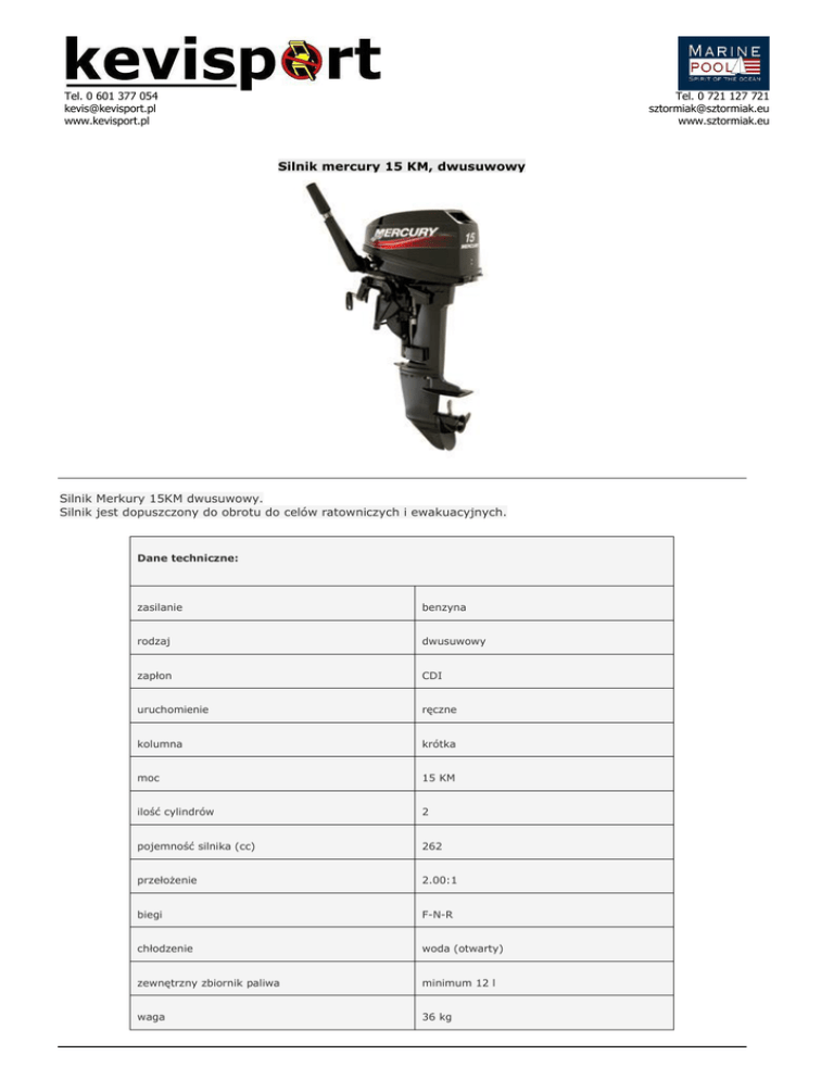Tel. 0 601 377 054 [email protected] www.kevisport.pl Tel. 0 721 127 721 [email protected] www.sztormiak.eu Silnik mercury 15 KM, dwusuwowy Silnik Merkury 15KM dwusuwowy. Silnik jest dopuszczony do obrotu do celów ratowniczych i ewakuacyjnych. Dane techniczne: zasilanie benzyna rodzaj dwusuwowy zapłon CDI uruchomienie ręczne kolumna krótka moc 15 KM ilość cylindrów 2 pojemność silnika (cc) 262 przełożenie 2.00:1 biegi F-N-R chłodzenie woda (otwarty) zewnętrzny zbiornik paliwa minimum 12 l waga 36 kg