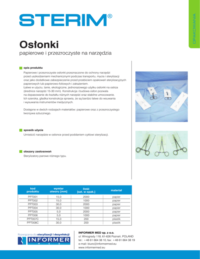 Osłonki papierowe i przezroczyste na narzędzia opis produktu Papierowe i przezroczyste osłonki przeznaczone do ochrony narzędzi przed uszkodzeniami mechanicznymi podczas transportu, mycia i sterylizacji oraz jako dodatkowe zabezpieczenie przed przebiciem opakowań sterylizacyjnych papierowych lub papierowo-foliowych i zakażeniem. Łatwe w użyciu, tanie, ekologiczne, jednorazowego użytku osłonki na ostrza (średnice narzędzi 15-30 mm). Konstrukcja i budowa osłon pozwala na dopasowanie do kształtu różnych narzędzi oraz stabilne umocowanie. Ich szeroka, gładka konstrukcja sprawia, że są bardzo łatwe do wsuwania i wysuwania instrumentów medycznych. Dostępne w dwóch rodzajach materiałów: papierowe oraz z przezroczystego tworzywa sztucznego. sposób użycia Umieścić narzędzie w osłonce przed poddaniem cyklowi sterylizacji. obszary zastosowań Sterylizatory parowe różnego typu. kod produktu wymiar otworu [mm] ilość [szt. w opak.] materiał PPT001 PPT002 PPT003 PPT004 PPT005 PPT006 PPT007C PPT008C 15,0 15,0 30,0 30,0 5,0 5,0 15,0 30,0 2000 1000 2000 1000 2000 1000 200 200 papier papier papier papier papier papier plastik plastik Rozwiązania dla sterylizacji i dezynfekcji INFORMER MED sp. z o.o. ul. Winogrady 118, 61-626 Poznań, POLAND tel.: +48 61 664 38 10, fax: +48 61 664 38 19 e-mail: [email protected] www.informermed.eu
