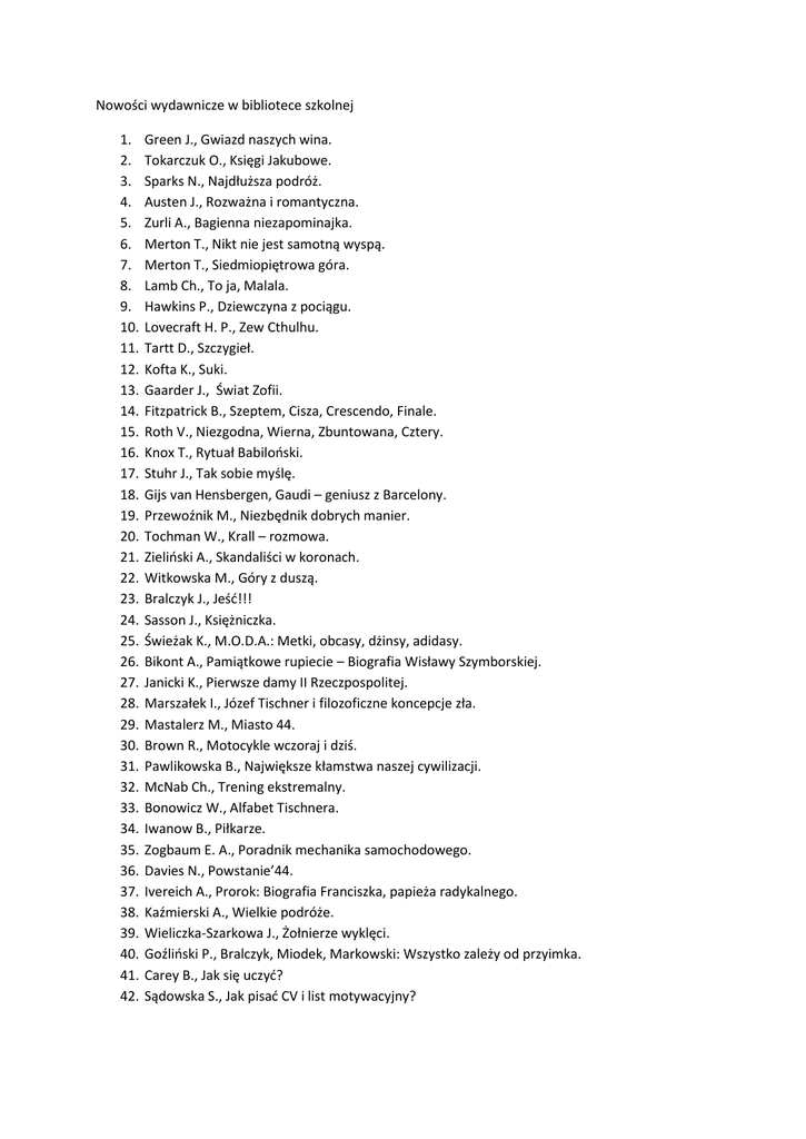 Nowości wydawnicze w bibliotece szkolnej 1. 2. 3. 4. 5. 6. 7. 8. 9. 10. 11. 12. 13. 14. 15. 16. 17. 18. 19. 20. 21. 22. 23. 24. 25. 26. 27. 28. 29. 30. 31. 32. 33. 34. 35. 36. 37. 38. 39. 40. 41. 42. Green J., Gwiazd naszych wina. Tokarczuk O., Księgi Jakubowe. Sparks N., Najdłuższa podróż. Austen J., Rozważna i romantyczna. Zurli A., Bagienna niezapominajka. Merton T., Nikt nie jest samotną wyspą. Merton T., Siedmiopiętrowa góra. Lamb Ch., To ja, Malala. Hawkins P., Dziewczyna z pociągu. Lovecraft H. P., Zew Cthulhu. Tartt D., Szczygieł. Kofta K., Suki. Gaarder J., Świat Zofii. Fitzpatrick B., Szeptem, Cisza, Crescendo, Finale. Roth V., Niezgodna, Wierna, Zbuntowana, Cztery. Knox T., Rytuał Babiloński. Stuhr J., Tak sobie myślę. Gijs van Hensbergen, Gaudi – geniusz z Barcelony. Przewoźnik M., Niezbędnik dobrych manier. Tochman W., Krall – rozmowa. Zieliński A., Skandaliści w koronach. Witkowska M., Góry z duszą. Bralczyk J., Jeść!!! Sasson J., Księżniczka. Świeżak K., M.O.D.A.: Metki, obcasy, dżinsy, adidasy. Bikont A., Pamiątkowe rupiecie – Biografia Wisławy Szymborskiej. Janicki K., Pierwsze damy II Rzeczpospolitej. Marszałek I., Józef Tischner i filozoficzne koncepcje zła. Mastalerz M., Miasto 44. Brown R., Motocykle wczoraj i dziś. Pawlikowska B., Największe kłamstwa naszej cywilizacji. McNab Ch., Trening ekstremalny. Bonowicz W., Alfabet Tischnera. Iwanow B., Piłkarze. Zogbaum E. A., Poradnik mechanika samochodowego. Davies N., Powstanie’44. Ivereich A., Prorok: Biografia Franciszka, papieża radykalnego. Kaźmierski A., Wielkie podróże. Wieliczka-Szarkowa J., Żołnierze wyklęci. Goźliński P., Bralczyk, Miodek, Markowski: Wszystko zależy od przyimka. Carey B., Jak się uczyć? Sądowska S., Jak pisać CV i list motywacyjny?