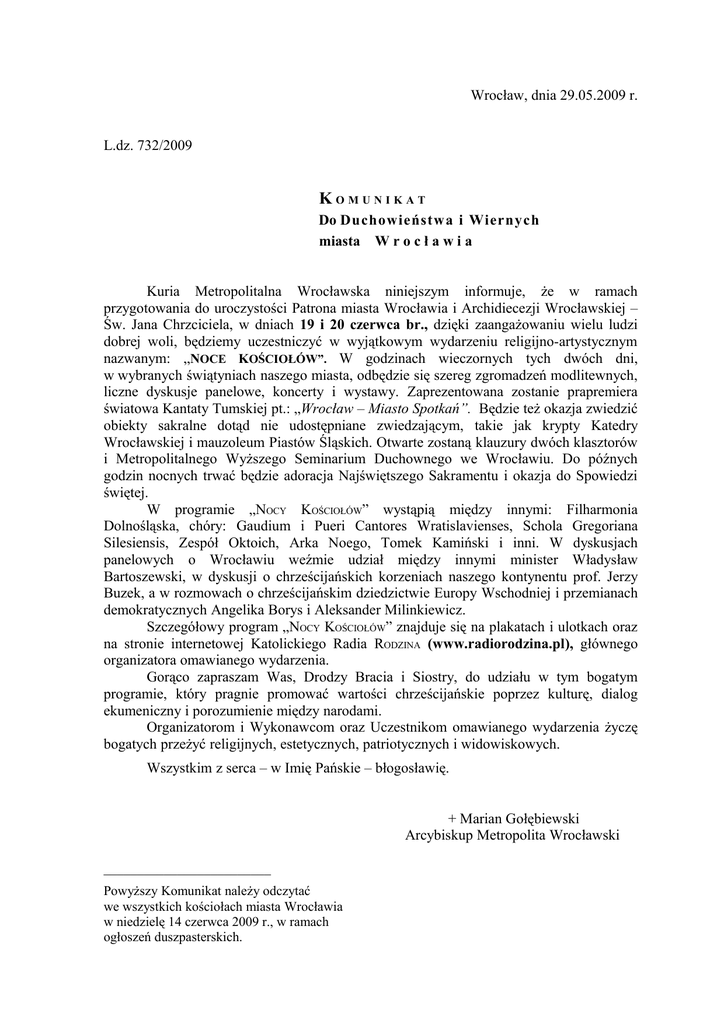Wrocław, dnia 29.05.2009 r. L.dz. 732/2009 KOMUNIKAT Do Duchowieństwa i Wiernych miasta W r o c ł a w i a Kuria Metropolitalna Wrocławska niniejszym informuje, że w ramach przygotowania do uroczystości Patrona miasta Wrocławia i Archidiecezji Wrocławskiej – Św. Jana Chrzciciela, w dniach 19 i 20 czerwca br., dzięki zaangażowaniu wielu ludzi dobrej woli, będziemy uczestniczyć w wyjątkowym wydarzeniu religijno-artystycznym nazwanym: „NOCE KOŚCIOŁÓW”. W godzinach wieczornych tych dwóch dni, w wybranych świątyniach naszego miasta, odbędzie się szereg zgromadzeń modlitewnych, liczne dyskusje panelowe, koncerty i wystawy. Zaprezentowana zostanie prapremiera światowa Kantaty Tumskiej pt.: „Wrocław – Miasto Spotkań”. Będzie też okazja zwiedzić obiekty sakralne dotąd nie udostępniane zwiedzającym, takie jak krypty Katedry Wrocławskiej i mauzoleum Piastów Śląskich. Otwarte zostaną klauzury dwóch klasztorów i Metropolitalnego Wyższego Seminarium Duchownego we Wrocławiu. Do późnych godzin nocnych trwać będzie adoracja Najświętszego Sakramentu i okazja do Spowiedzi świętej. W programie „NOCY KOŚCIOŁÓW” wystąpią między innymi: Filharmonia Dolnośląska, chóry: Gaudium i Pueri Cantores Wratislavienses, Schola Gregoriana Silesiensis, Zespół Oktoich, Arka Noego, Tomek Kamiński i inni. W dyskusjach panelowych o Wrocławiu weźmie udział między innymi minister Władysław Bartoszewski, w dyskusji o chrześcijańskich korzeniach naszego kontynentu prof. Jerzy Buzek, a w rozmowach o chrześcijańskim dziedzictwie Europy Wschodniej i przemianach demokratycznych Angelika Borys i Aleksander Milinkiewicz. Szczegółowy program „NOCY KOŚCIOŁÓW” znajduje się na plakatach i ulotkach oraz na stronie internetowej Katolickiego Radia RODZINA (www.radiorodzina.pl), głównego organizatora omawianego wydarzenia. Gorąco zapraszam Was, Drodzy Bracia i Siostry, do udziału w tym bogatym programie, który pragnie promować wartości chrześcijańskie poprzez kulturę, dialog ekumeniczny i porozumienie między narodami. Organizatorom i Wykonawcom oraz Uczestnikom omawianego wydarzenia życzę bogatych przeżyć religijnych, estetycznych, patriotycznych i widowiskowych. Wszystkim z serca – w Imię Pańskie – błogosławię. + Marian Gołębiewski Arcybiskup Metropolita Wrocławski _________________________ Powyższy Komunikat należy odczytać we wszystkich kościołach miasta Wrocławia w niedzielę 14 czerwca 2009 r., w ramach ogłoszeń duszpasterskich.