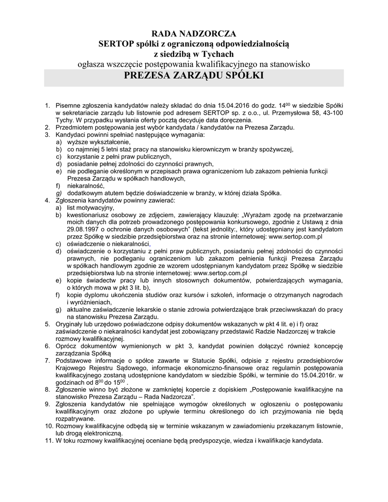 RADA NADZORCZA SERTOP spółki z ograniczoną odpowiedzialnością z siedzibą w Tychach ogłasza wszczęcie postępowania kwalifikacyjnego na stanowisko PREZESA ZARZĄDU SPÓŁKI 1. Pisemne zgłoszenia kandydatów należy składać do dnia 15.04.2016 do godz. 1400 w siedzibie Spółki w sekretariacie zarządu lub listownie pod adresem SERTOP sp. z o.o., ul. Przemysłowa 58, 43-100 Tychy. W przypadku wysłania oferty pocztą decyduje data doręczenia. 2. Przedmiotem postępowania jest wybór kandydata / kandydatów na Prezesa Zarządu. 3. Kandydaci powinni spełniać następujące wymagania: a) wyższe wykształcenie, b) co najmniej 5 letni staż pracy na stanowisku kierowniczym w branży spożywczej, c) korzystanie z pełni praw publicznych, d) posiadanie pełnej zdolności do czynności prawnych, e) nie podleganie określonym w przepisach prawa ograniczeniom lub zakazom pełnienia funkcji Prezesa Zarządu w spółkach handlowych, f) niekaralność, g) dodatkowym atutem będzie doświadczenie w branży, w której działa Spółka. 4. Zgłoszenia kandydatów powinny zawierać: a) list motywacyjny, b) kwestionariusz osobowy ze zdjęciem, zawierający klauzulę: „Wyrażam zgodę na przetwarzanie moich danych dla potrzeb prowadzonego postępowania konkursowego, zgodnie z Ustawą z dnia 29.08.1997 o ochronie danych osobowych” (tekst jednolity:, który udostępniany jest kandydatom przez Spółkę w siedzibie przedsiębiorstwa oraz na stronie internetowej: www.sertop.com.pl c) oświadczenie o niekaralności, d) oświadczenie o korzystaniu z pełni praw publicznych, posiadaniu pełnej zdolności do czynności prawnych, nie podleganiu ograniczeniom lub zakazom pełnienia funkcji Prezesa Zarządu w spółkach handlowym zgodnie ze wzorem udostępnianym kandydatom przez Spółkę w siedzibie przedsiębiorstwa lub na stronie internetowej: www.sertop.com.pl e) kopie świadectw pracy lub innych stosownych dokumentów, potwierdzających wymagania, o których mowa w pkt 3 lit. b), f) kopie dyplomu ukończenia studiów oraz kursów i szkoleń, informacje o otrzymanych nagrodach i wyróżnieniach, g) aktualne zaświadczenie lekarskie o stanie zdrowia potwierdzające brak przeciwwskazań do pracy na stanowisku Prezesa Zarządu. 5. Oryginały lub urzędowo poświadczone odpisy dokumentów wskazanych w pkt 4 lit. e) i f) oraz zaświadczenie o niekaralności kandydat jest zobowiązany przedstawić Radzie Nadzorczej w trakcie rozmowy kwalifikacyjnej. 6. Oprócz dokumentów wymienionych w pkt 3, kandydat powinien dołączyć również koncepcję zarządzania Spółką 7. Podstawowe informacje o spółce zawarte w Statucie Spółki, odpisie z rejestru przedsiębiorców Krajowego Rejestru Sądowego, informacje ekonomiczno-finansowe oraz regulamin postępowania kwalifikacyjnego zostaną udostępnione kandydatom w siedzibie Spółki, w terminie do 15.04.2016r. w godzinach od 800 do 1500 . 8. Zgłoszenie winno być złożone w zamkniętej kopercie z dopiskiem „Postępowanie kwalifikacyjne na stanowisko Prezesa Zarządu – Rada Nadzorcza”. 9. Zgłoszenia kandydatów nie spełniające wymogów określonych w ogłoszeniu o postępowaniu kwalifikacyjnym oraz złożone po upływie terminu określonego do ich przyjmowania nie będą rozpatrywane. 10. Rozmowy kwalifikacyjne odbędą się w terminie wskazanym w zawiadomieniu przekazanym listownie, lub drogą elektroniczną. 11. W toku rozmowy kwalifikacyjnej oceniane będą predyspozycje, wiedza i kwalifikacje kandydata. 12. W wyniku postępowania kwalifikacyjnego Rada Nadzorcza wybierze od 1 do 5 kandydatów, spośród których Zgromadzenie Wspólników wybierze Prezesa Zarządu Spółki. 13. O wyniku rozmów kwalifikacyjnych Rada Nadzorcza powiadomi kandydatów listownie. 14. Regulamin postępowania kwalifikacyjnego na Prezesa Zarządu dostępny jest w siedzibie Spółki i na stronie internetowej: www.sertop.com.pl