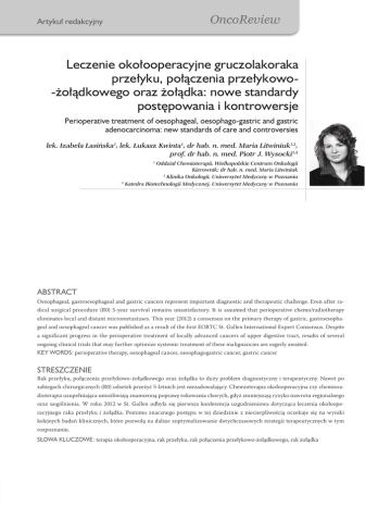 Artykuł redakcyjny Leczenie okołooperacyjne gruczolakoraka przełyku, połączenia przełykowo-żołądkowego oraz żołądka: nowe standardy postępowania i kontrowersje Perioperative treatment of oesophageal, oesophago-gastric and gastric adenocarcinoma: new standards of care and controversies lek. Izabela Łasińska1, lek. Łukasz Kwinta1, dr hab. n. med. Maria Litwiniuk1,2, prof. dr hab. n. med. Piotr J. Wysocki1,3 Oddział Chemioterapii, Wielkopolskie Centrum Onkologii Kierownik: dr hab. n. med. Maria Litwiniuk 2 Klinika Onkologii, Uniwersytet Medyczny w Poznaniu 3 Katedra Biotechnologii Medycznej, Uniwersytet Medyczny w Poznaniu 1 Abstract Oesophageal, gastroesophageal and gastric cancers represent important diagnostic and therapeutic challenge. Even after radical surgical procedure (R0) 5-year survival remains unsatisfactory. It is assumed that perioperative chemo/radiotherapy eliminates local and distant micrometastases. This year (2012) a consensus on the primary therapy of gastric, gastroesophageal and oesophageal cancer was published as a result of the first EORTC St. Gallen International Expert Consensus. Despite a significant progress in the perioperative treatment of locally advanced cancers of upper digestive tract, results of several ongoing clinical trials that may further optimize systemic treatment of these malignancies are eagerly awaited. Key words: perioperative therapy, oesophageal cancer, oesophagogastric cancer, gastric cancer Streszczenie Rak przełyku, połączenia przełykowo-żołądkowego oraz żołądka to duży problem diagnostyczny i terapeutyczny. Nawet po zabiegach chirurgicznych (R0) odsetek przeżyć 5-letnich jest niezadowalający. Chemioterapia okołooperacyjna czy chemioradioterapia uzupełniająca umożliwiają znamienną poprawę rokowania chorych, gdyż zmniejszają ryzyko nawrotu regionalnego oraz uogólnienia. W roku 2012 w St. Gallen odbyła się pierwsza konferencja uzgodnieniowa dotycząca leczenia okołooperacyjnego raka przełyku i żołądka. Pomimo znacznego postępu w tej dziedzinie z niecierpliwością oczekuje się na wyniki kolejnych badań klinicznych, które pozwolą na dalsze zoptymalizowanie dotychczasowych strategii terapeutycznych w tym rozpoznaniu. Słowa kluczowe: terapia okołooperacyjna, rak przełyku, rak połączenia przełykowo-żołądkowego, rak żołądka